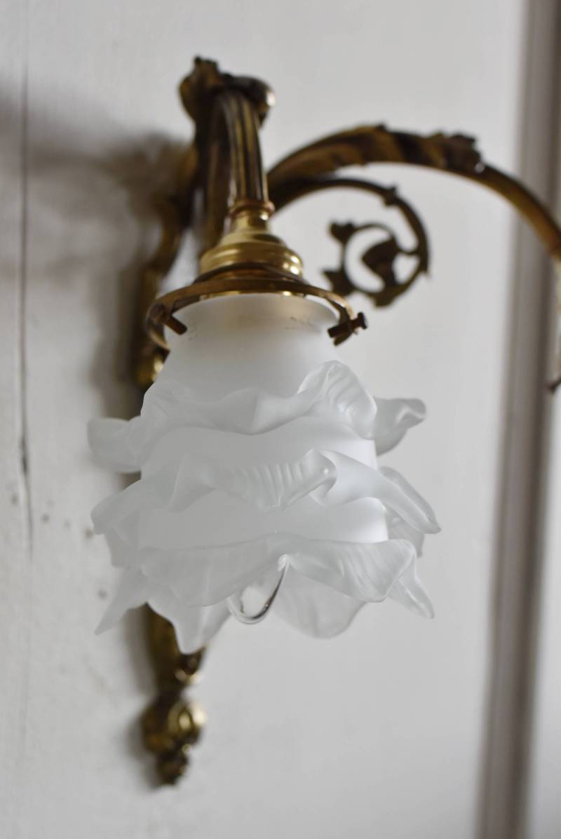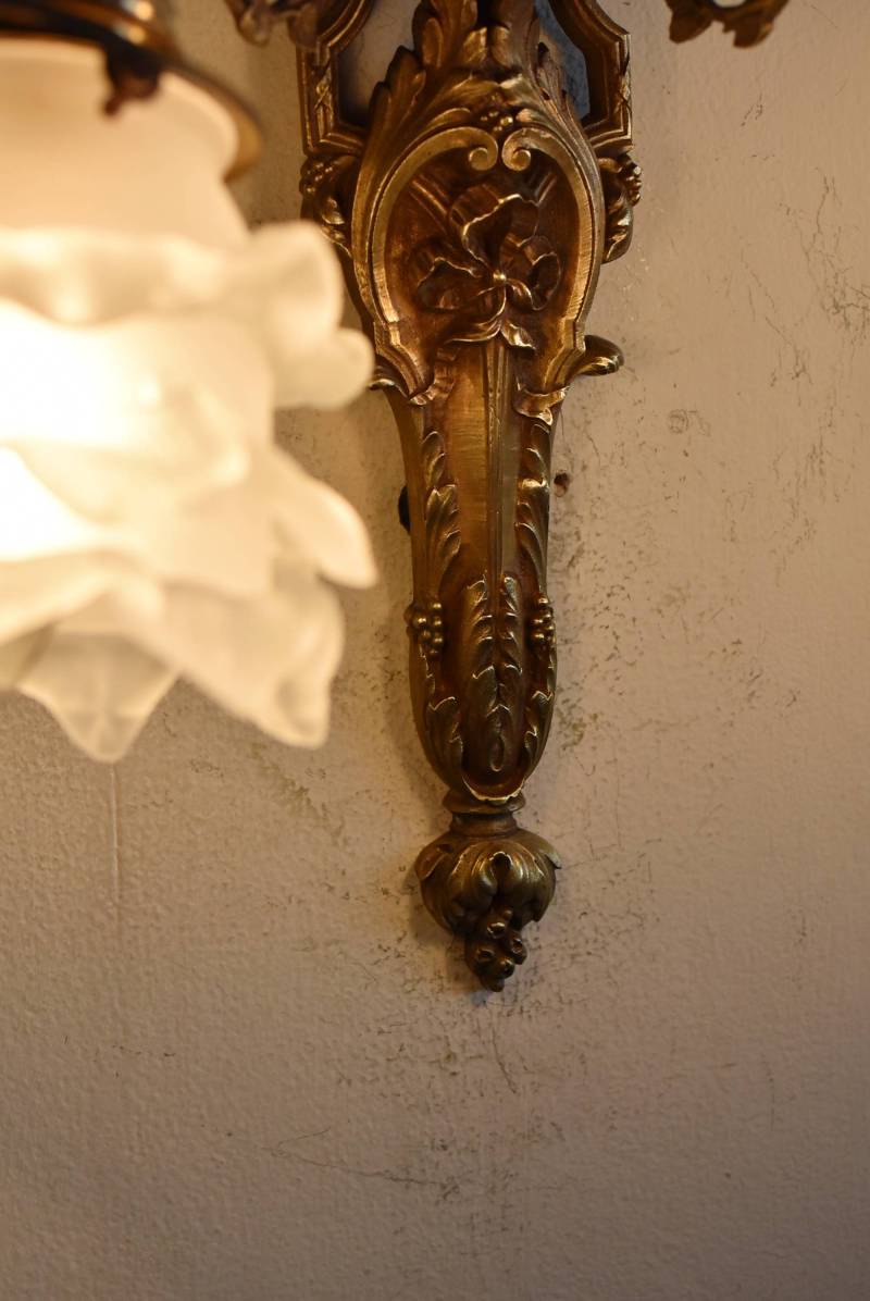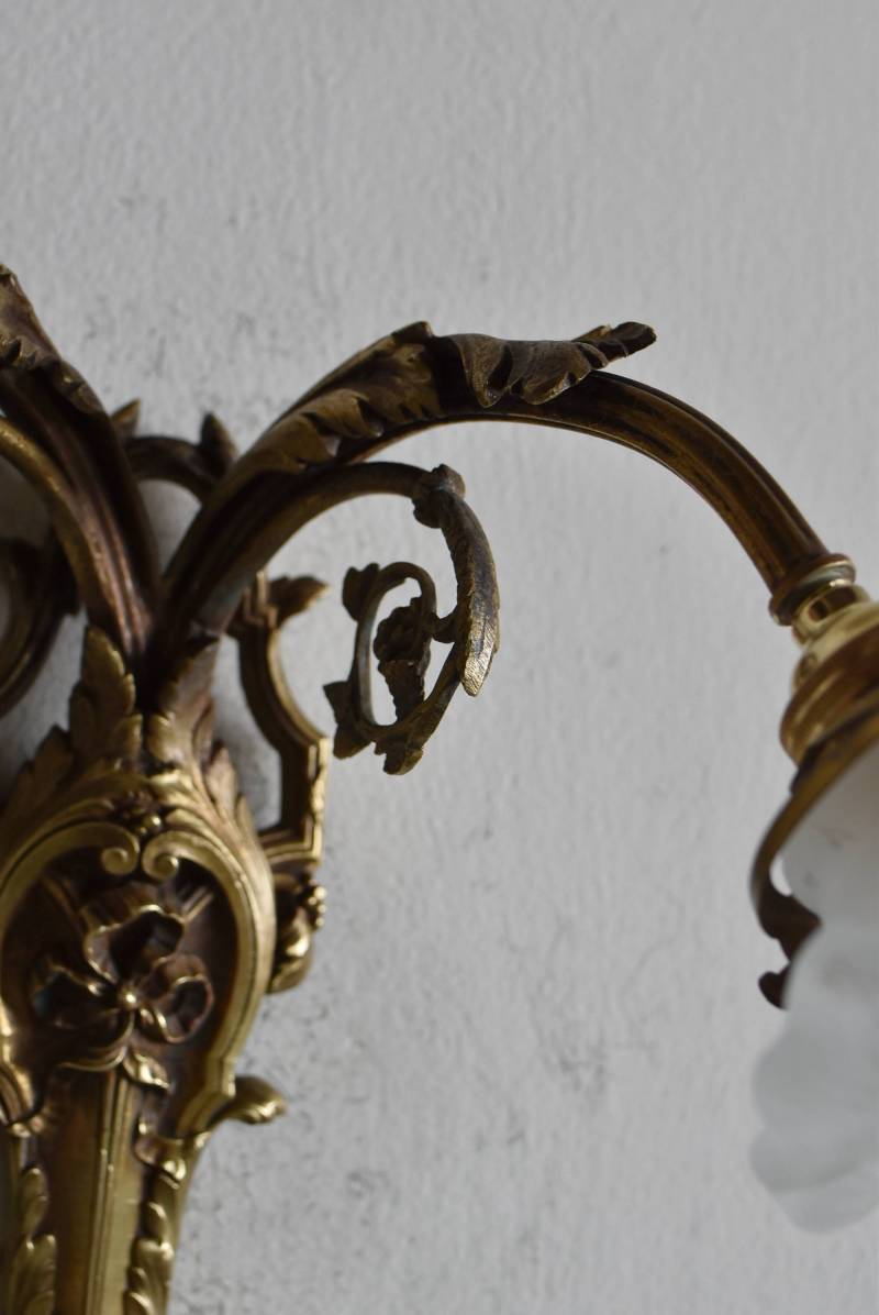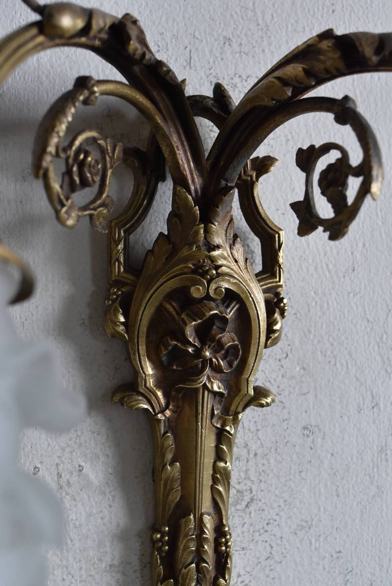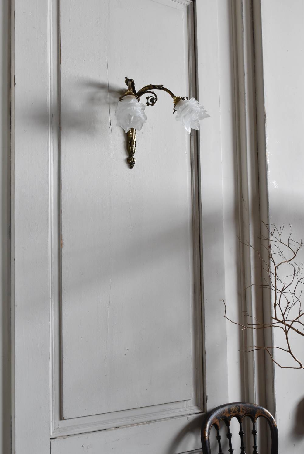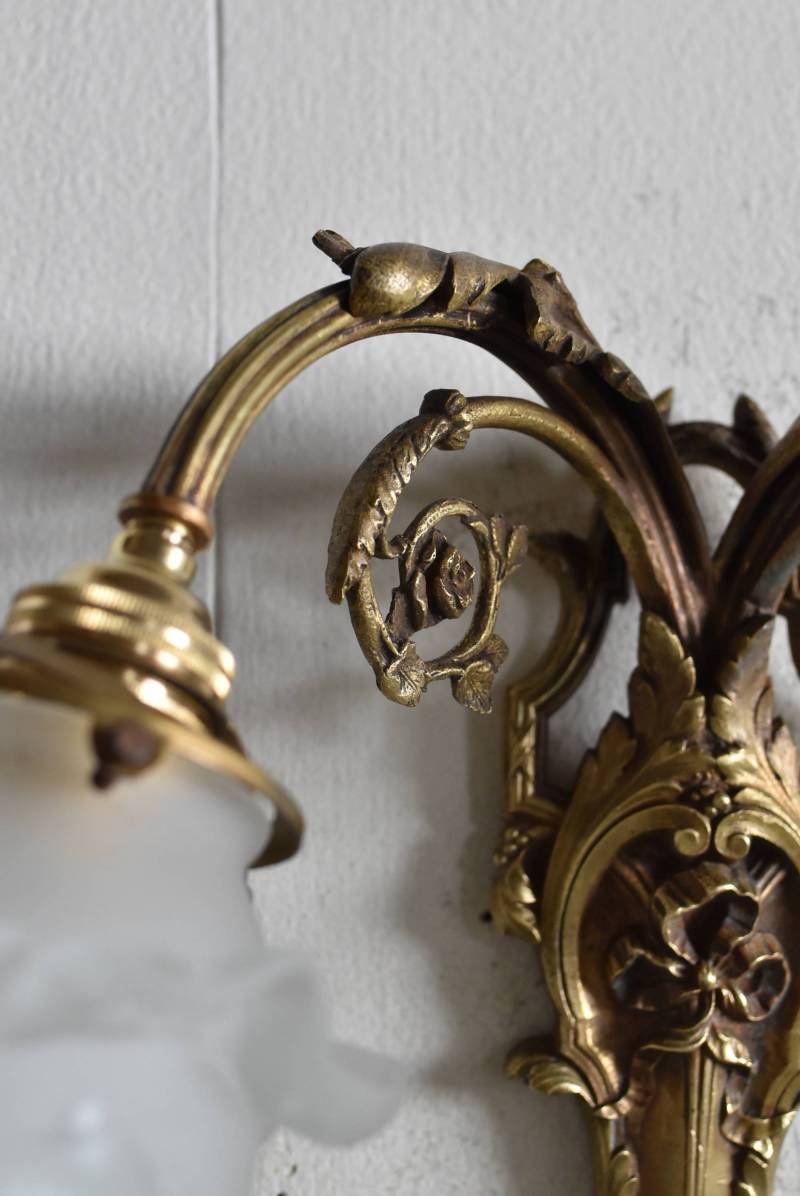フランスの2灯ウォールランプ。 厚さのある半透明のガラスシェードと、深みを増した色合いが風格のあるブロンズ製の土台が合わさり、2灯の大きく広がったシルエットによって壁面を華やかに彩ってくれそうです。リボンや植物モチーフの立体的なデザインは繊細で躍動感も感じられ、蔦がくるんと巻かれた様子やお花がそっと咲いている姿が優雅な雰囲気を演出してくれます。 古いものですのでガラスに小さなカケが見受けられます。ソケット・コードは新しいものに交換済みです。取り付けの際は配線工事が必要です。 壁に取り付ける為の金具や電球は付属しません。 W 約36cm D 約23cm H 約29cm 土台のみW 約7.5cm ガラスシェード直径 約10.5cm 重量 約1.5kg 電球口径 E17 *40W以下をご使用下さい。 40W×2灯=80W