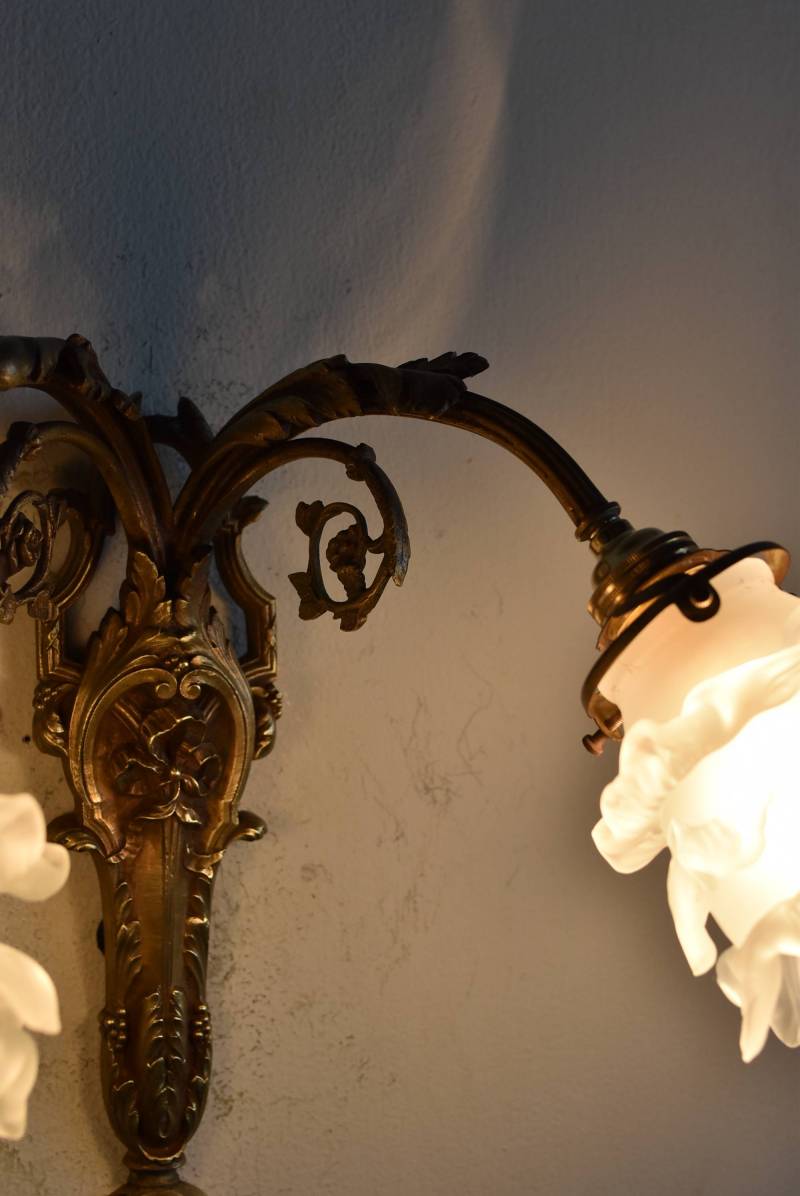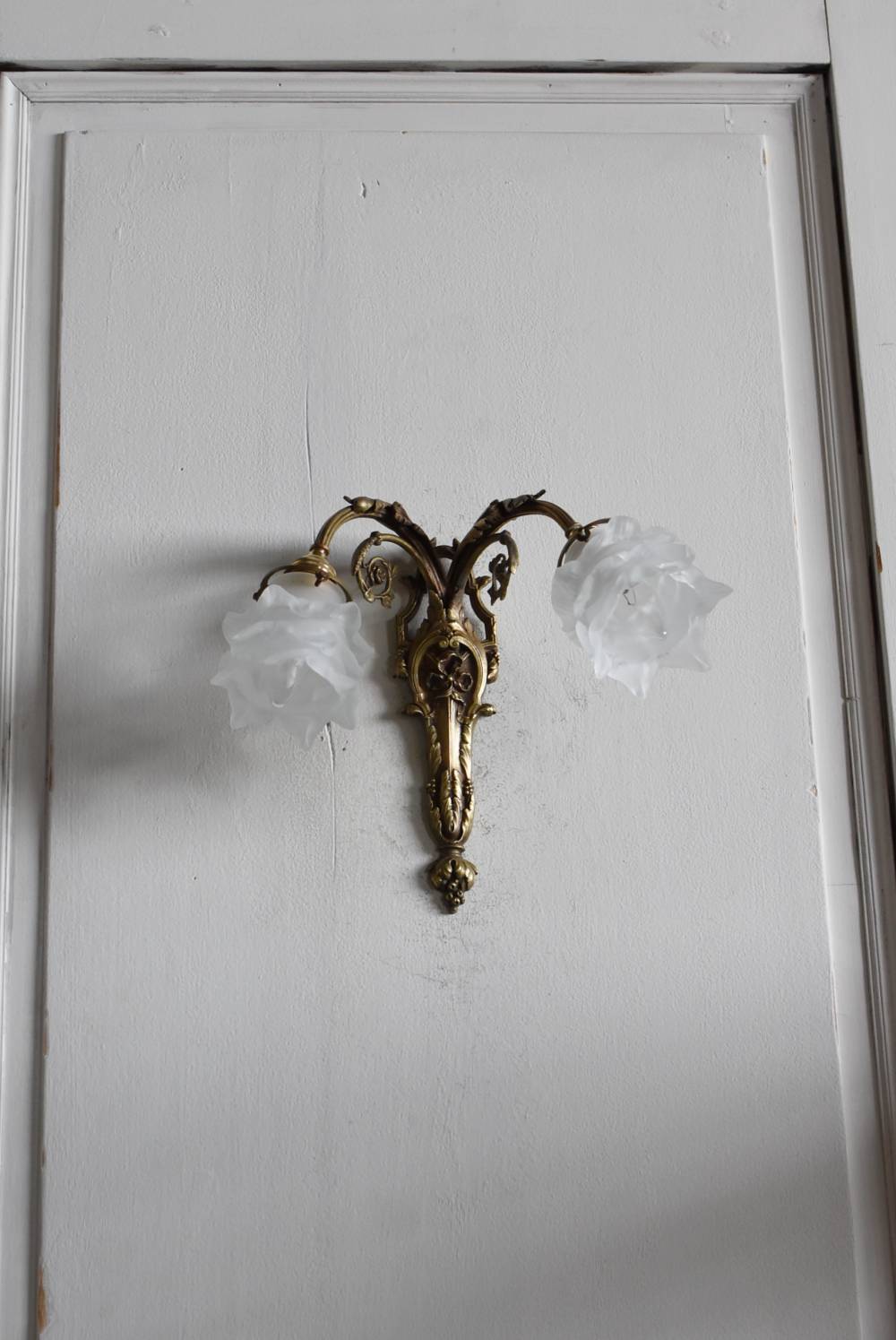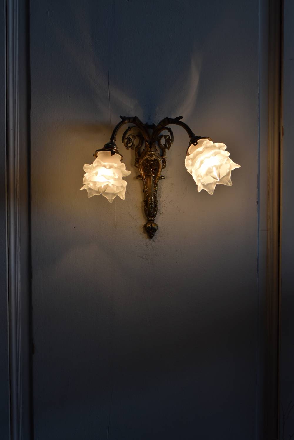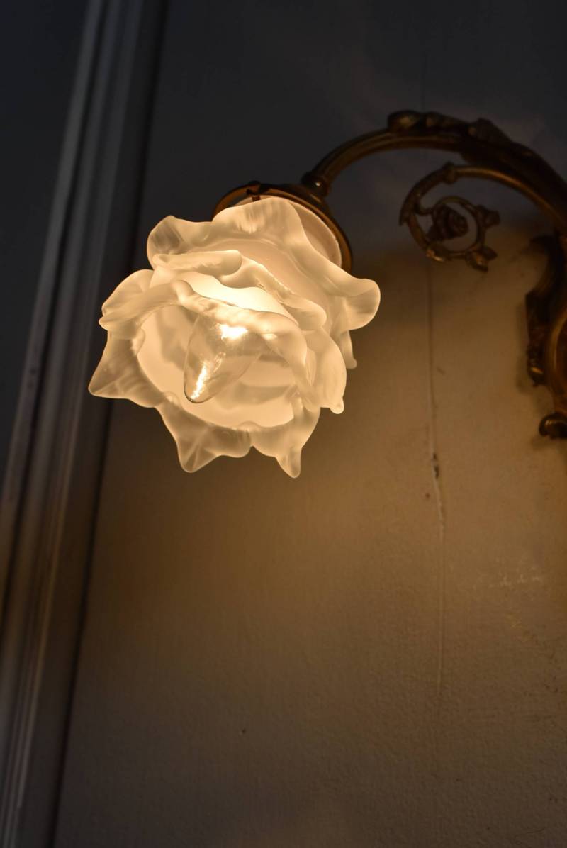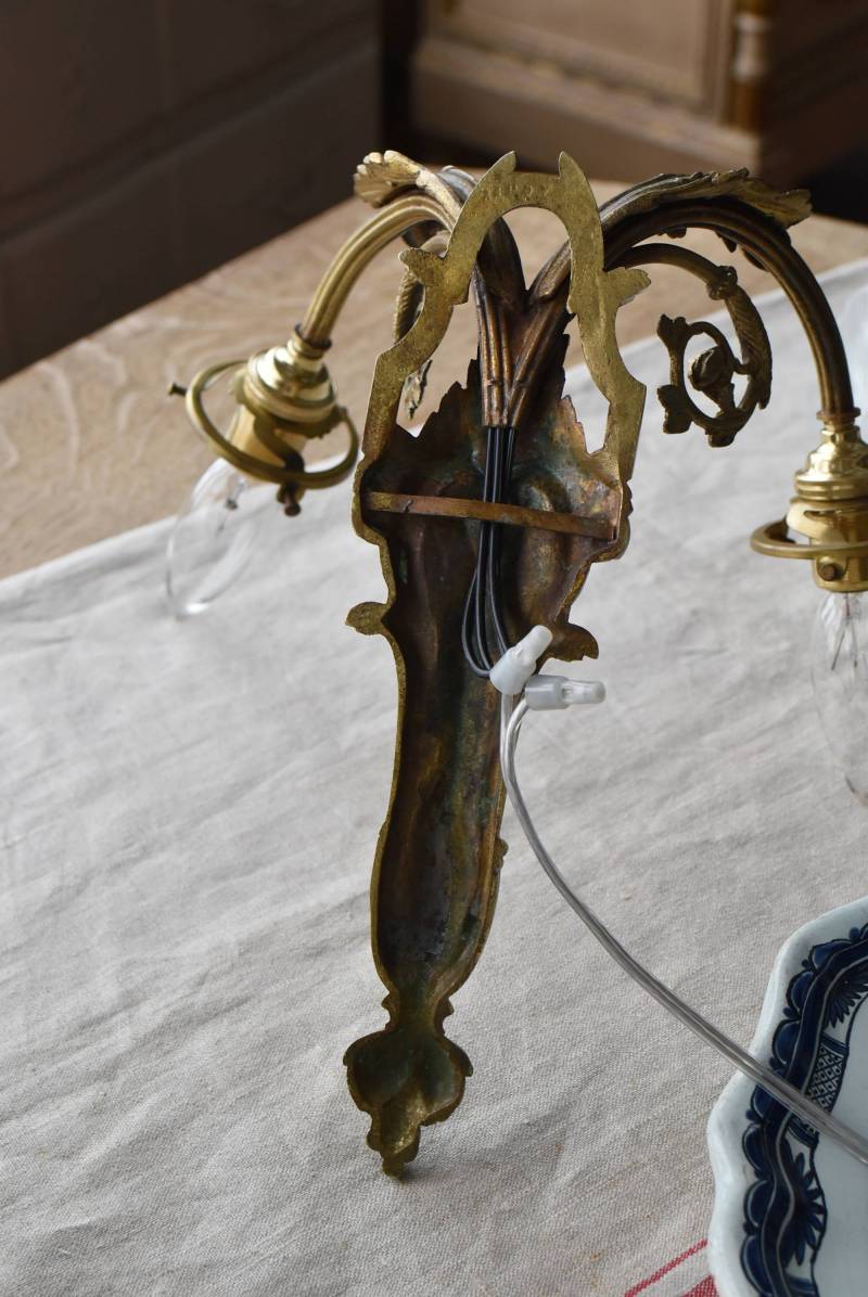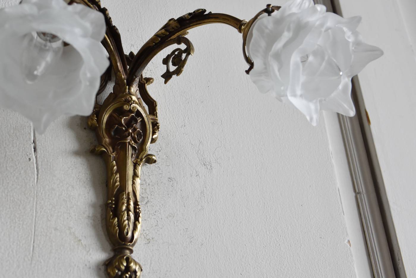 フランスの2灯ウォールランプ。 厚さのある半透明のガラスシェードと、深みを増した色合いが風格のあるブロンズ製の土台が合わさり、2灯の大きく広がったシルエットによって壁面を華やかに彩ってくれそうです。リボンや植物モチーフの立体的なデザインは繊細で躍動感も感じられ、蔦がくるんと巻かれた様子やお花がそっと咲いている姿が優雅な雰囲気を演出してくれます。 古いものですのでガラスに小さなカケが見受けられます。ソケット・コードは新しいものに交換済みです。取り付けの際は配線工事が必要です。 壁に取り付ける為の金具や電球は付属しません。 W 約36cm D 約23cm H 約29cm 土台のみW 約7.5cm ガラスシェード直径 約10.5cm 重量 約1.5kg 電球口径 E17 *40W以下をご使用下さい。 40W×2灯=80W