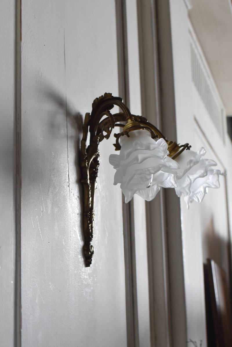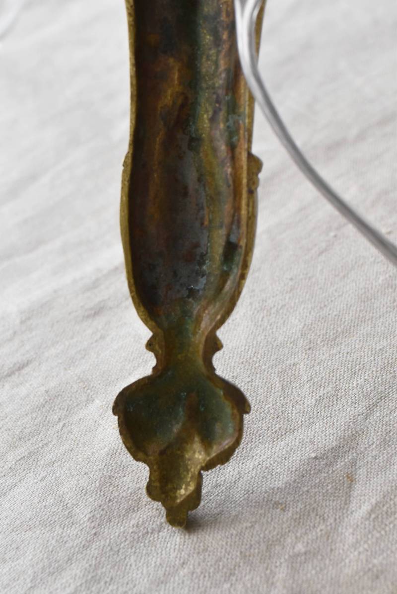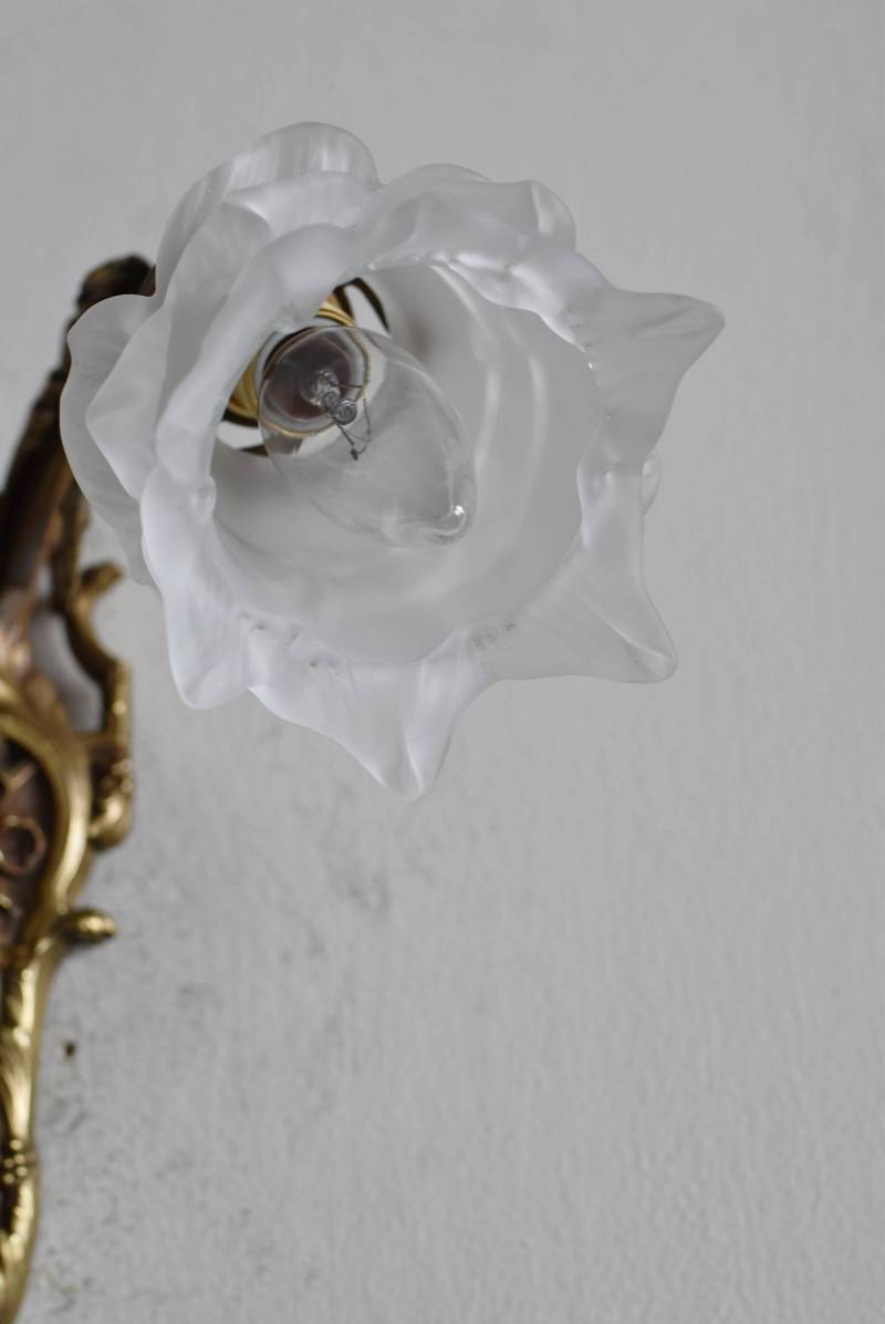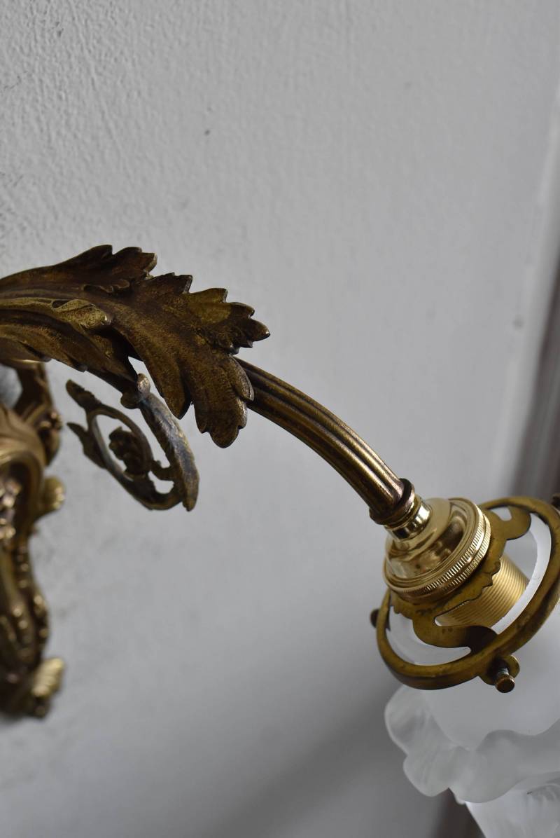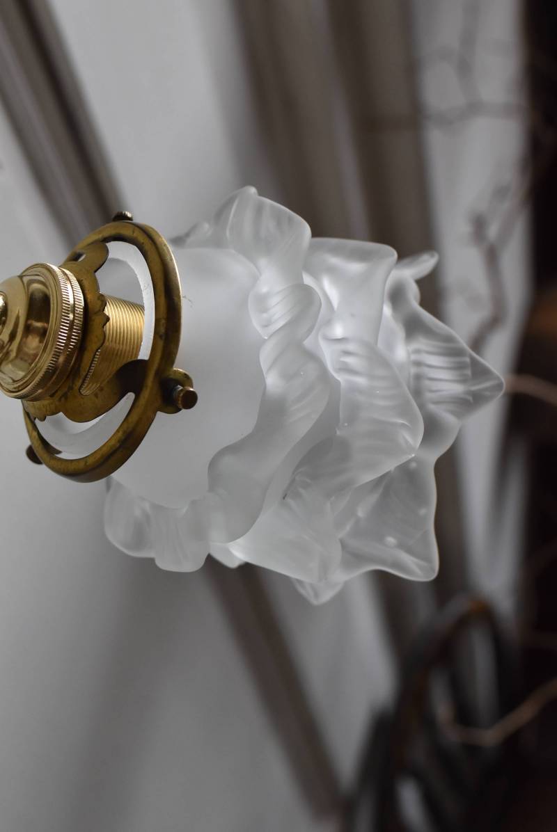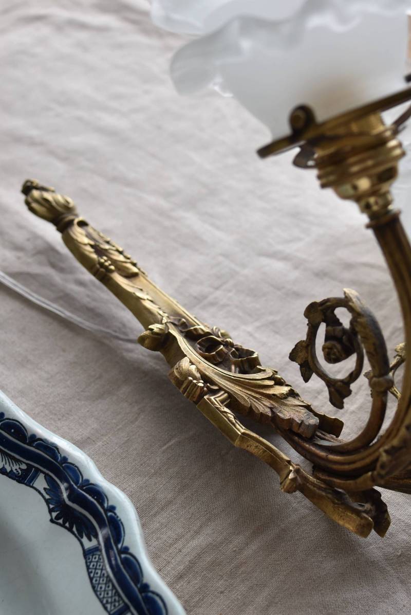 フランスの2灯ウォールランプ。 厚さのある半透明のガラスシェードと、深みを増した色合いが風格のあるブロンズ製の土台が合わさり、2灯の大きく広がったシルエットによって壁面を華やかに彩ってくれそうです。リボンや植物モチーフの立体的なデザインは繊細で躍動感も感じられ、蔦がくるんと巻かれた様子やお花がそっと咲いている姿が優雅な雰囲気を演出してくれます。 古いものですのでガラスに小さなカケが見受けられます。ソケット・コードは新しいものに交換済みです。取り付けの際は配線工事が必要です。 壁に取り付ける為の金具や電球は付属しません。 W 約36cm D 約23cm H 約29cm 土台のみW 約7.5cm ガラスシェード直径 約10.5cm 重量 約1.5kg 電球口径 E17 *40W以下をご使用下さい。 40W×2灯=80W