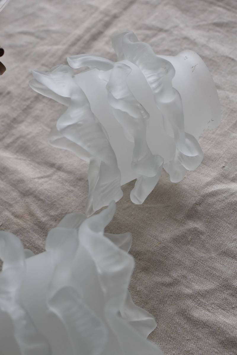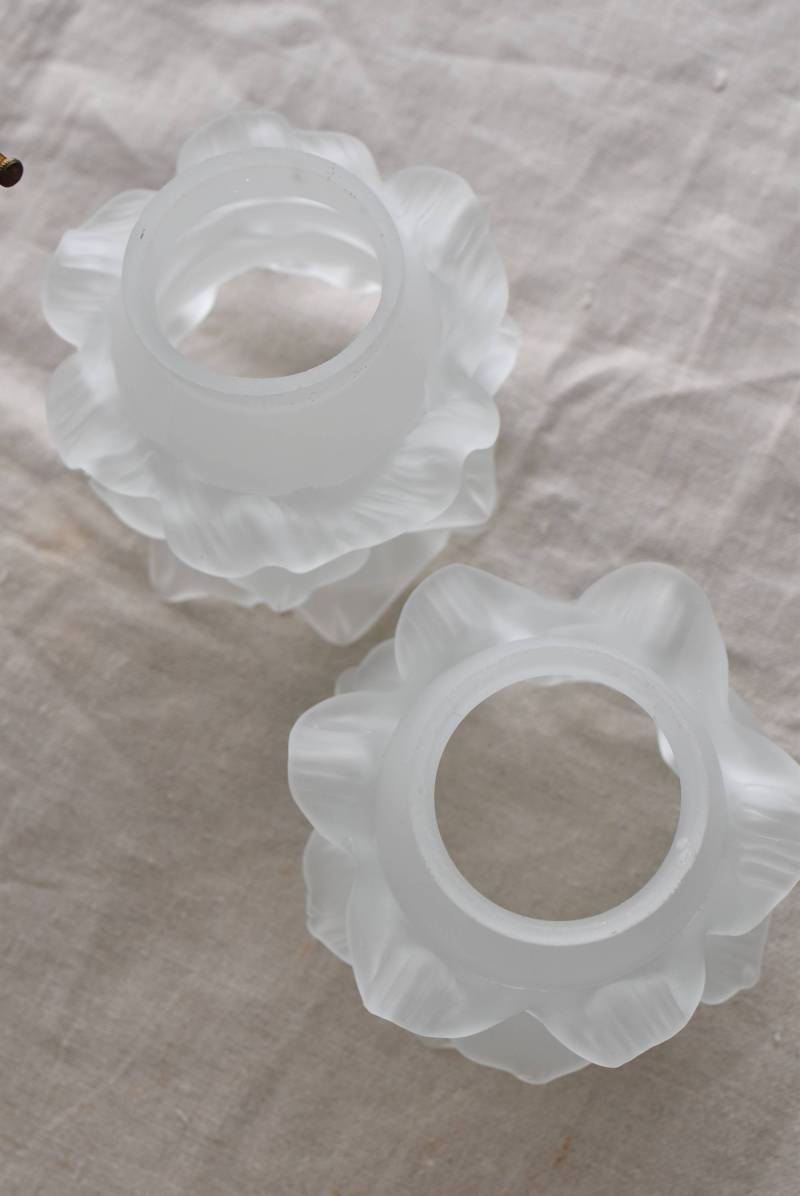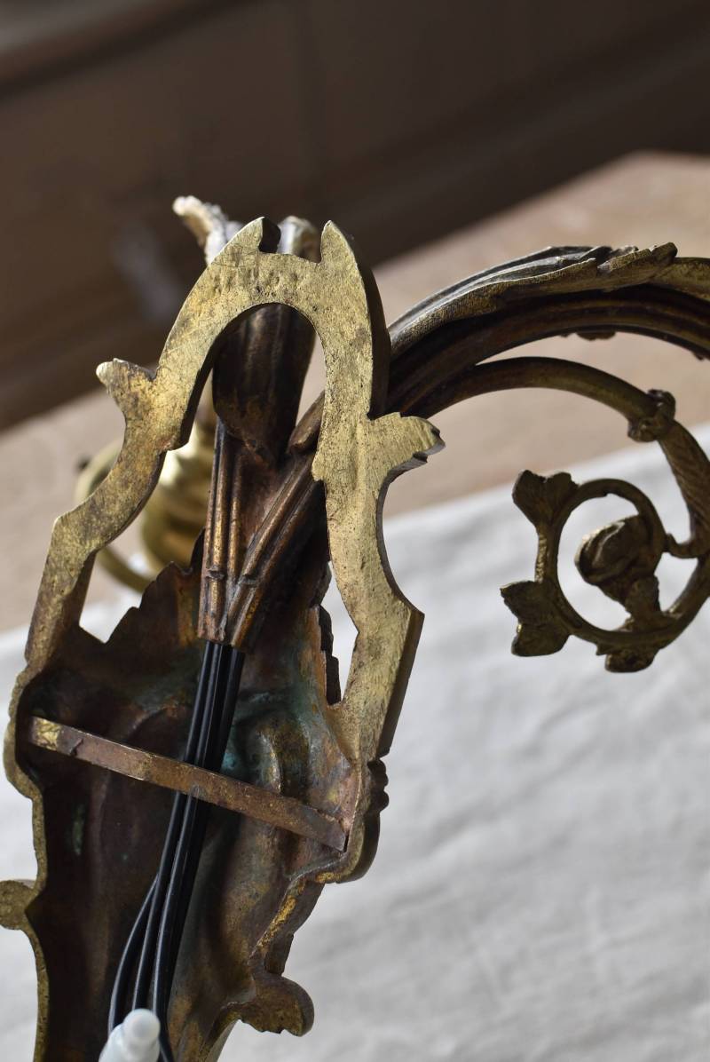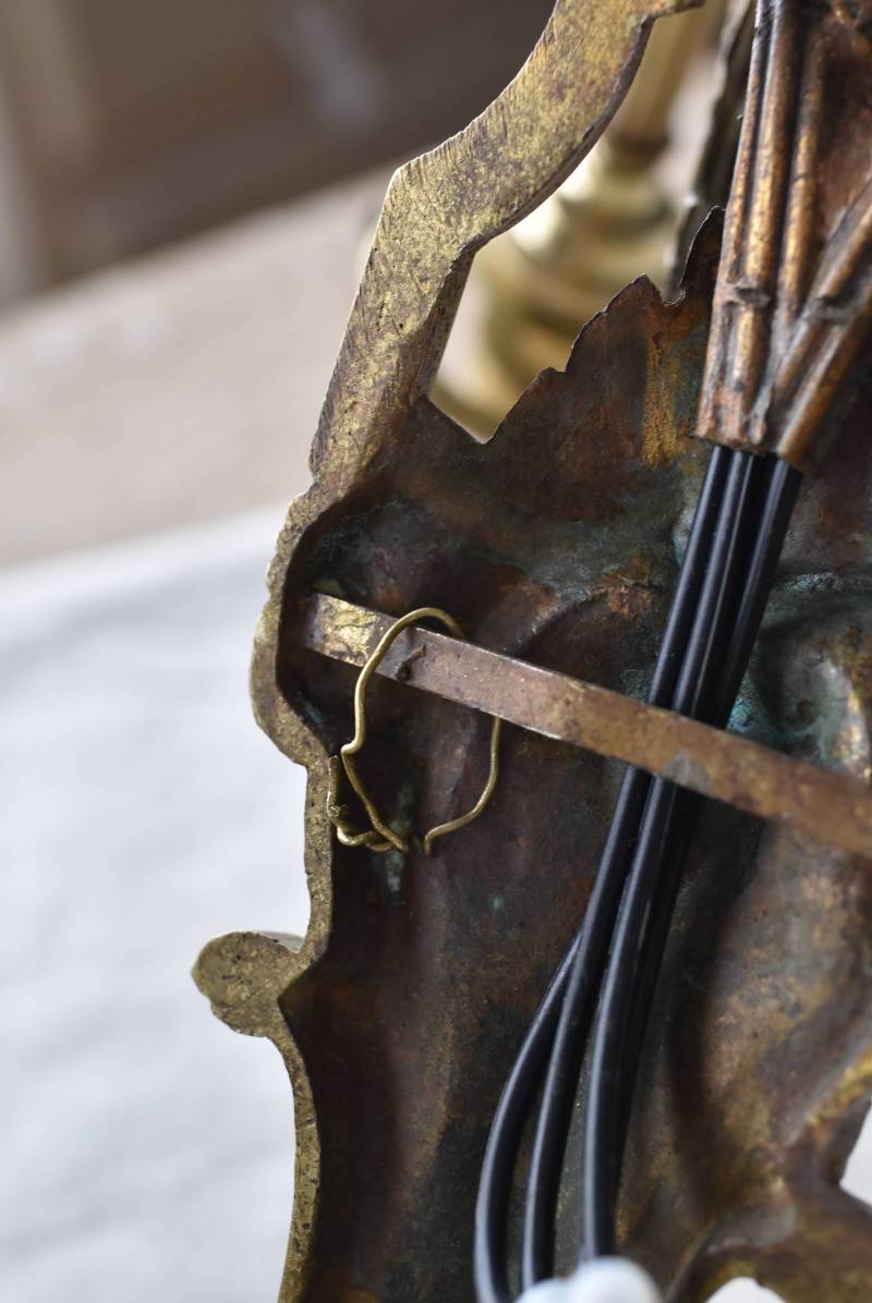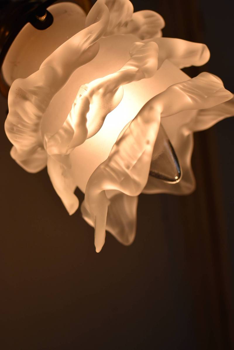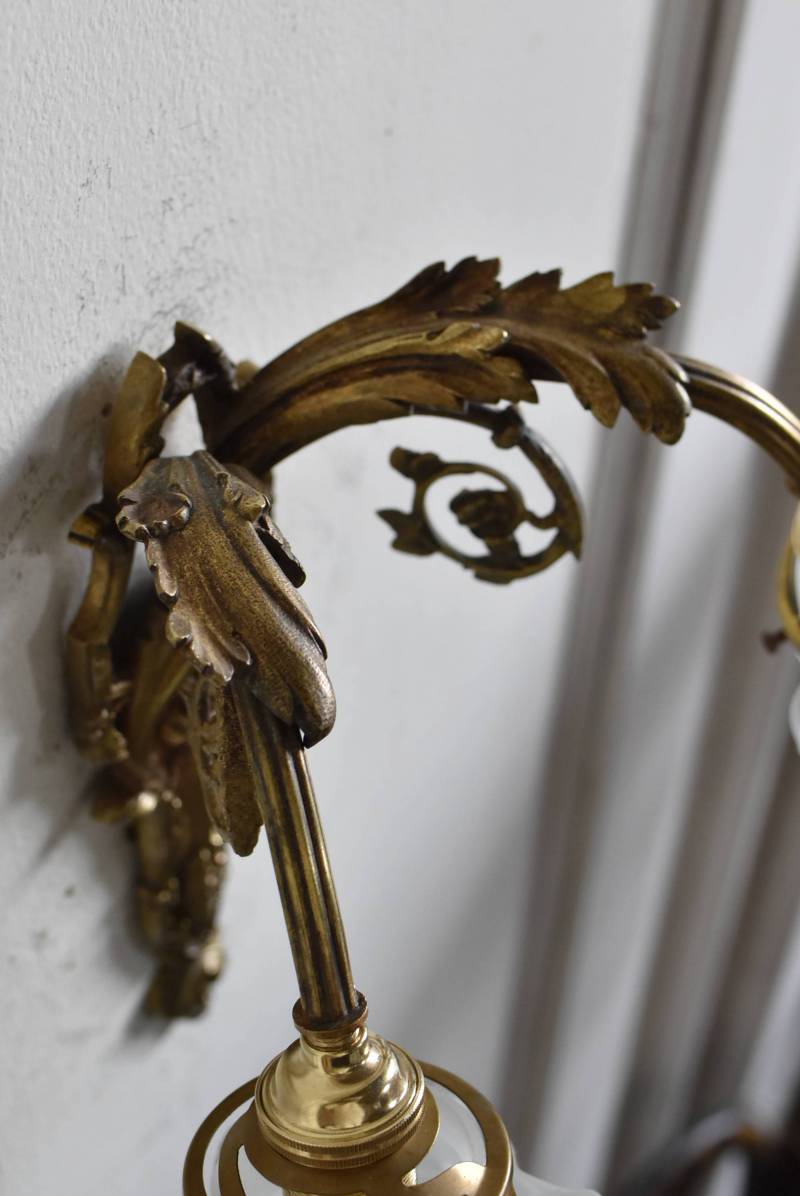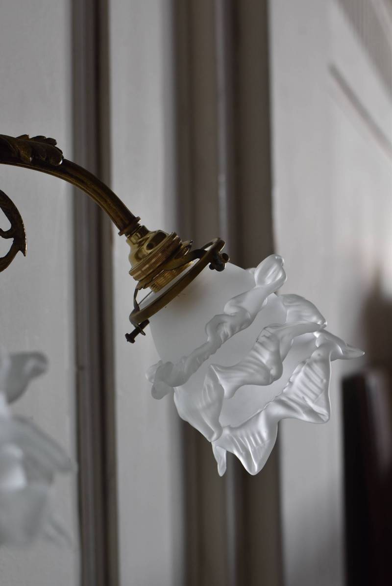フランスの2灯ウォールランプ。 厚さのある半透明のガラスシェードと、深みを増した色合いが風格のあるブロンズ製の土台が合わさり、2灯の大きく広がったシルエットによって壁面を華やかに彩ってくれそうです。リボンや植物モチーフの立体的なデザインは繊細で躍動感も感じられ、蔦がくるんと巻かれた様子やお花がそっと咲いている姿が優雅な雰囲気を演出してくれます。 古いものですのでガラスに小さなカケが見受けられます。ソケット・コードは新しいものに交換済みです。取り付けの際は配線工事が必要です。 壁に取り付ける為の金具や電球は付属しません。 W 約36cm D 約23cm H 約29cm 土台のみW 約7.5cm ガラスシェード直径 約10.5cm 重量 約1.5kg 電球口径 E17 *40W以下をご使用下さい。 40W×2灯=80W