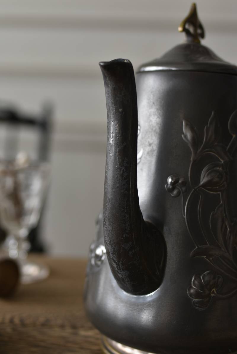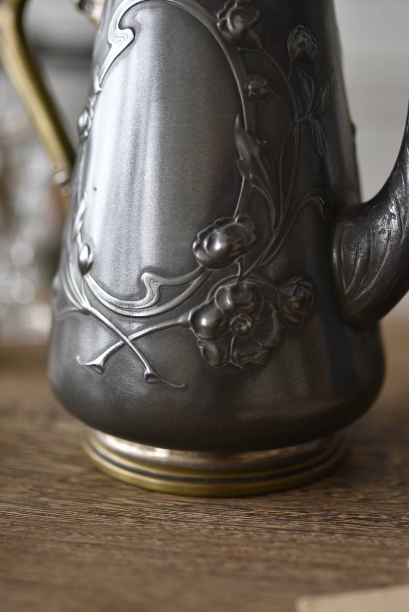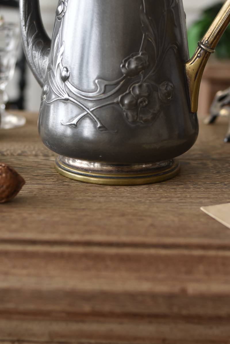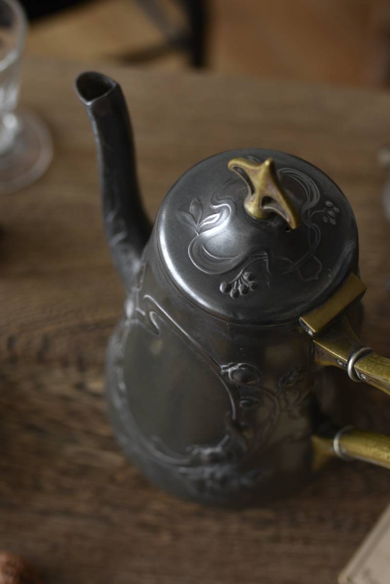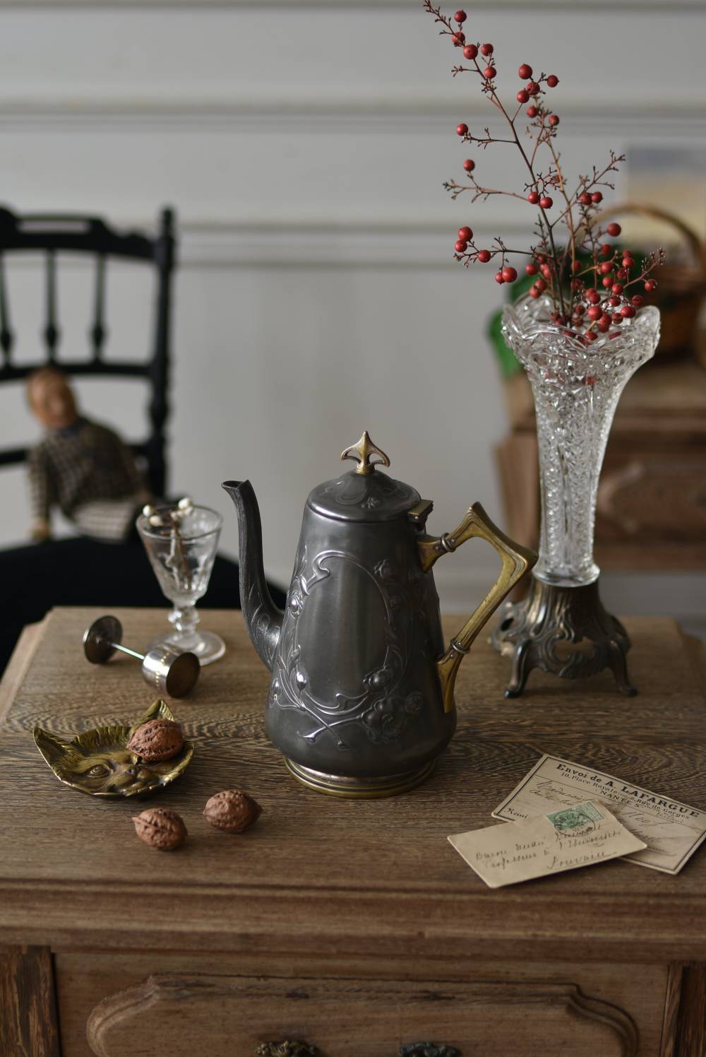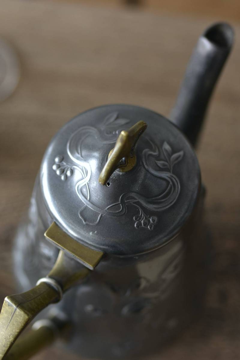 ドイツのメーカー『WMF』のコーヒーポット。 深いグレーの色味とマットな質感が特徴的なエタン(錫)製ボディがかっこいい印象の佇まい。表面には植物を模した流麗なラインのレリーフ装飾があしらわれ、優雅な装いが楽しめる気品高いデザインです。シルバーコーティングされていた部分は年月と共に薄れて下地の真鍮が顔を出しており、その配色が唯一無二の個性的な装いに。 どこか重厚さを感じられる一品で、シックなテーブルコーディネートを楽しめる雰囲気たっぷりのアイテムです。 W 約20cm D 約12cm H 約21.5cm 口径 約5.5cm
