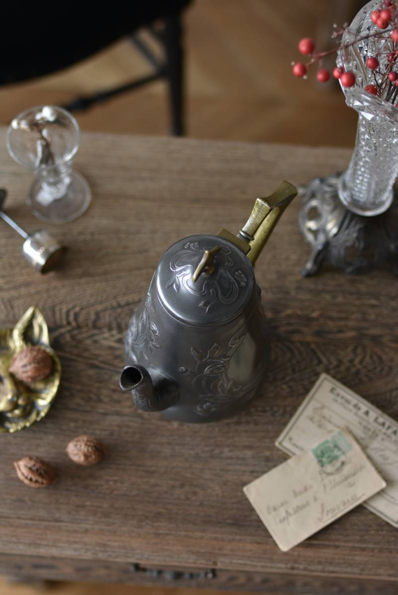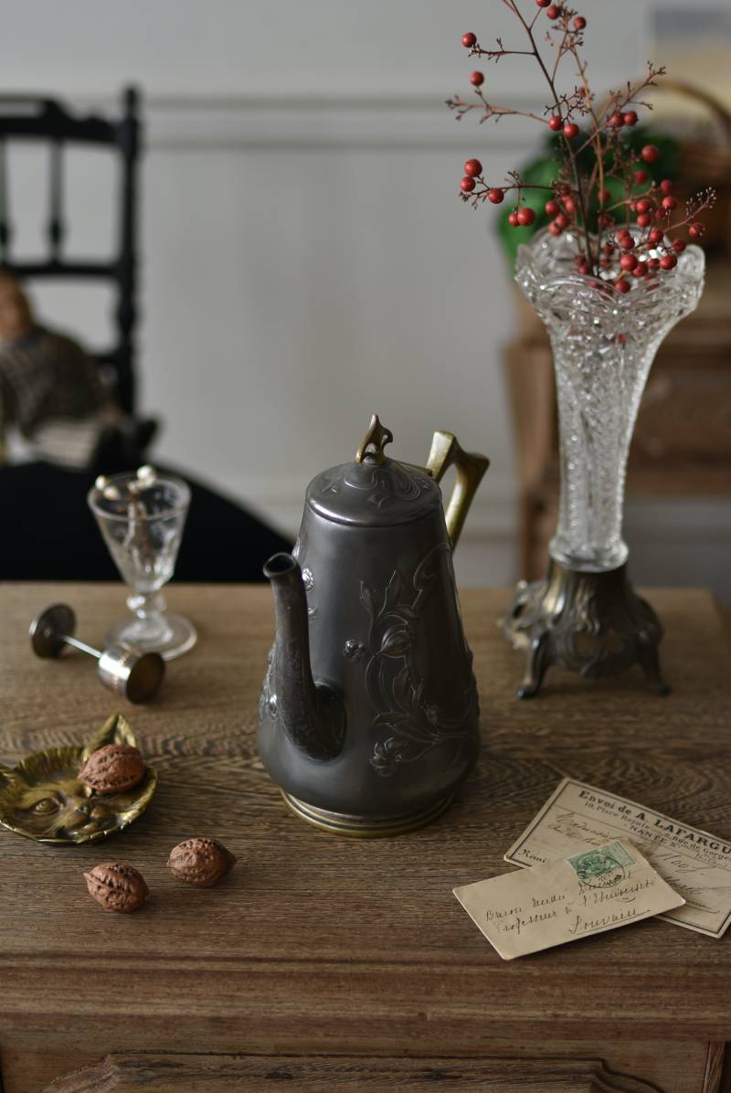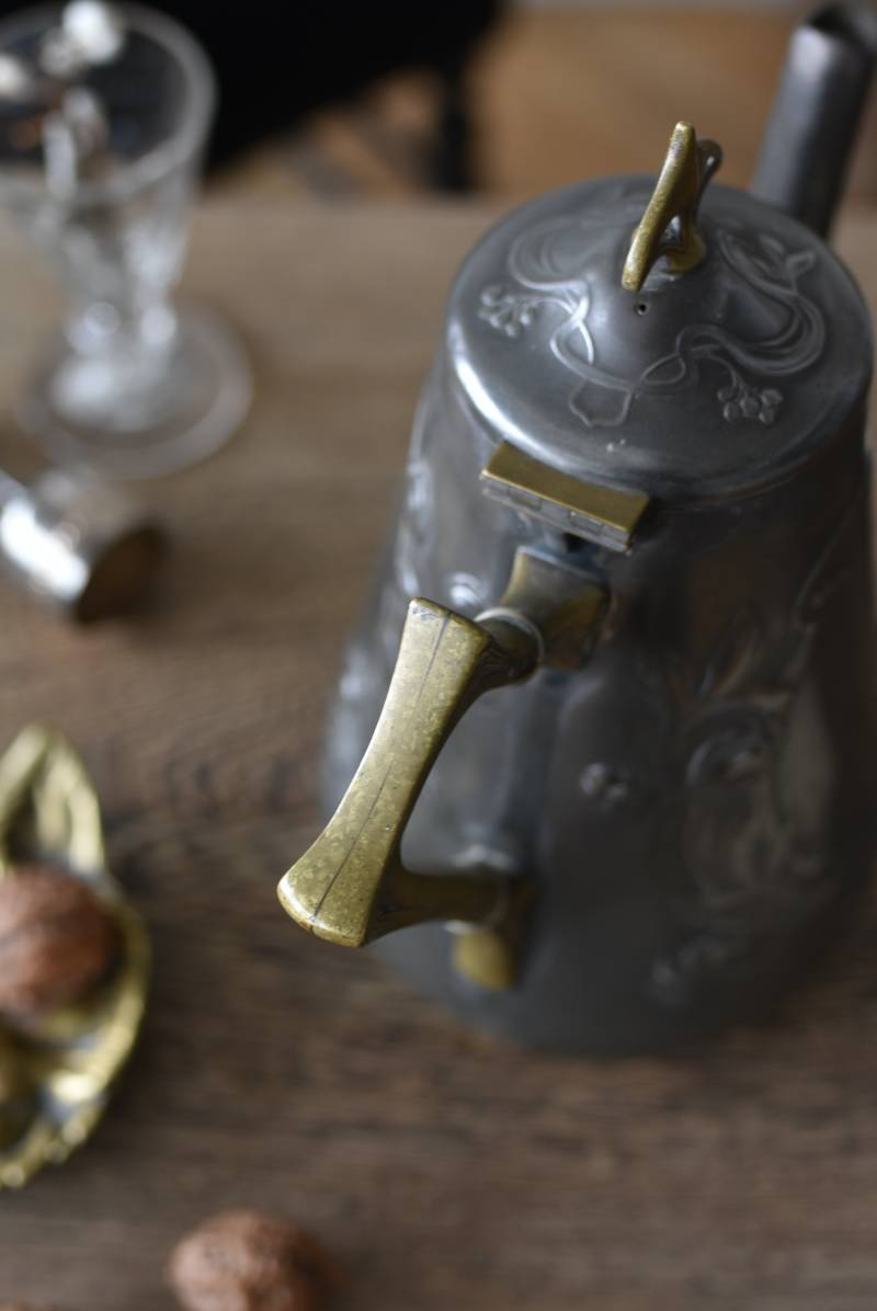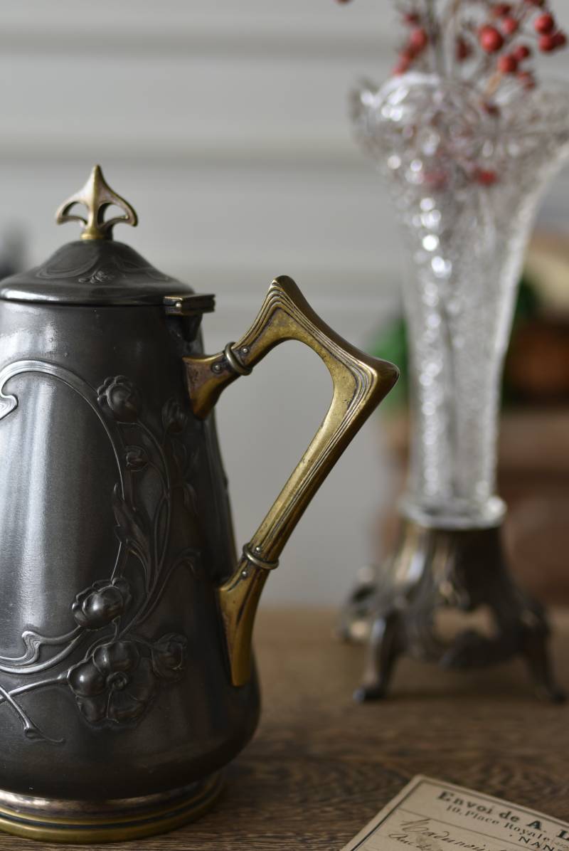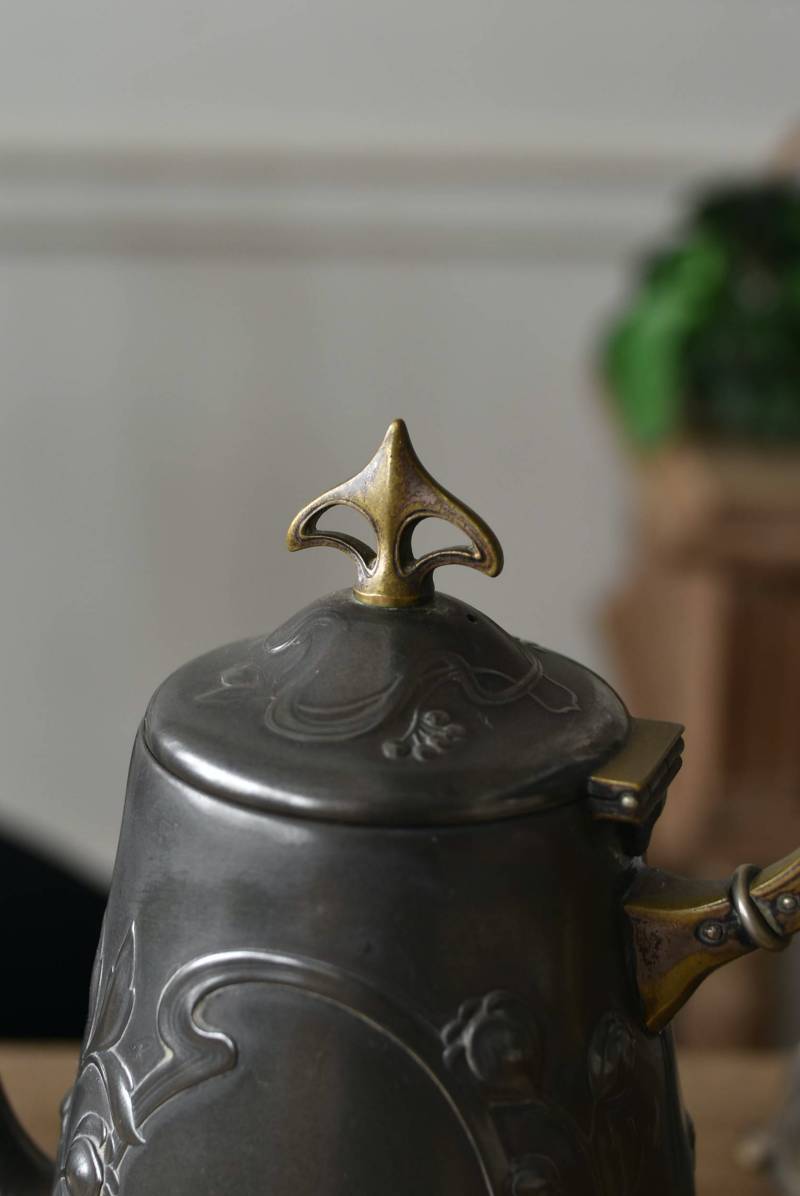 ドイツのメーカー『WMF』のコーヒーポット。 深いグレーの色味とマットな質感が特徴的なエタン(錫)製ボディがかっこいい印象の佇まい。表面には植物を模した流麗なラインのレリーフ装飾があしらわれ、優雅な装いが楽しめる気品高いデザインです。シルバーコーティングされていた部分は年月と共に薄れて下地の真鍮が顔を出しており、その配色が唯一無二の個性的な装いに。 どこか重厚さを感じられる一品で、シックなテーブルコーディネートを楽しめる雰囲気たっぷりのアイテムです。 W 約20cm D 約12cm H 約21.5cm 口径 約5.5cm