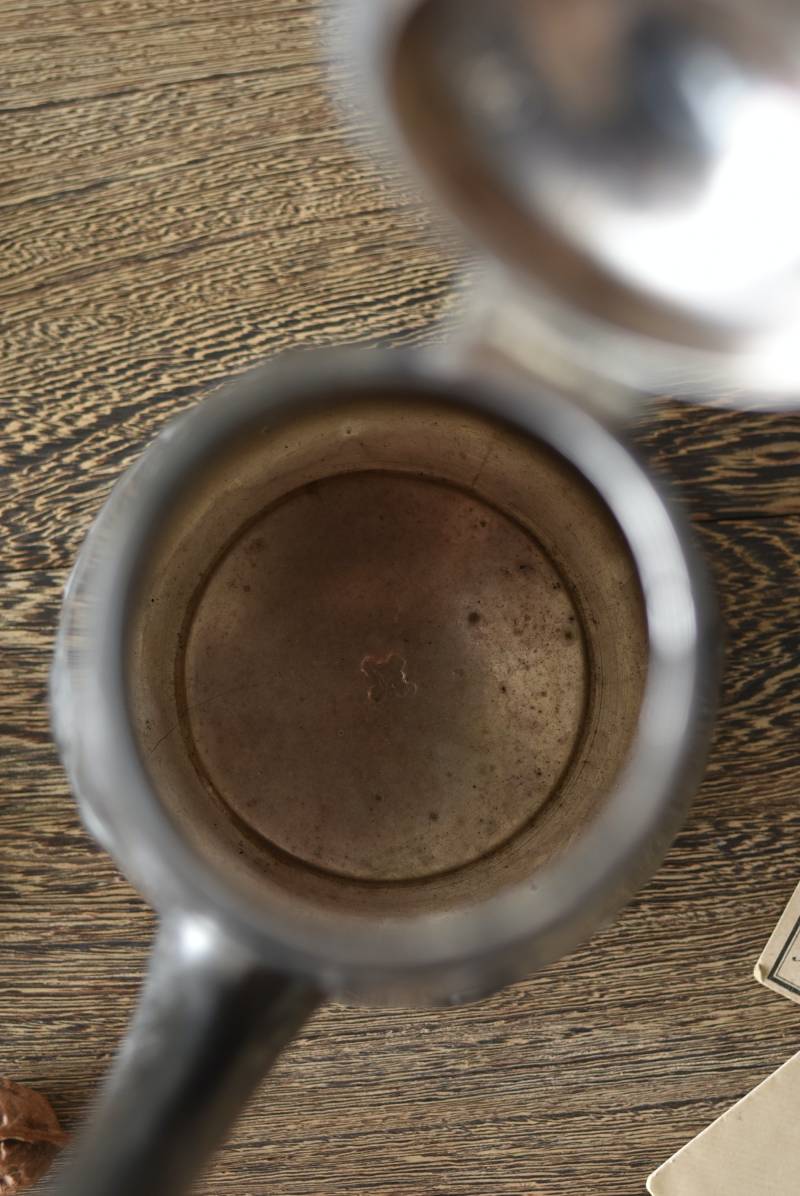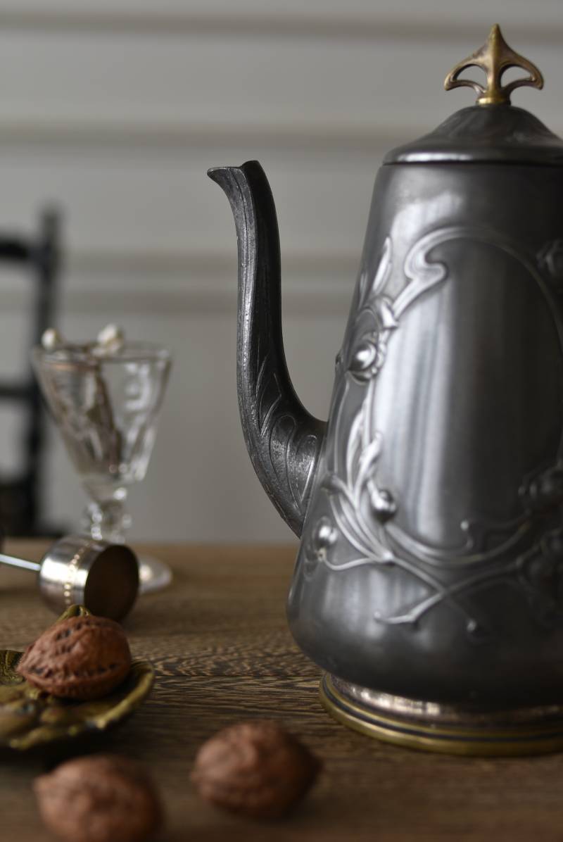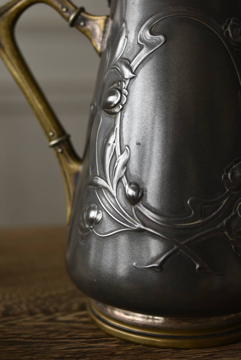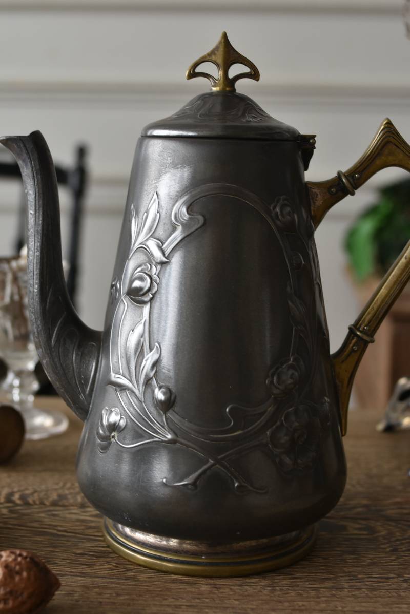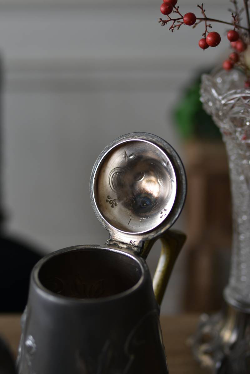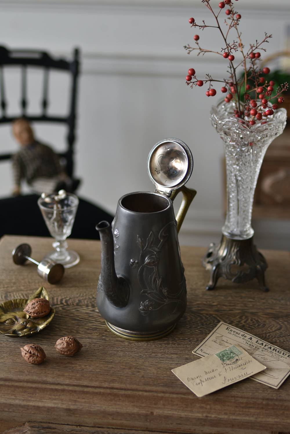 ドイツのメーカー『WMF』のコーヒーポット。 深いグレーの色味とマットな質感が特徴的なエタン(錫)製ボディがかっこいい印象の佇まい。表面には植物を模した流麗なラインのレリーフ装飾があしらわれ、優雅な装いが楽しめる気品高いデザインです。シルバーコーティングされていた部分は年月と共に薄れて下地の真鍮が顔を出しており、その配色が唯一無二の個性的な装いに。 どこか重厚さを感じられる一品で、シックなテーブルコーディネートを楽しめる雰囲気たっぷりのアイテムです。 W 約20cm D 約12cm H 約21.5cm 口径 約5.5cm