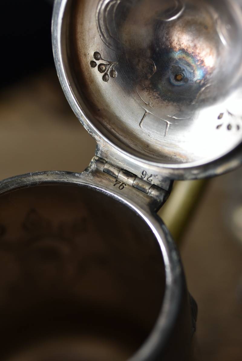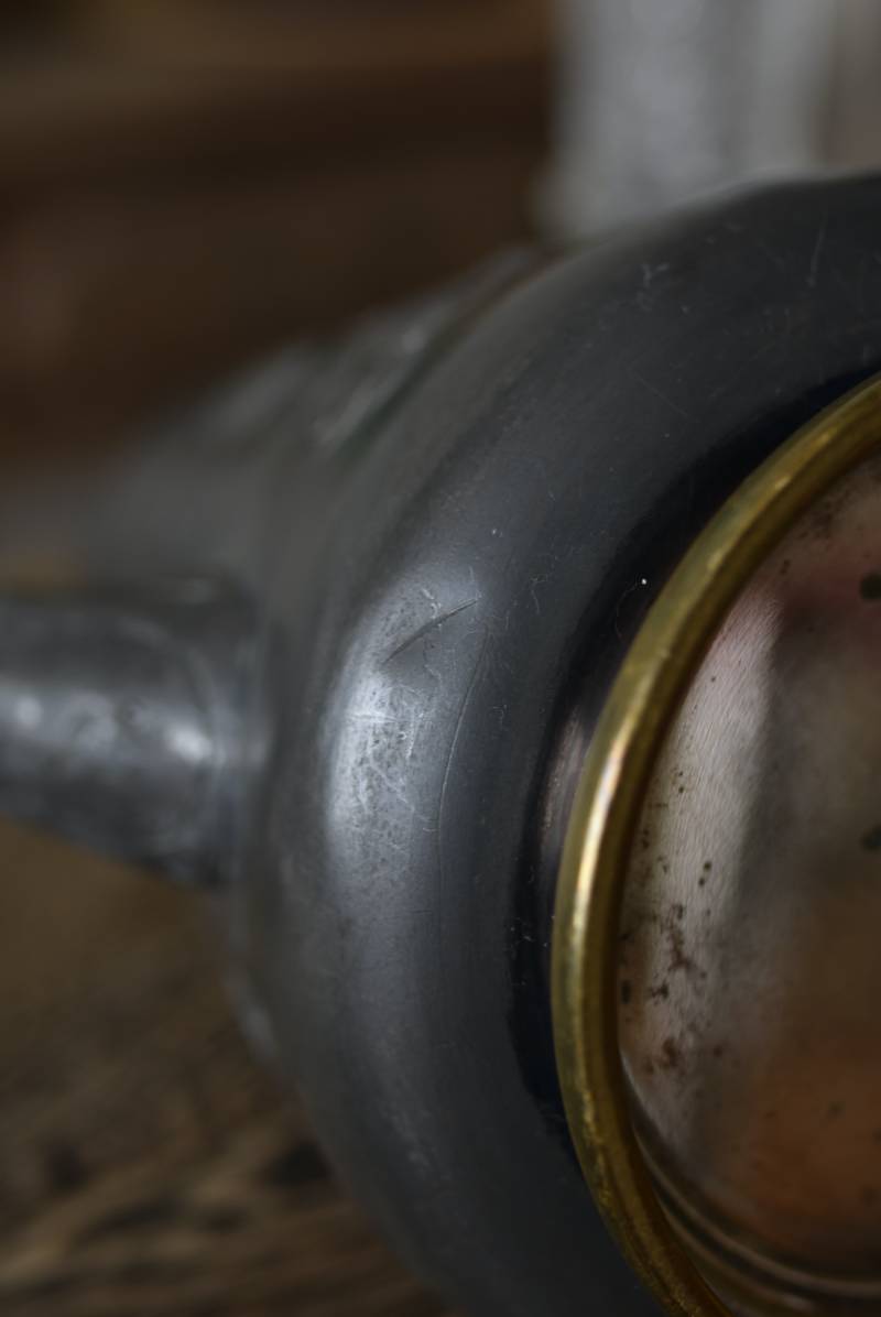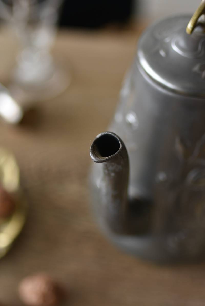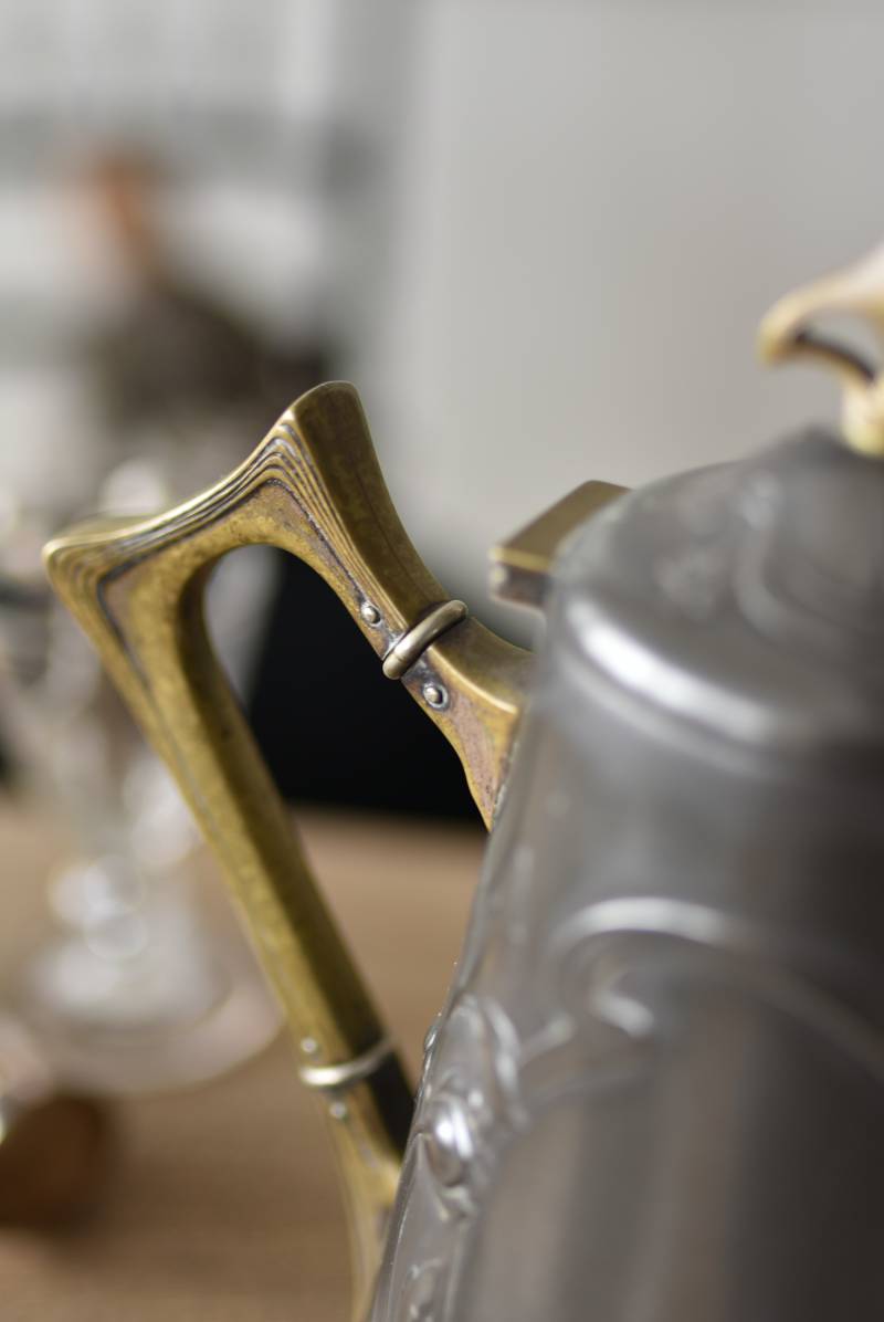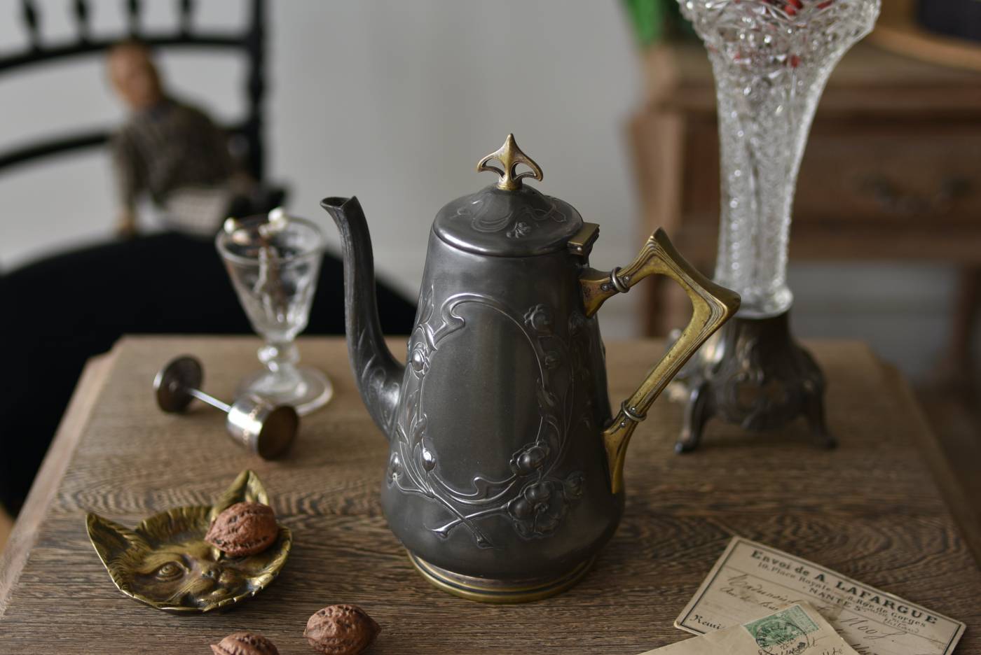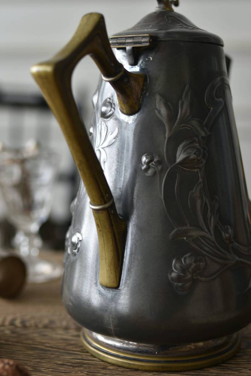 ドイツのメーカー『WMF』のコーヒーポット。 深いグレーの色味とマットな質感が特徴的なエタン(錫)製ボディがかっこいい印象の佇まい。表面には植物を模した流麗なラインのレリーフ装飾があしらわれ、優雅な装いが楽しめる気品高いデザインです。シルバーコーティングされていた部分は年月と共に薄れて下地の真鍮が顔を出しており、その配色が唯一無二の個性的な装いに。 どこか重厚さを感じられる一品で、シックなテーブルコーディネートを楽しめる雰囲気たっぷりのアイテムです。 W 約20cm D 約12cm H 約21.5cm 口径 約5.5cm