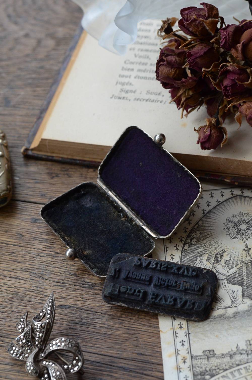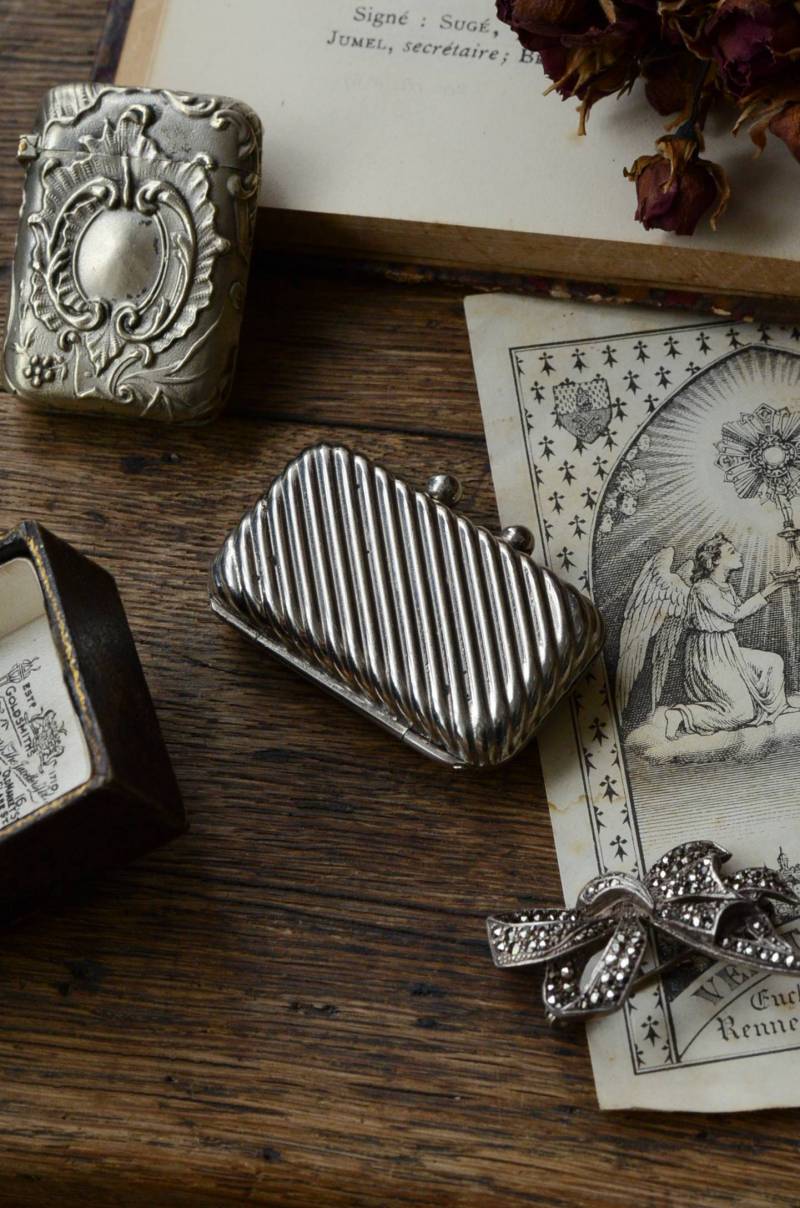 手のひらに収まるほどの小さなフランスのスタンプケース。 斜めに凹凸のあるラインが施されたシャープな姿にロカイユモチーフのデザインが合わさった凛々しさがあり、中央にはそっとイニシャルのような文字が記された趣のある雰囲気が漂います。ケースをあけるとフェルトような布が張られ、おそらく住所印となったスタンプが収められており、持ち手は折り畳み出来る機能的な作りです。 シルバープレートならではの無機質な風合いはクールな印象をもたらし、小ぶりながらも独特な雰囲気を演出してくれます。 W 約5cm D 約3.5cm H 約1cm