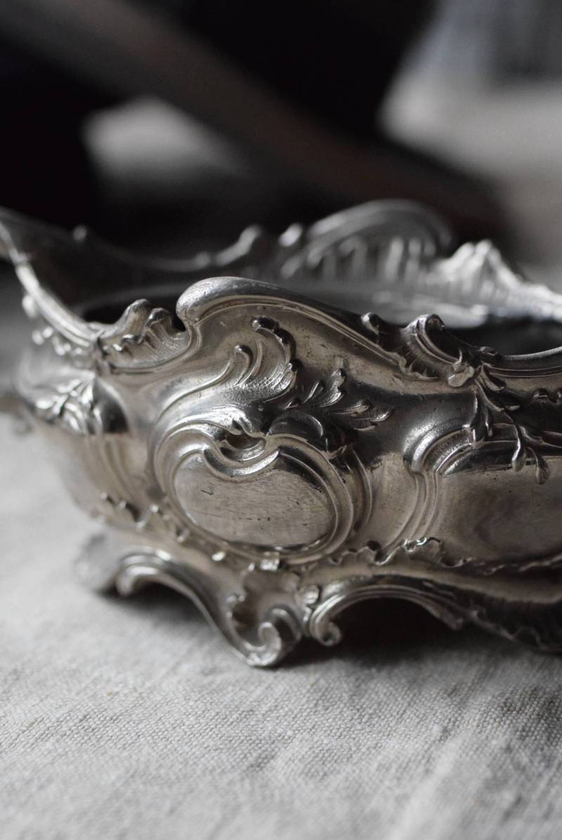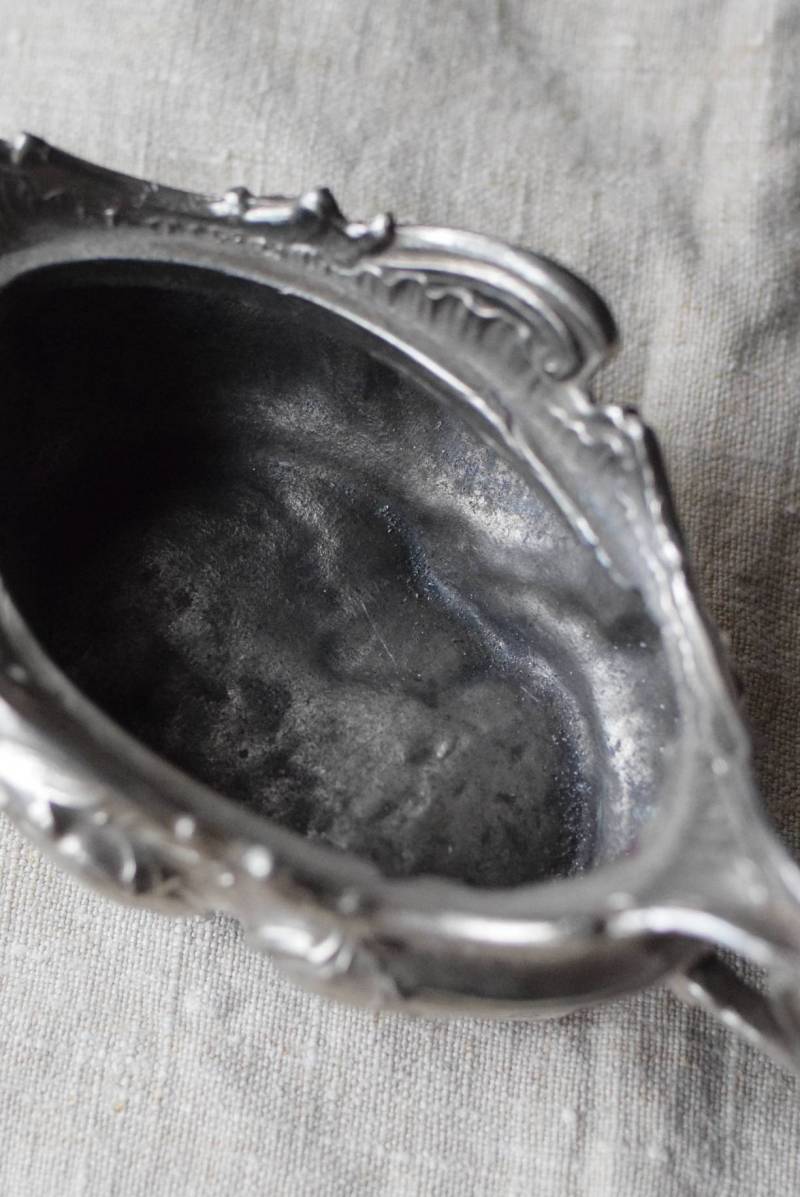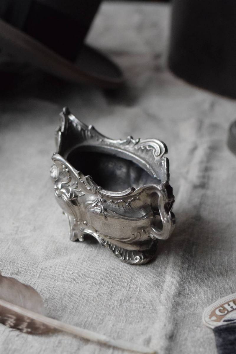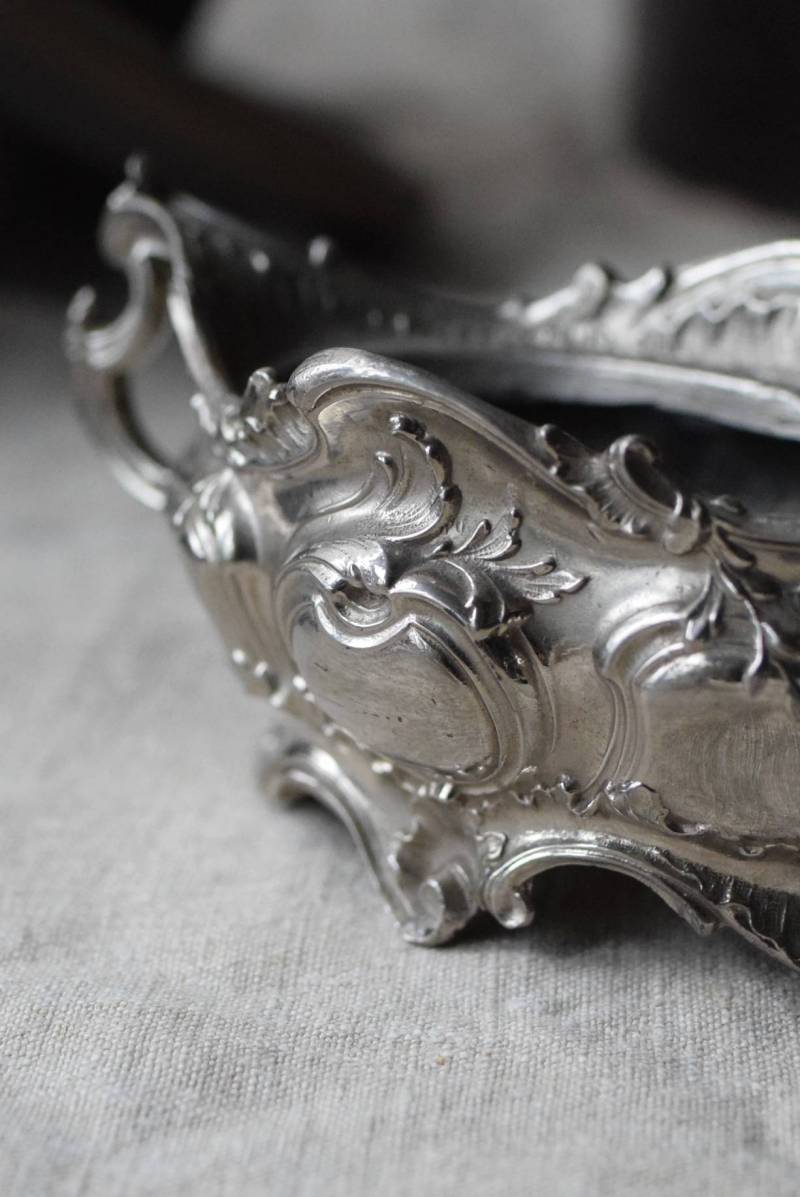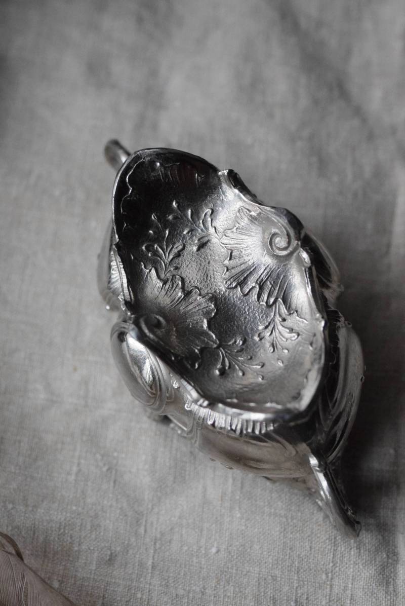 植物の葉やシェルなどをモチーフとした有機的な美しい姿。アシンメトリーなデザインになっており、自然が織りなす豊かな流れや動きのようなものを感じさせてくれます。年季を帯びた風合いを纏いながらも、明るめのシルバーカラーが上品です。