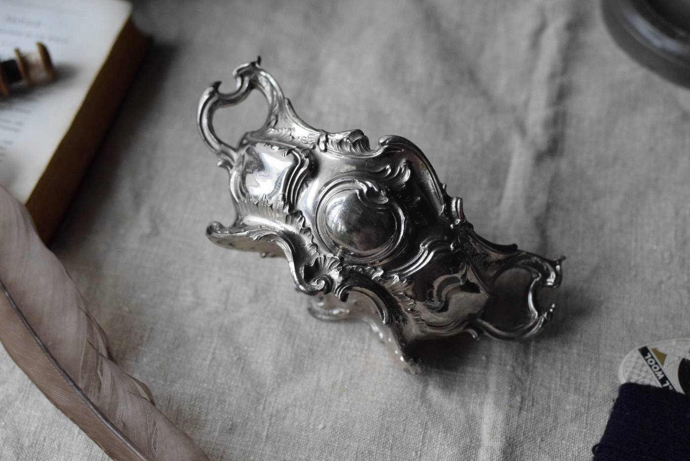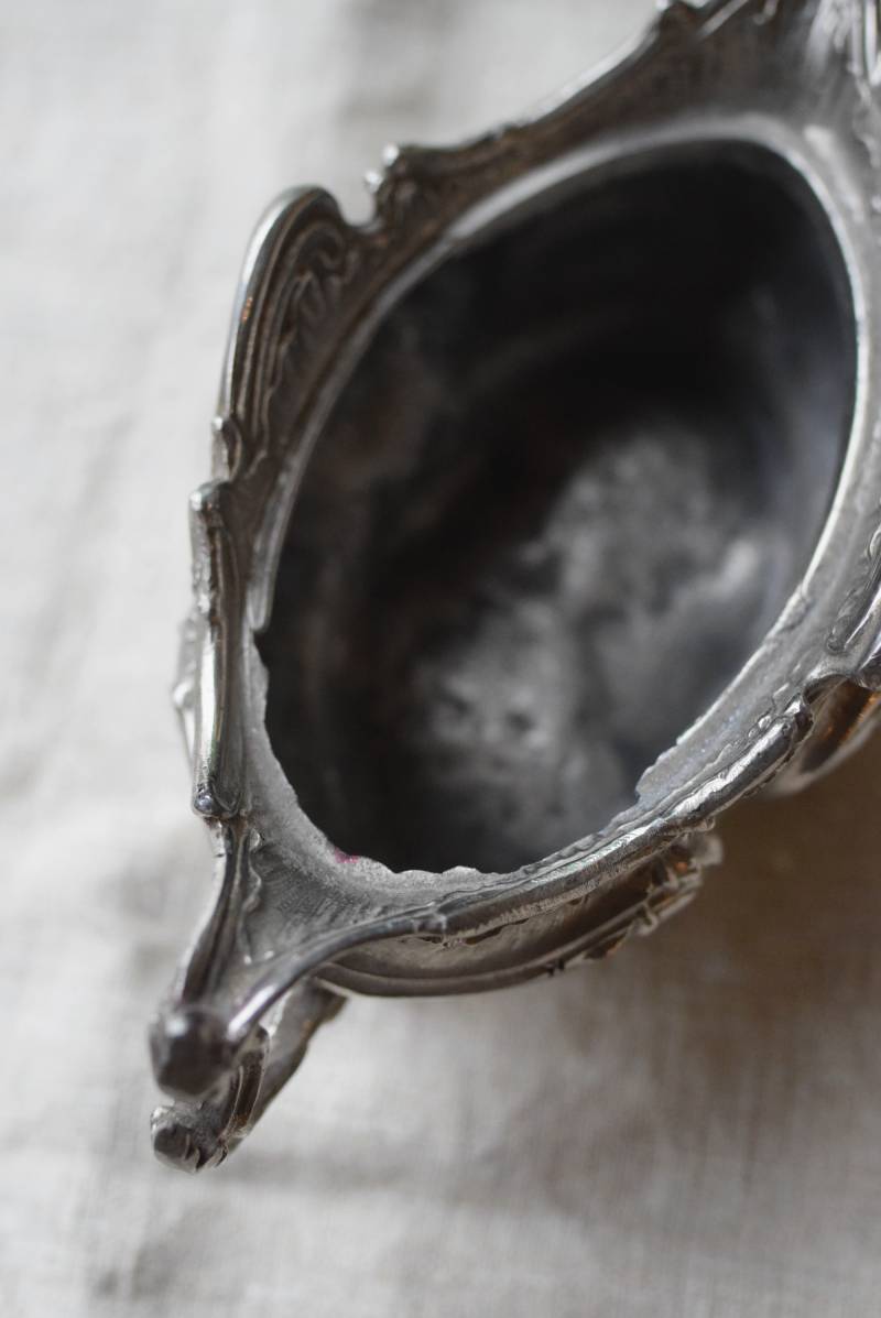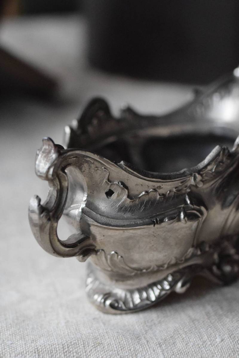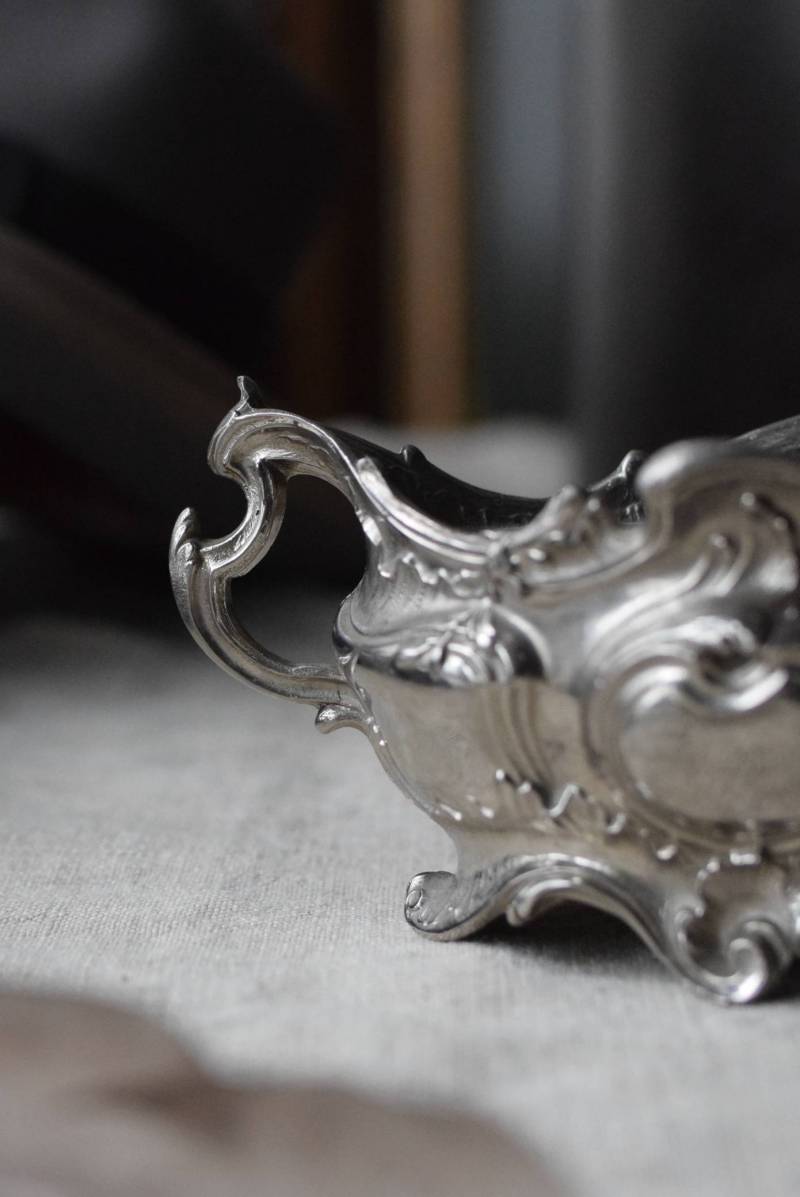 植物の葉やシェルなどをモチーフとした有機的な美しい姿。アシンメトリーなデザインになっており、自然が織りなす豊かな流れや動きのようなものを感じさせてくれます。年季を帯びた風合いを纏いながらも、明るめのシルバーカラーが上品です。