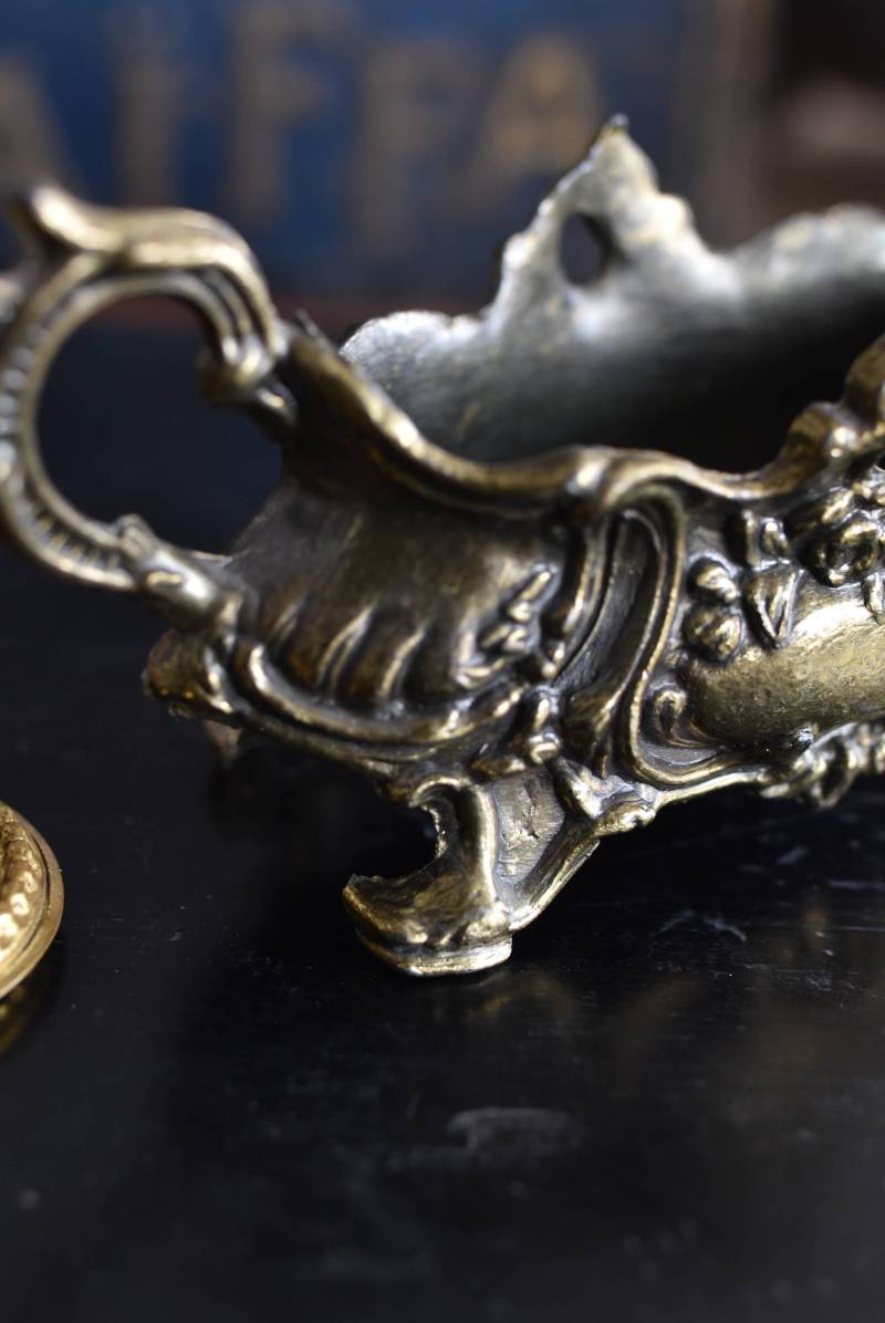 手にちょこんとのるほどの小さなジャルディニエール。 フランスのもので、お花デザインがセンターにあしらわれた可憐な雰囲気を纏い、しっかりとした凹凸のある流れるようなラインが合わさった豪華なデザインです。両側にある華奢な持ち手までも躍動感のある抜け目のない造形で、うっとりするほどの繊細さが楽しめます。 深みのあるゴールドカラーが程よい重厚感を纏い、さりげなくも卓上を華やかにしてくれます。 W 約13cm D 約4.5cm H 約5.5cm