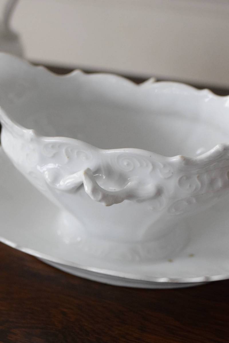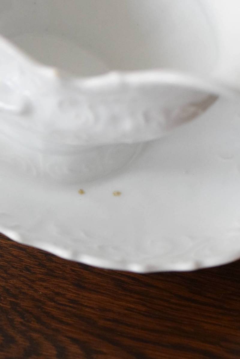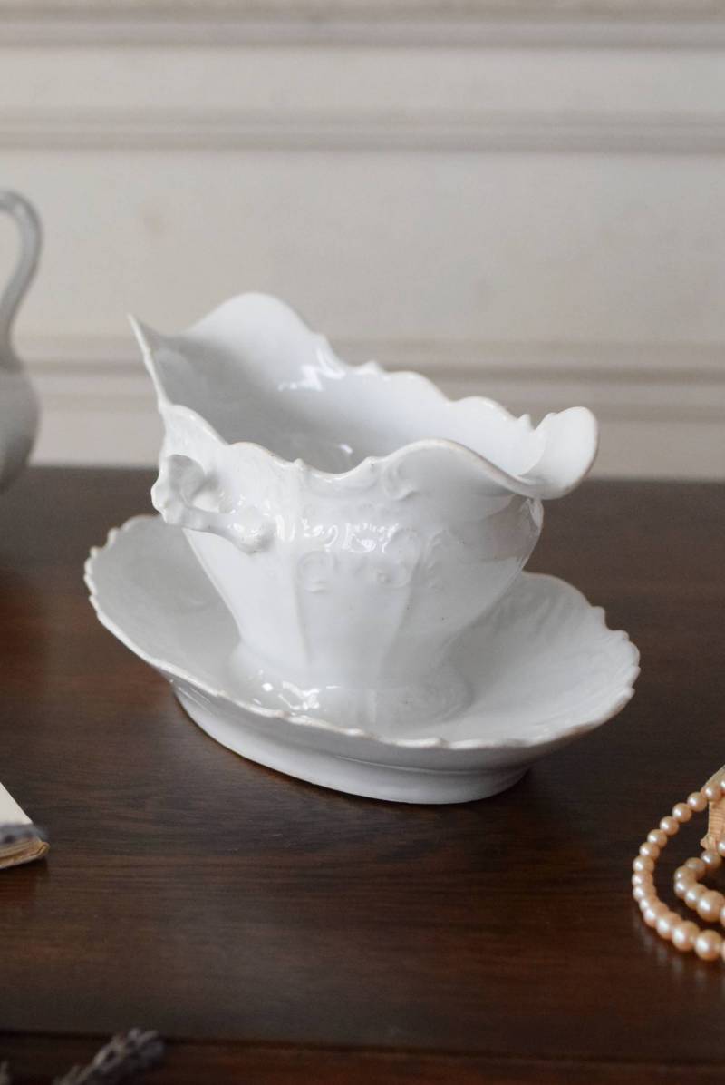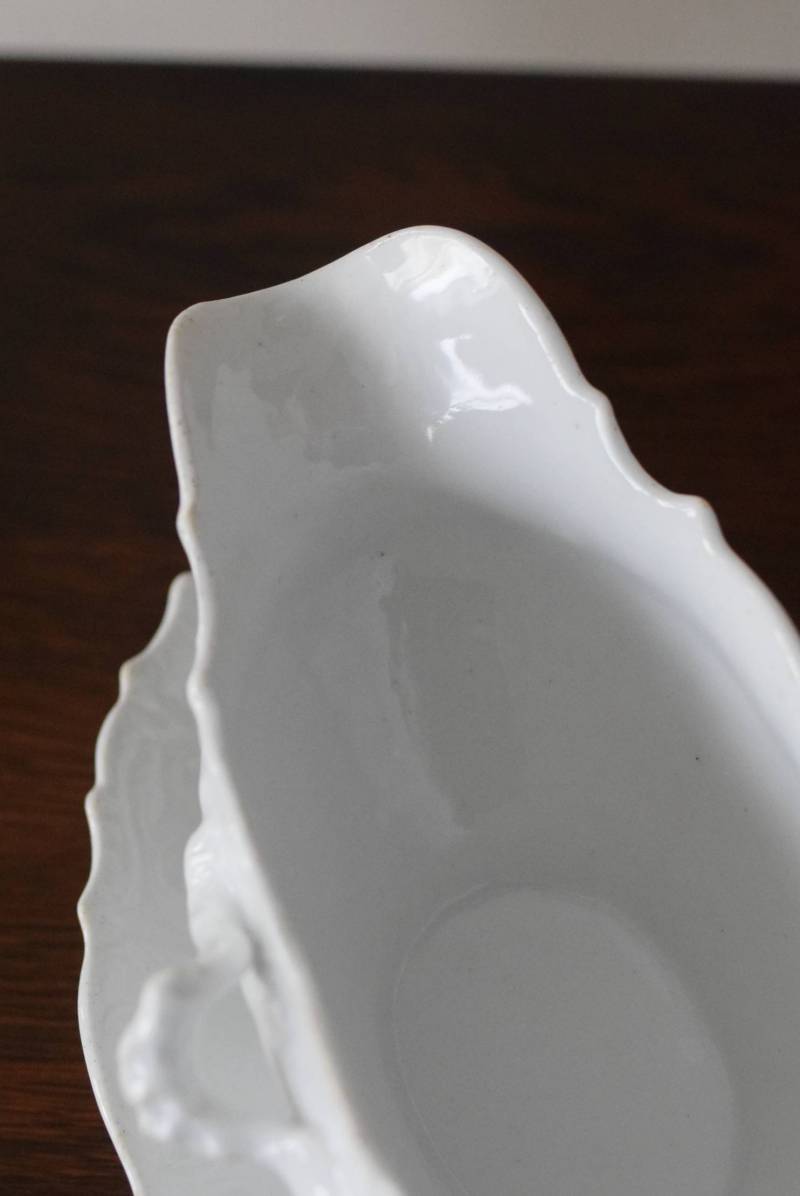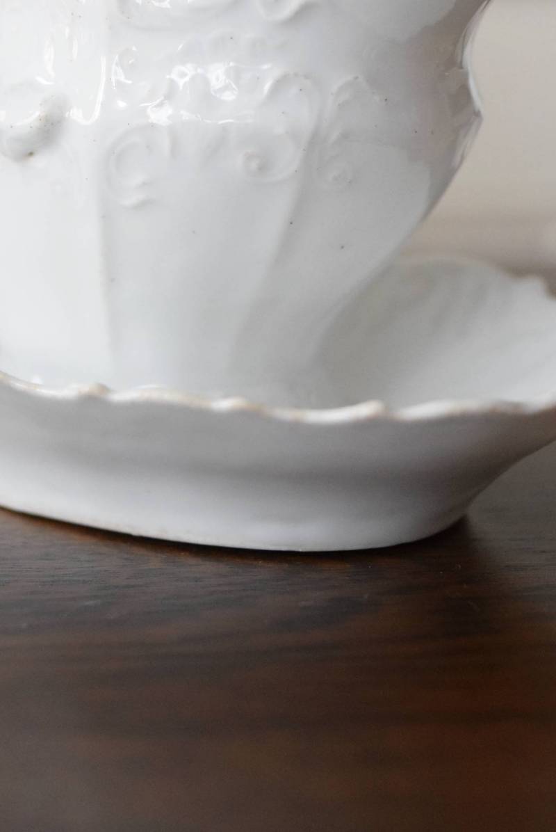 開花した花びらのように左右に広がったフォルムを持ち、エレガントな雰囲気漂う美しい姿。シェルや植物の葉など自然をモチーフにした躍動感溢れるデザインで、側面やソーサーの縁にも繊細で豊かなレリーフが施されています。