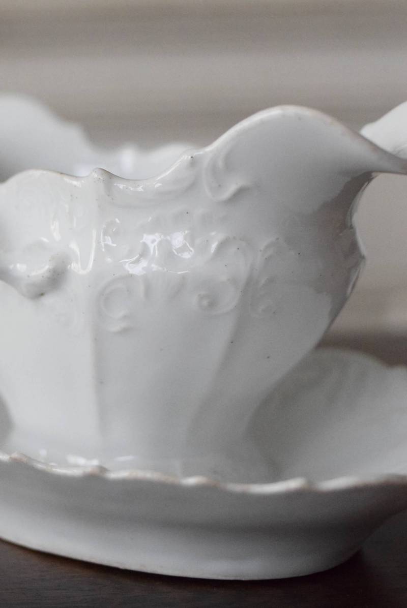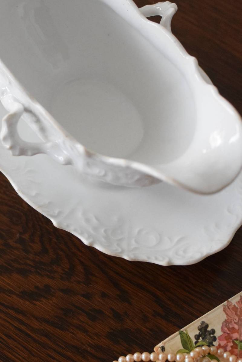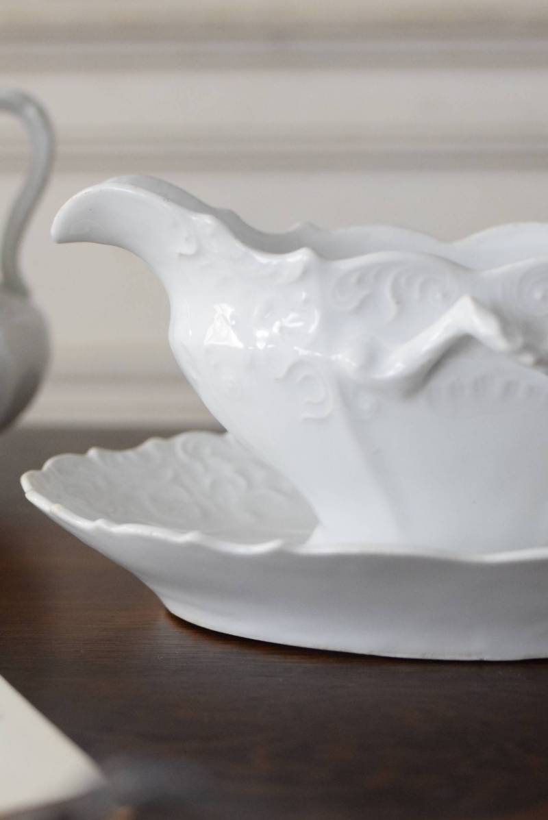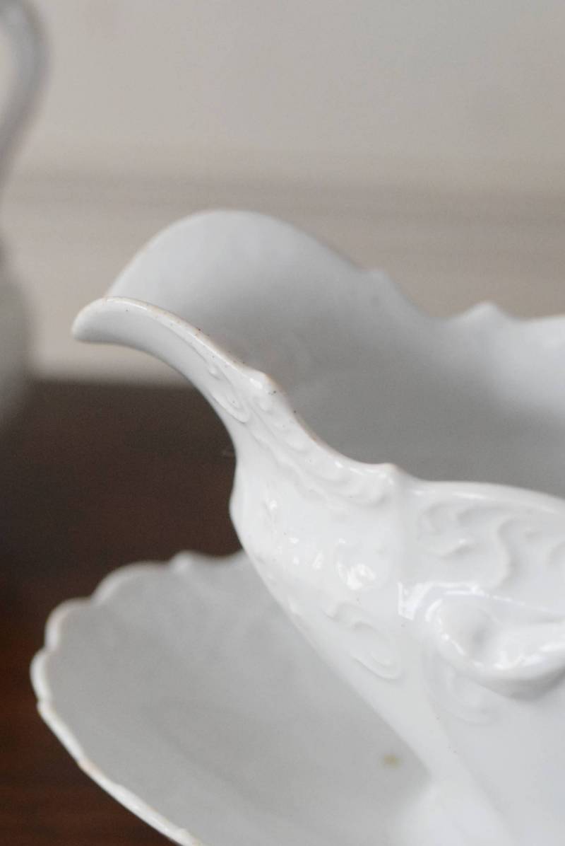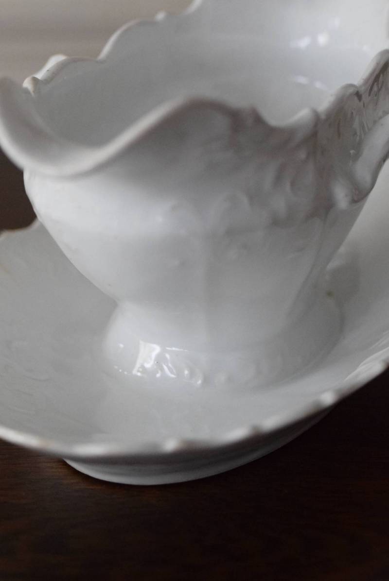 開花した花びらのように左右に広がったフォルムを持ち、エレガントな雰囲気漂う美しい姿。シェルや植物の葉など自然をモチーフにした躍動感溢れるデザインで、側面やソーサーの縁にも繊細で豊かなレリーフが施されています。