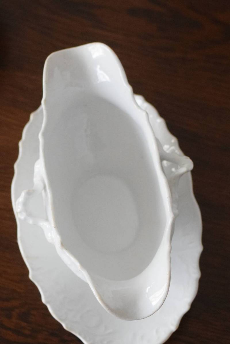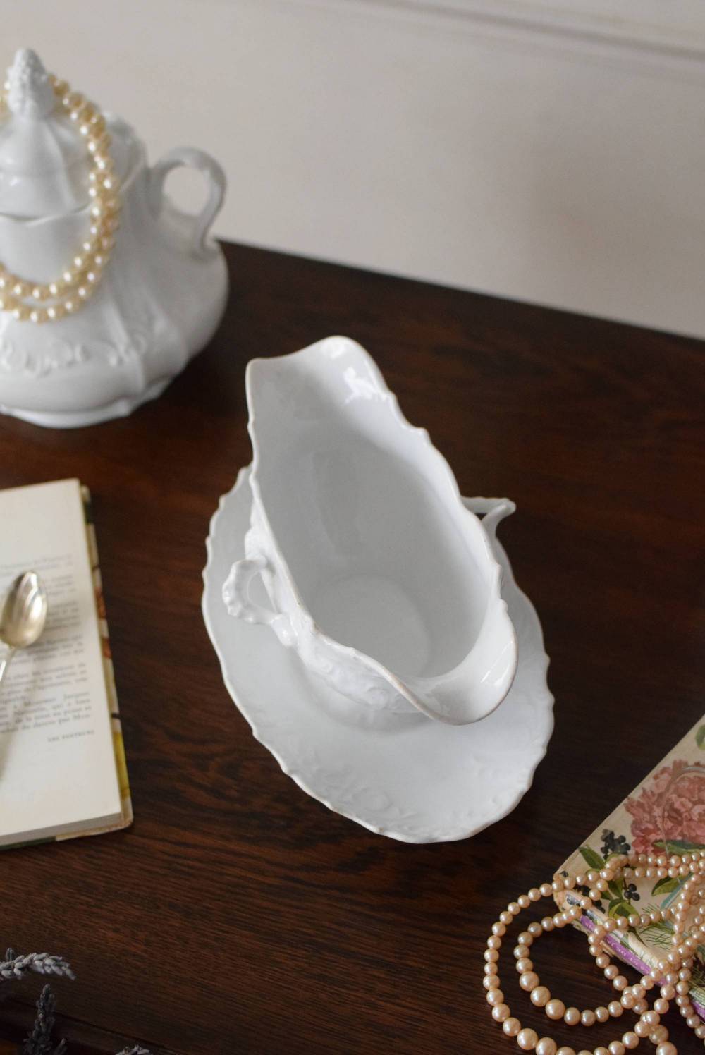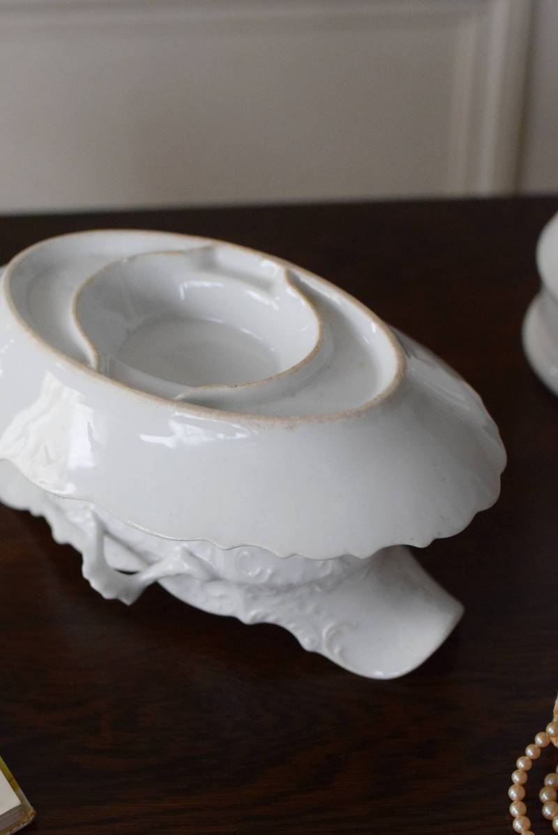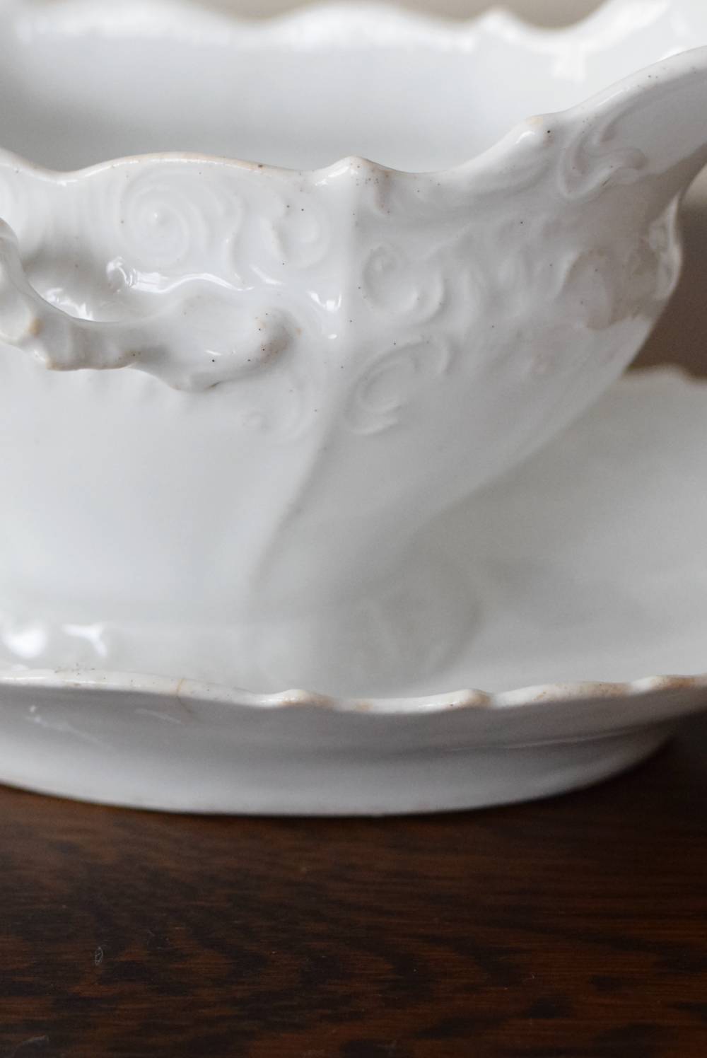 開花した花びらのように左右に広がったフォルムを持ち、エレガントな雰囲気漂う美しい姿。シェルや植物の葉など自然をモチーフにした躍動感溢れるデザインで、側面やソーサーの縁にも繊細で豊かなレリーフが施されています。
