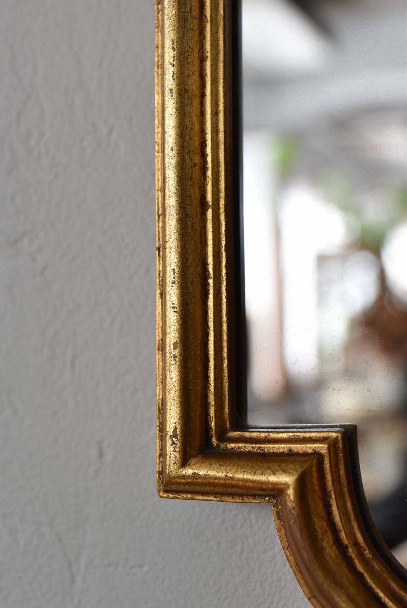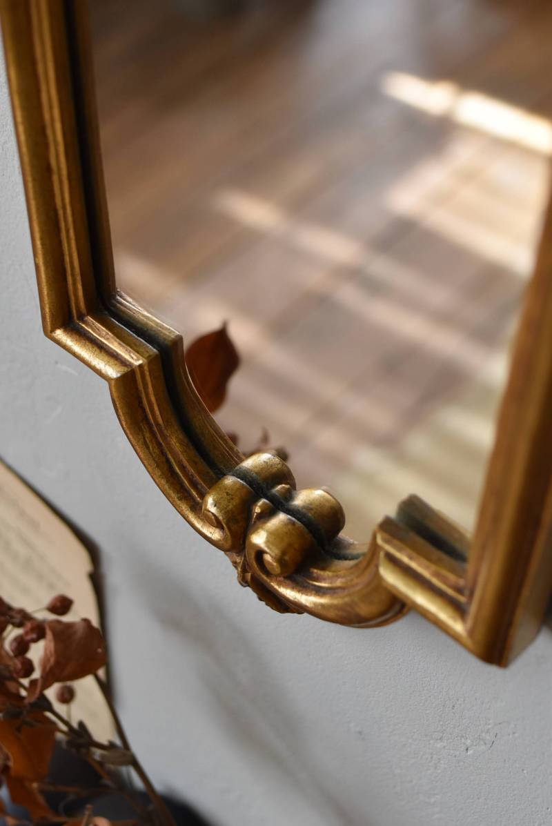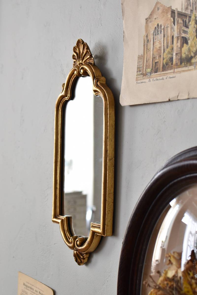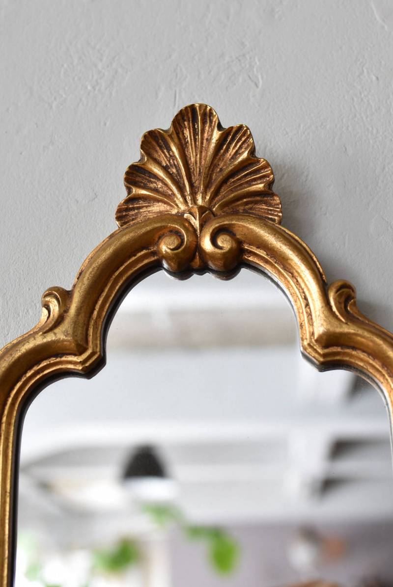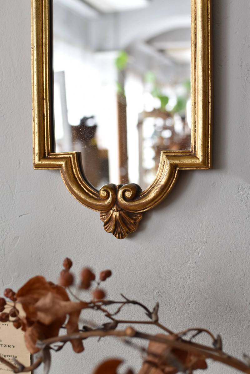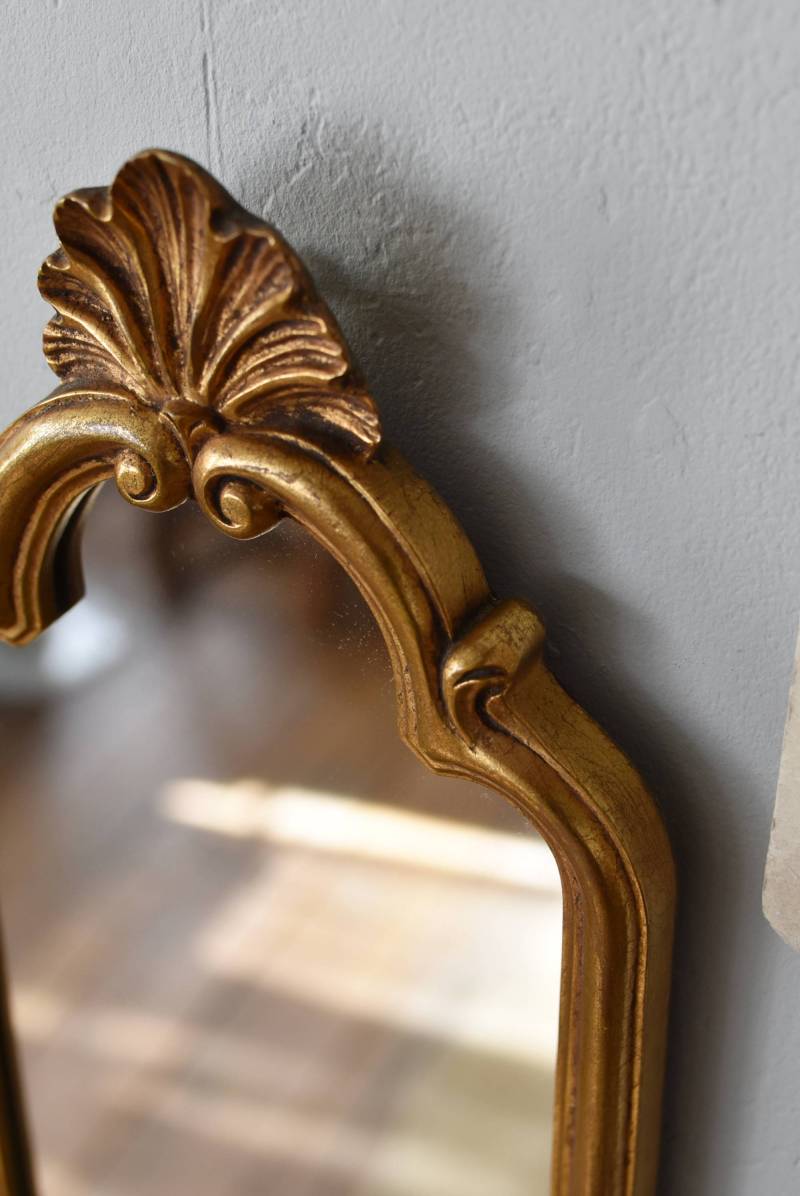 縦長シルエットになった比較的小ぶりなフランスのミラー。 丸みのあるシェルモチーフの大小の装飾が上下に施されており、凹凸のある細やかなラインが施された立体感のある造形が目を惹き、さりげなくエレガントさが漂います。深みのあるゴールドカラーで縁取られたぷっくりとした幅のあるラインが引き立ち、明るい雰囲気の親しみやすさが感じられるデザインです。 鏡面は買い付け当時のままとなり細かなシミなどはありますが、歪みはなく実用として使用できる範囲かと思います。軽量なのも気軽に取り入れやすく、直線と曲線が組み合わさった優しげな印象のデコラティブすぎない姿はどのテイストにも合わせやすそうです。 W 約18cm D 約2.5cm H 約42cm 鏡面積 W約14cm×D約29.5cm 重量 約0.7kg