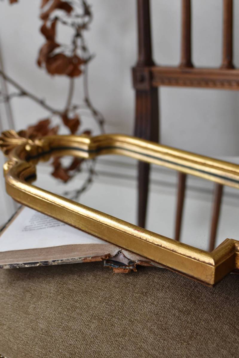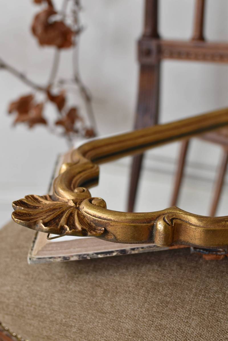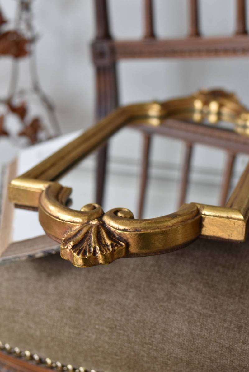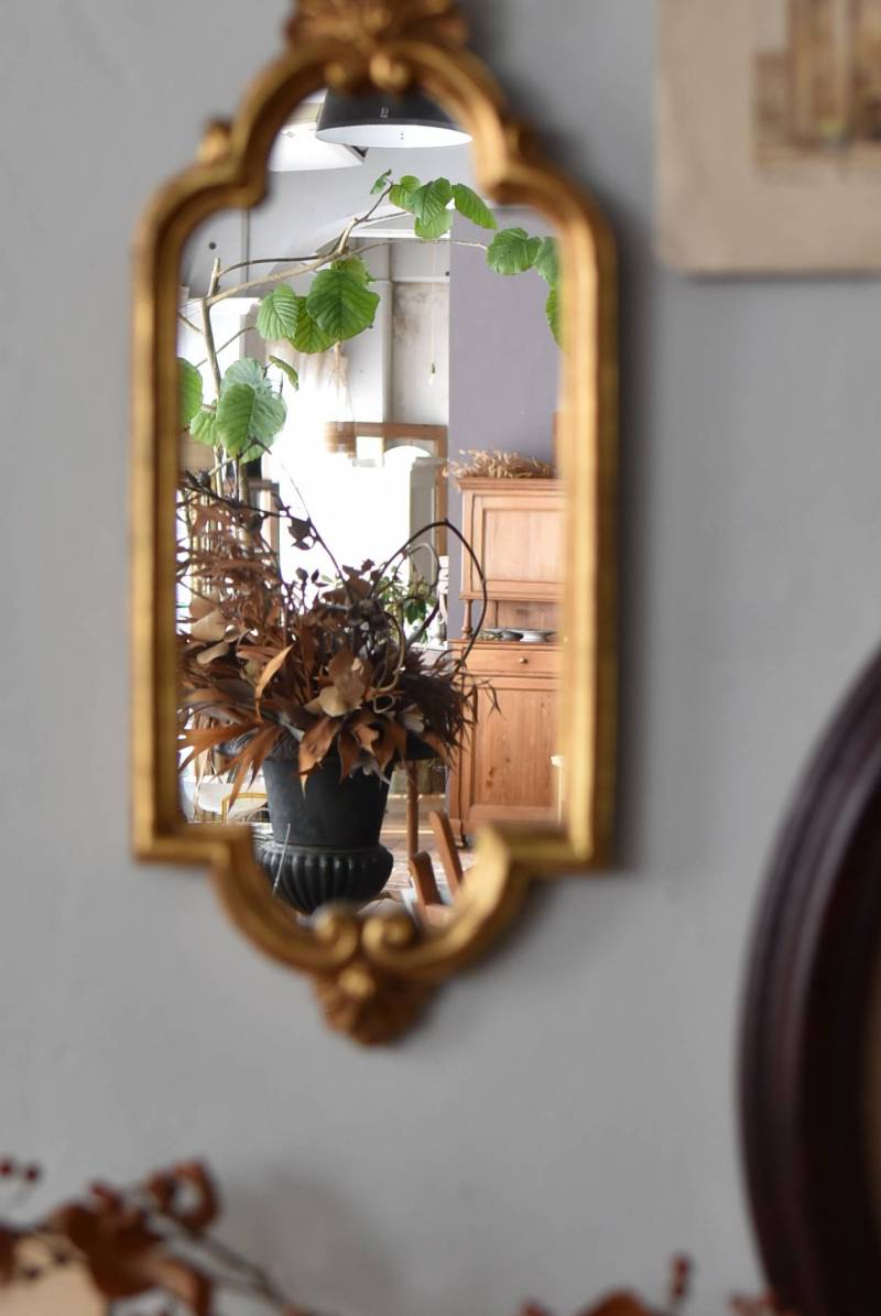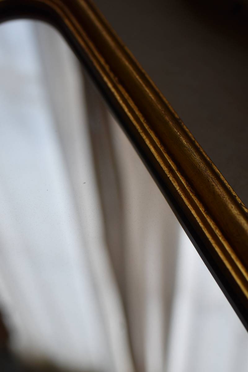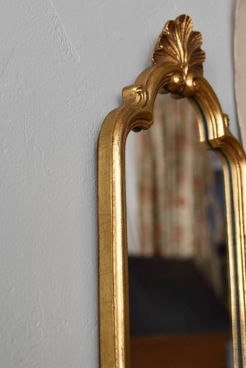 縦長シルエットになった比較的小ぶりなフランスのミラー。 丸みのあるシェルモチーフの大小の装飾が上下に施されており、凹凸のある細やかなラインが施された立体感のある造形が目を惹き、さりげなくエレガントさが漂います。深みのあるゴールドカラーで縁取られたぷっくりとした幅のあるラインが引き立ち、明るい雰囲気の親しみやすさが感じられるデザインです。 鏡面は買い付け当時のままとなり細かなシミなどはありますが、歪みはなく実用として使用できる範囲かと思います。軽量なのも気軽に取り入れやすく、直線と曲線が組み合わさった優しげな印象のデコラティブすぎない姿はどのテイストにも合わせやすそうです。 W 約18cm D 約2.5cm H 約42cm 鏡面積 W約14cm×D約29.5cm 重量 約0.7kg
