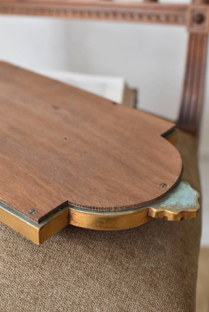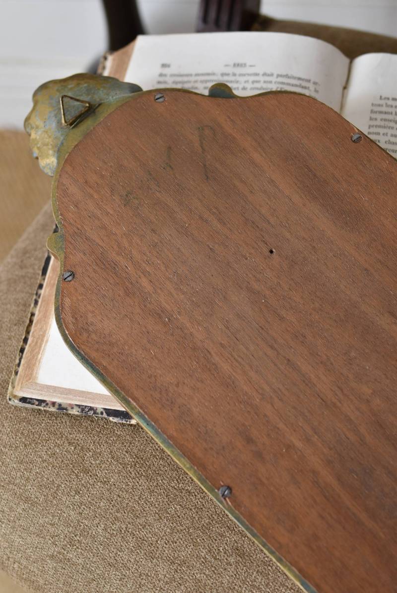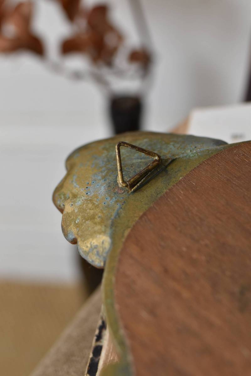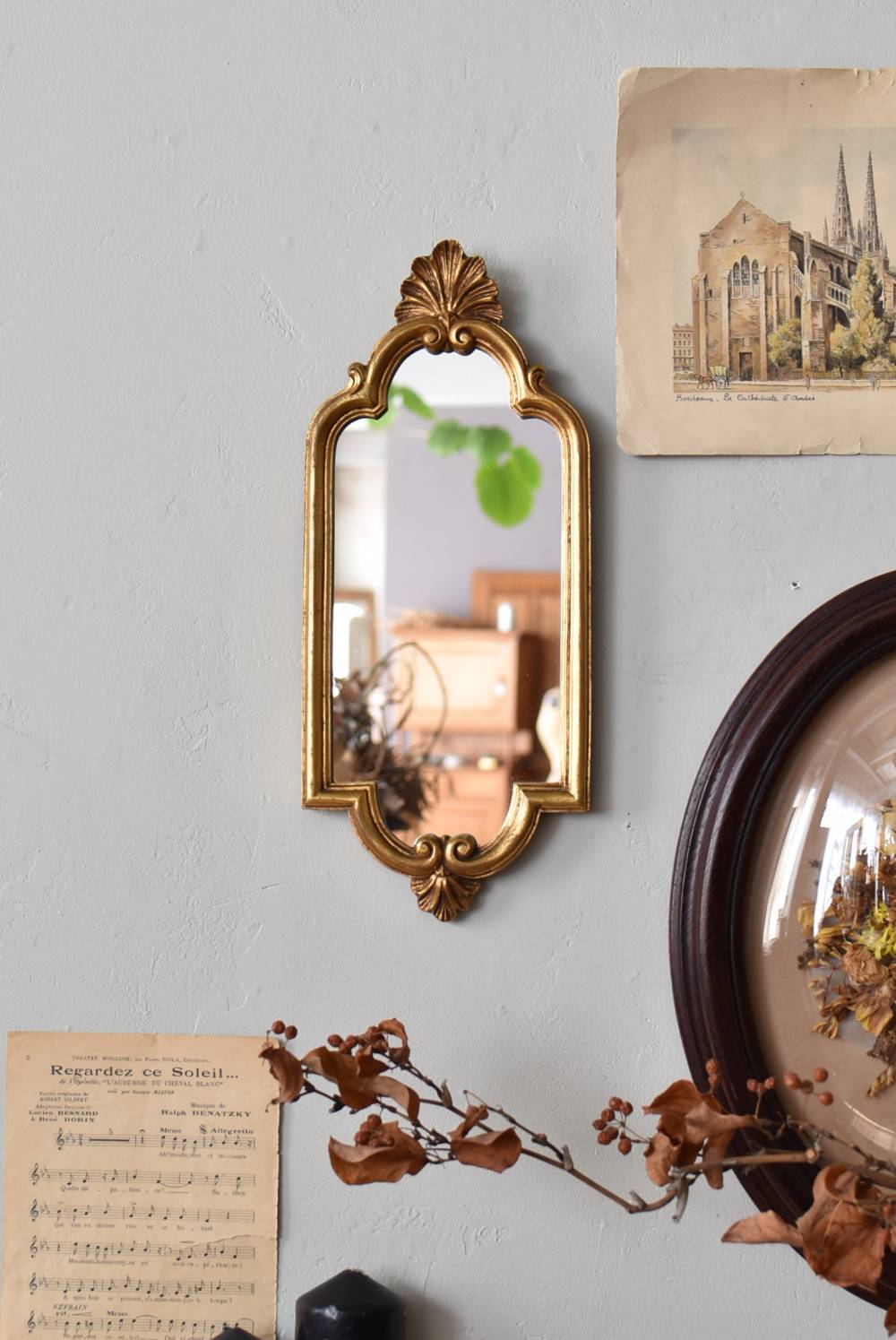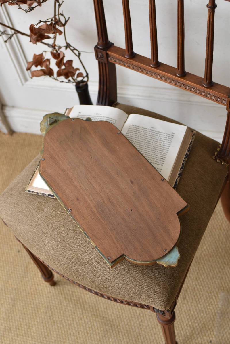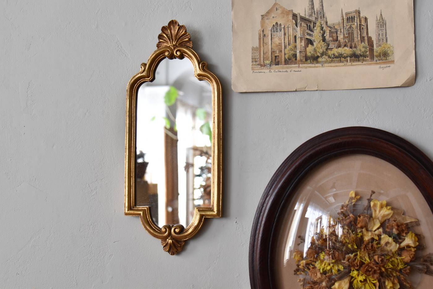 縦長シルエットになった比較的小ぶりなフランスのミラー。 丸みのあるシェルモチーフの大小の装飾が上下に施されており、凹凸のある細やかなラインが施された立体感のある造形が目を惹き、さりげなくエレガントさが漂います。深みのあるゴールドカラーで縁取られたぷっくりとした幅のあるラインが引き立ち、明るい雰囲気の親しみやすさが感じられるデザインです。 鏡面は買い付け当時のままとなり細かなシミなどはありますが、歪みはなく実用として使用できる範囲かと思います。軽量なのも気軽に取り入れやすく、直線と曲線が組み合わさった優しげな印象のデコラティブすぎない姿はどのテイストにも合わせやすそうです。 W 約18cm D 約2.5cm H 約42cm 鏡面積 W約14cm×D約29.5cm 重量 約0.7kg