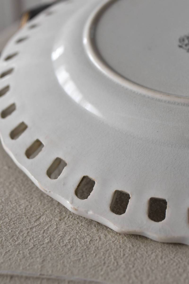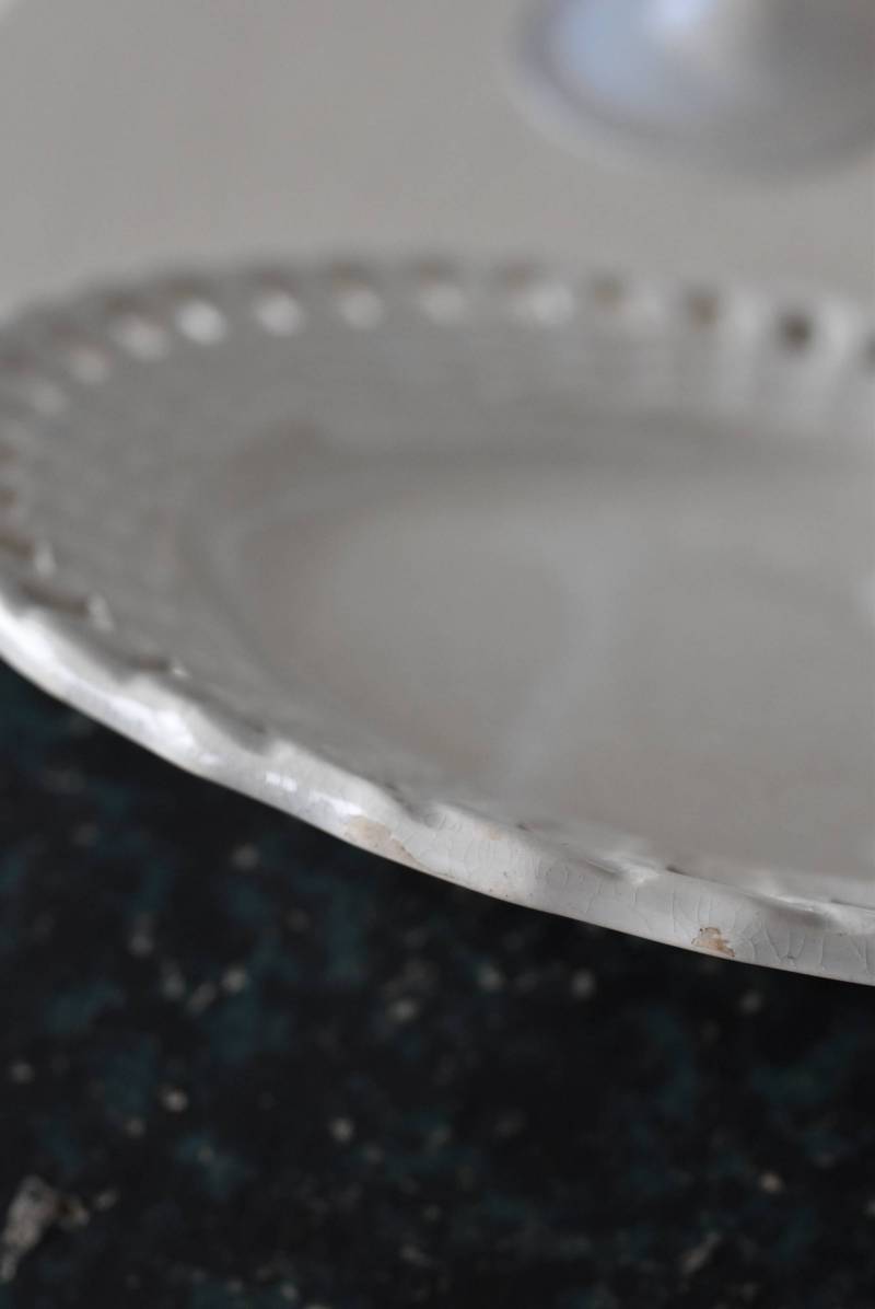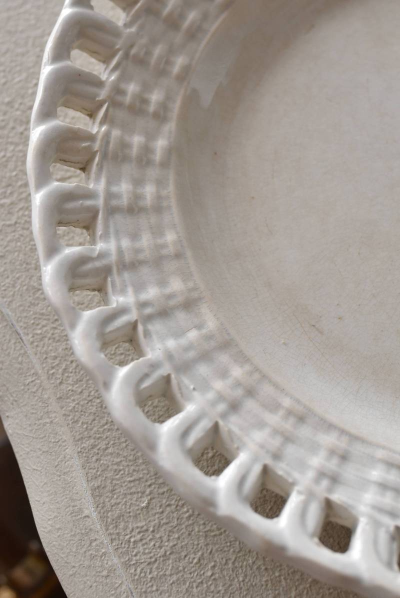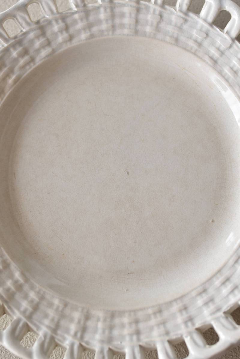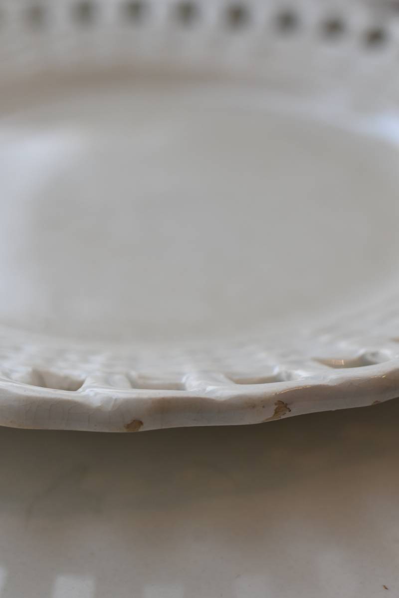 フランス・Creil et Montereau(クレイユエモントロー)のパニエ皿。 ざっくりと編み込まれたようなリム部分が花びらのようになった愛らしさがあり、カジュアルな要素も感じられるぬくもりのあるデザインです。長い歴史を物語るシミなどのある風合いで趣のある表情を楽しませてくれ、パニエをモチーフとした凹凸のある模様が上品に魅せてくれます。 それぞれでの販売となりますが、状態が異なる同じデザインのパニエ皿で揃える事が出来ます。ほんのりと青みがかった白い釉薬によって柔らかさをそっと感じるような雰囲気を漂わせてくれます。 直径 約21cm H 約2.5cm