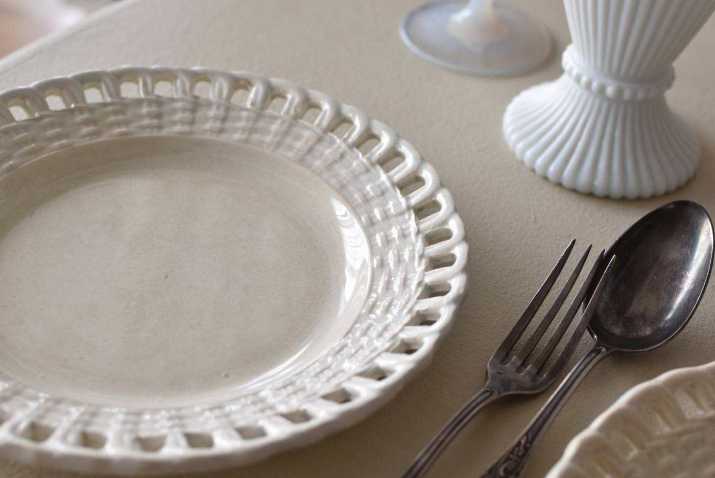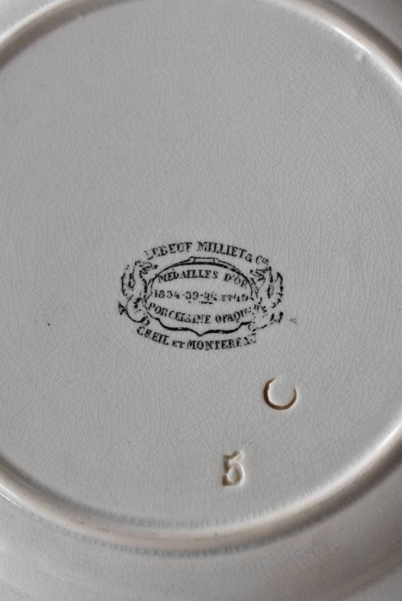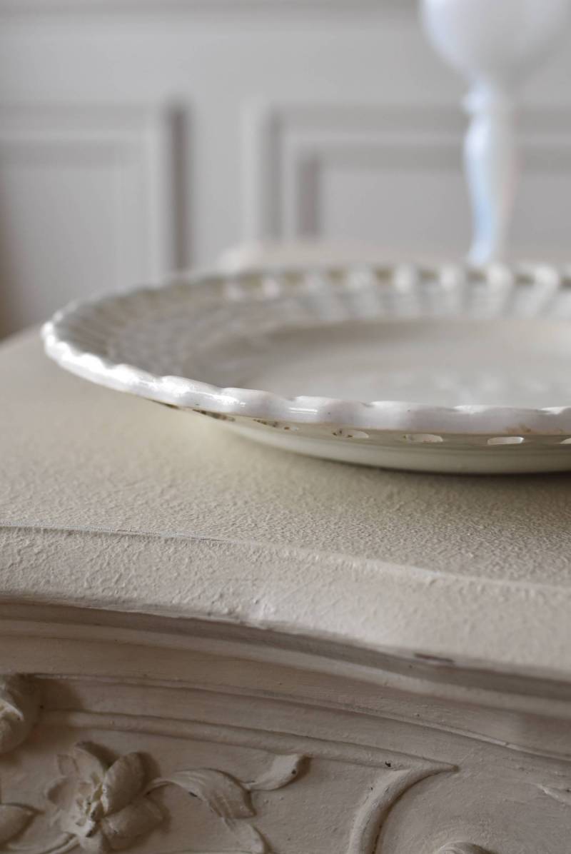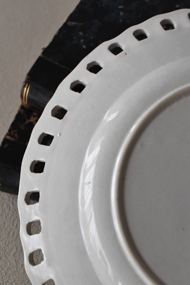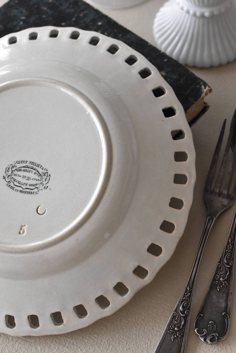 フランス・Creil et Montereau(クレイユエモントロー)のパニエ皿。 ざっくりと編み込まれたようなリム部分が花びらのようになった愛らしさがあり、カジュアルな要素も感じられるぬくもりのあるデザインです。長い歴史を物語るシミなどのある風合いで趣のある表情を楽しませてくれ、パニエをモチーフとした凹凸のある模様が上品に魅せてくれます。 それぞれでの販売となりますが、状態が異なる同じデザインのパニエ皿で揃える事が出来ます。ほんのりと青みがかった白い釉薬によって柔らかさをそっと感じるような雰囲気を漂わせてくれます。 直径 約21cm H 約2.5cm