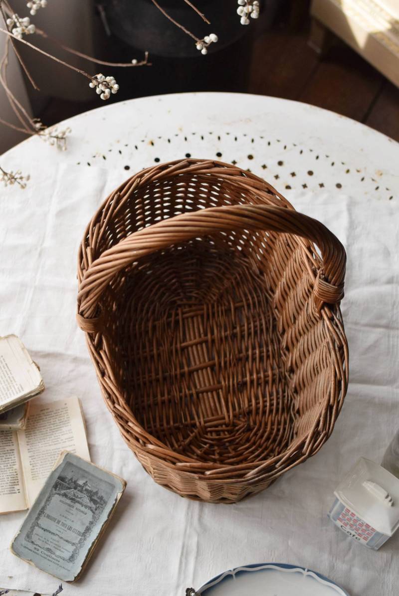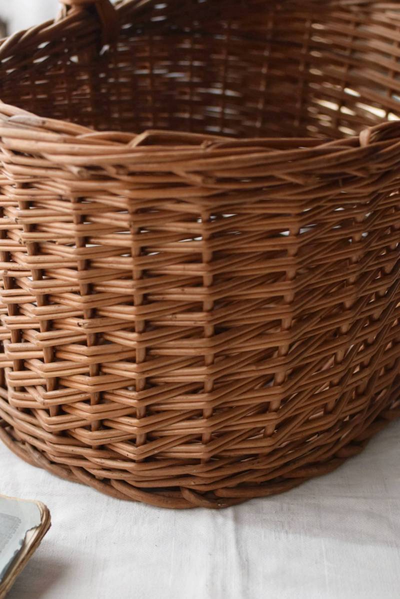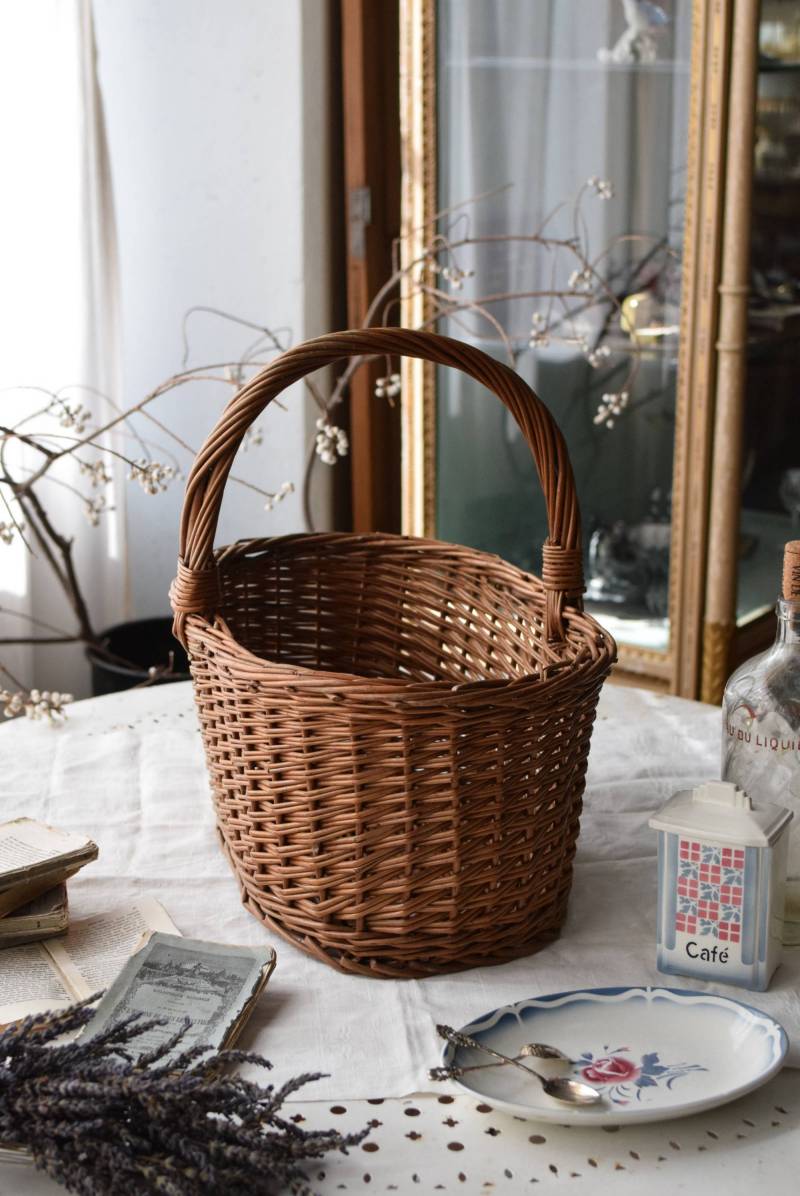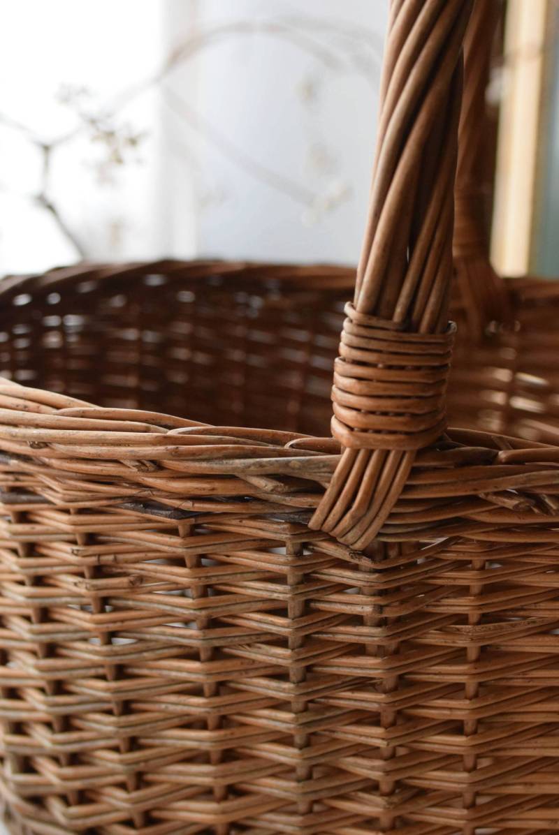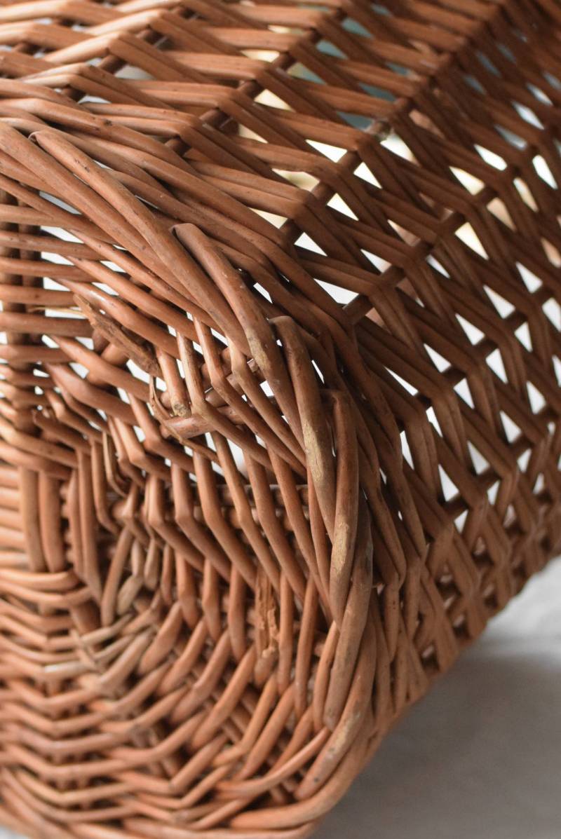 フランスのナチュラルバスケット。 すとんとした寸胴なオーバル型で、安定感のある佇まい。持ち手や縁部分は太めの材でしっかりと、側面は細めの材で細やかに編まれているので、それぞれ異なる表情が生み出され、デザインにメリハリをもたらしてくれます。 ナチュラルな素材感が温かさを醸し出し、シンプルに飾るだけで絵になります。 浅すぎず深すぎず、程よい深さのある形状で、見せる収納にもおすすめです。 W 約41.5cm D 約30.5cm H 約40cm 深さ 約19cm