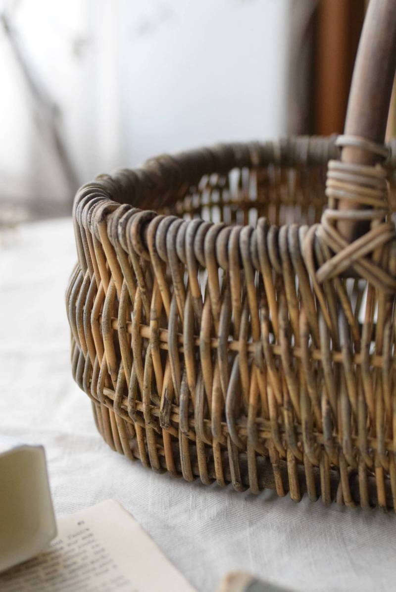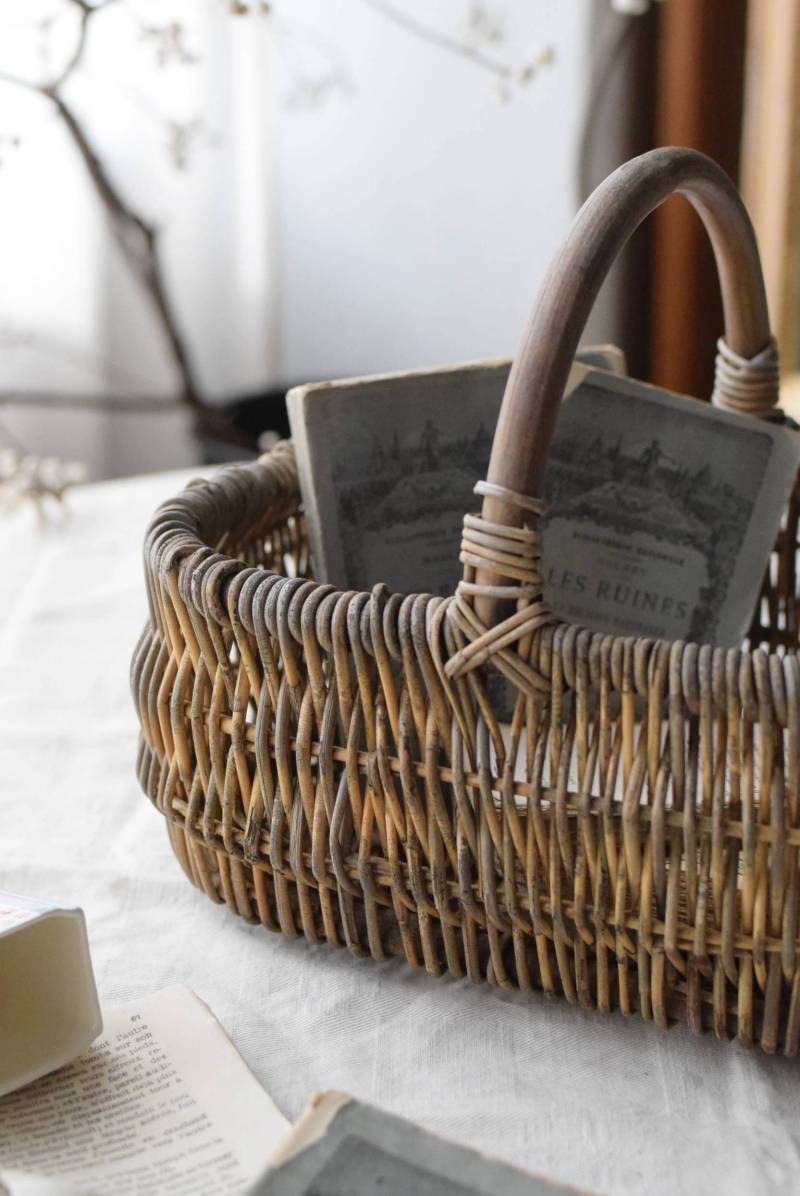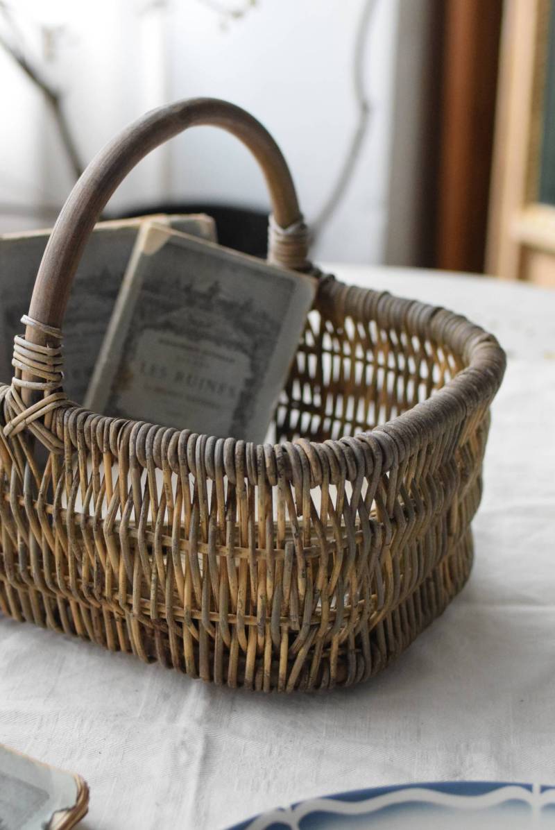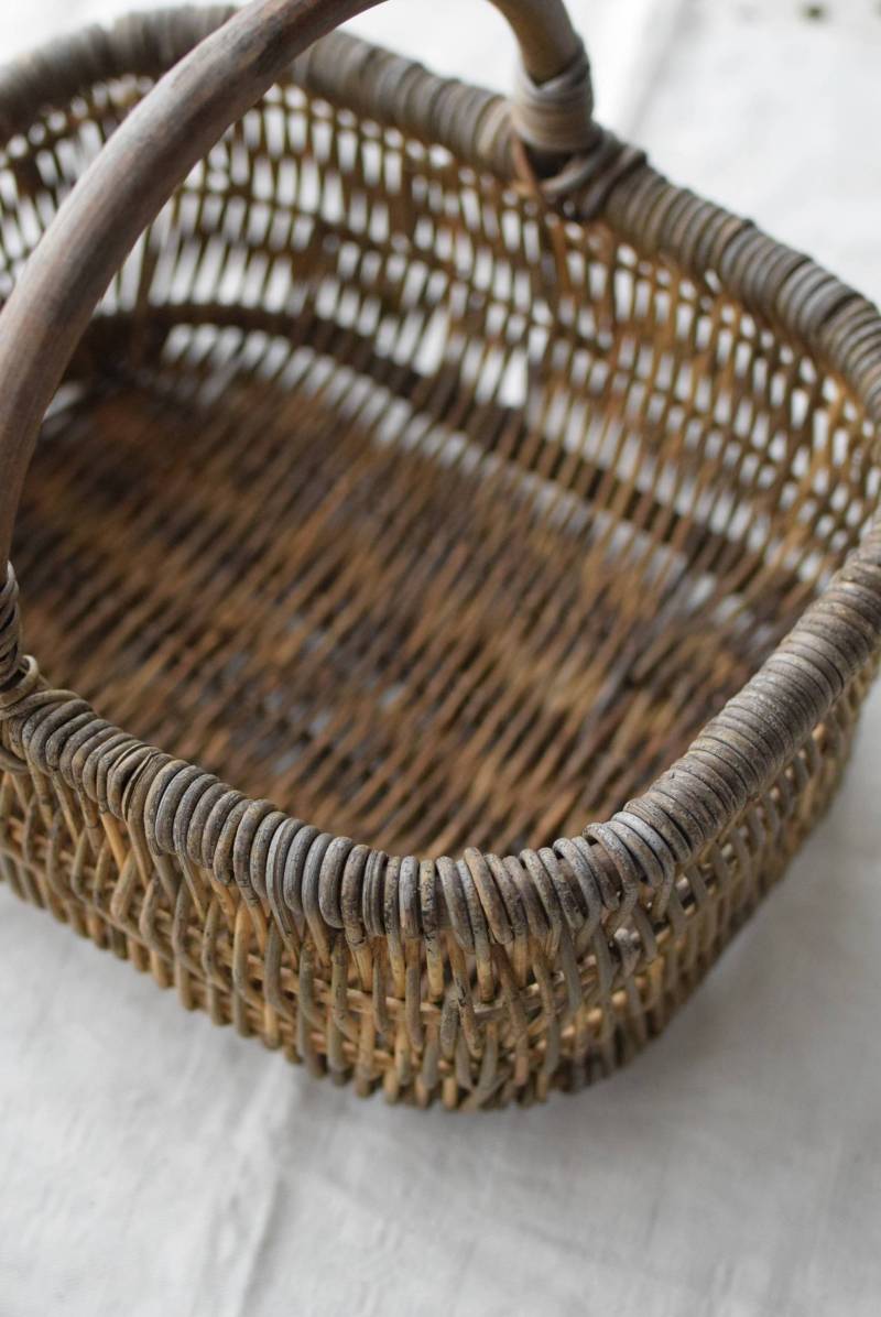 フランスのナチュラルバスケット。 味のある風合いが色濃く感じられる姿で、全体にグレーっぽい色合いですが、ところどころ元々の明るい籐の色が顔を覗かせ、アクセントになっています。素材をそのまま生かした素朴な木の持ち手も目を引きますね。長方形ながら、縁がぽってりと太く、全体に角が取れた丸みのある形状で、どこか親しみやすい優しいフォルム。サイズ感も小ぶりです。 意図的に着色された跡が残りますが、経年変化を経てさらに風合いを増し、独特の表情へと変化した個性的なアイテムです。 W 約27cm D 約21.5cm H 約21.5cm 深さ 約11cm