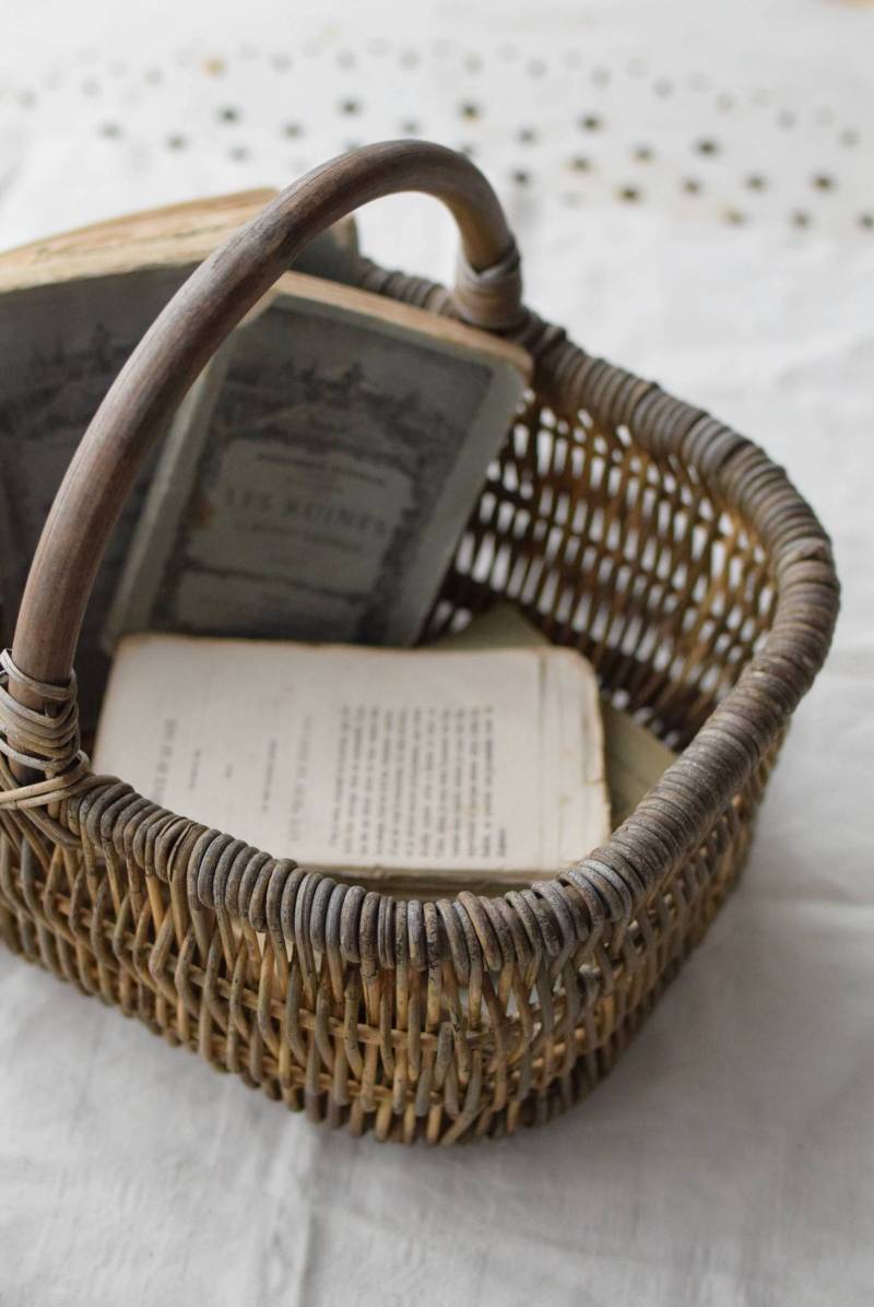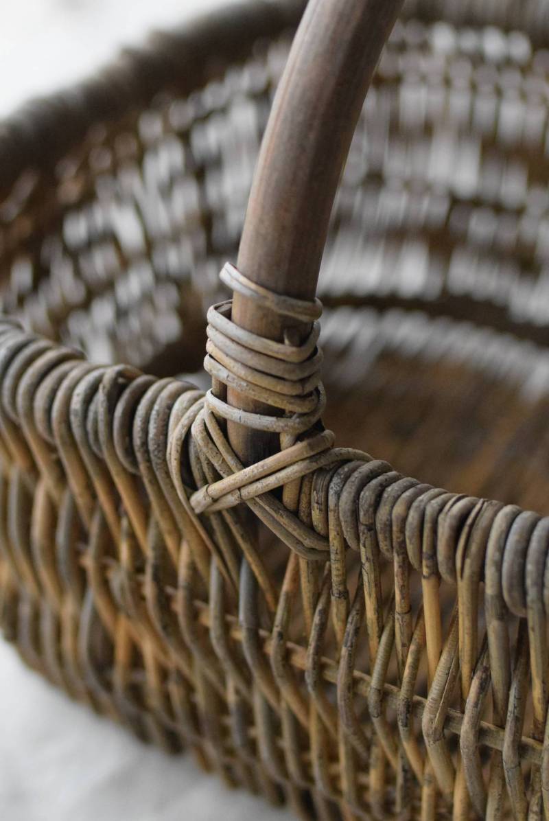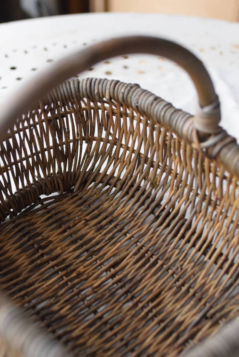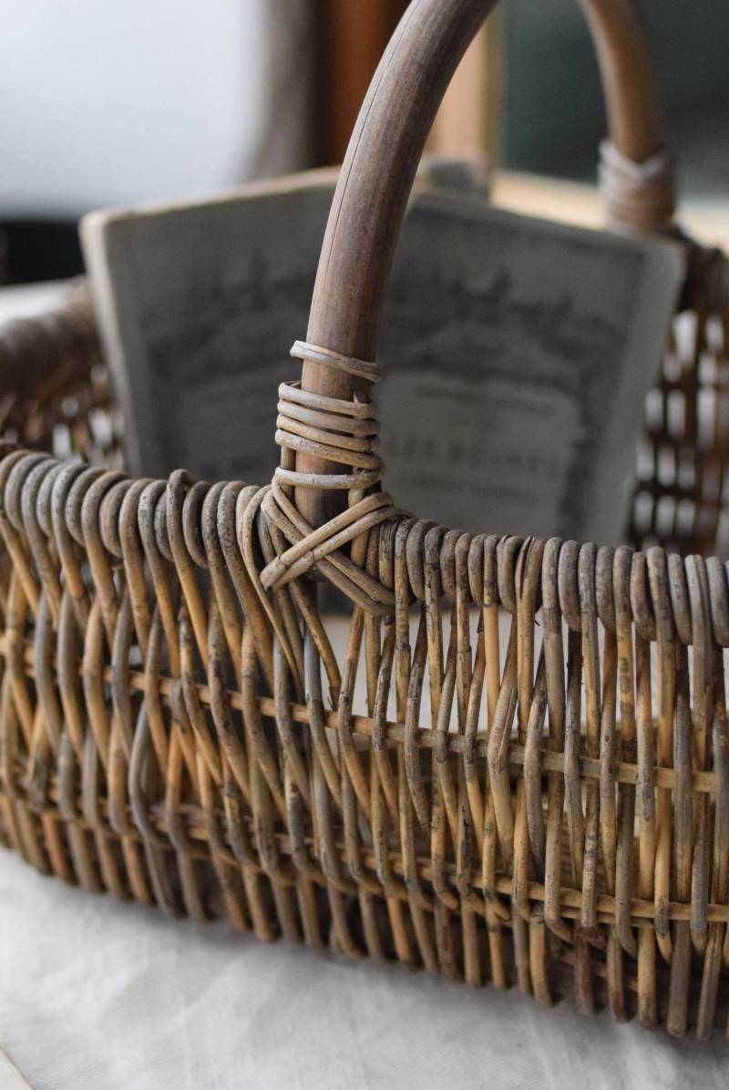 フランスのナチュラルバスケット。 味のある風合いが色濃く感じられる姿で、全体にグレーっぽい色合いですが、ところどころ元々の明るい籐の色が顔を覗かせ、アクセントになっています。素材をそのまま生かした素朴な木の持ち手も目を引きますね。長方形ながら、縁がぽってりと太く、全体に角が取れた丸みのある形状で、どこか親しみやすい優しいフォルム。サイズ感も小ぶりです。 意図的に着色された跡が残りますが、経年変化を経てさらに風合いを増し、独特の表情へと変化した個性的なアイテムです。 W 約27cm D 約21.5cm H 約21.5cm 深さ 約11cm