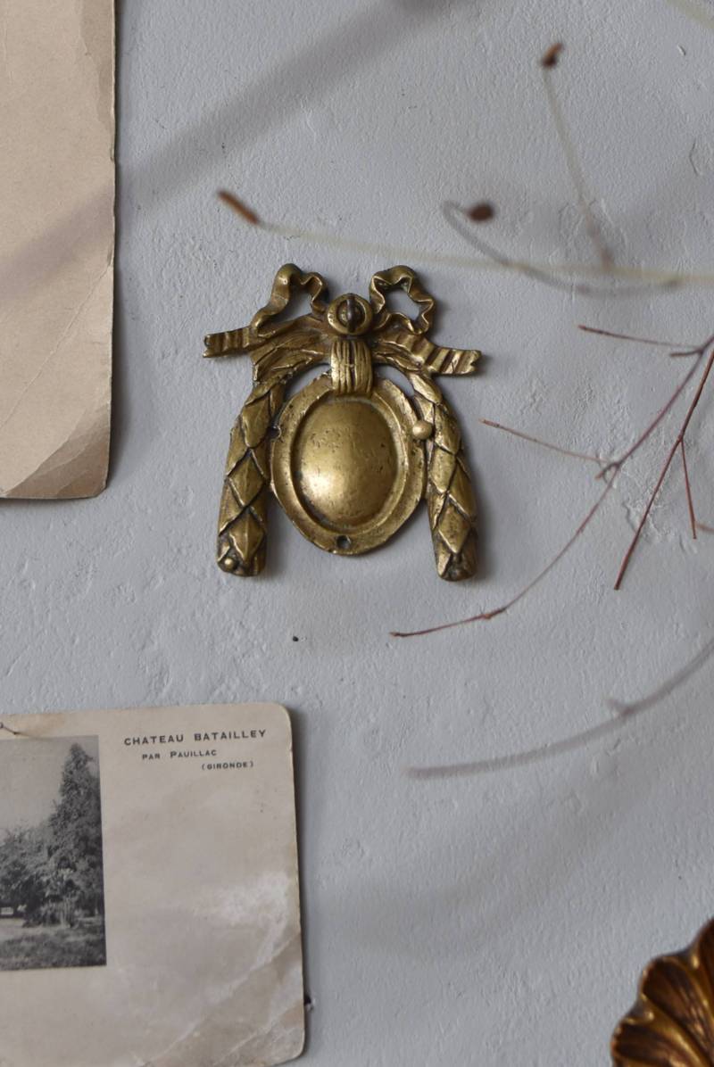 フランスの小さな装飾プレート。 中央のメダリオンをぶら下げたリボンモチーフが大きく施され、サイドにぽってりとたれ下がったボリュームのあるデザインが印象的です。上部には小さなフック金具が付いており、鍵やジュエリーなどを引っ掛けたりする事が出来ます。 真鍮ならではの品格のある雰囲気を感じられ、くすんだゴールドの色合いとなった上品かつシックな雰囲気を演出してくれそうです。壁に固定する為の釘2本が付属します。 W 約7cm D 約2cm H 約8.5cm