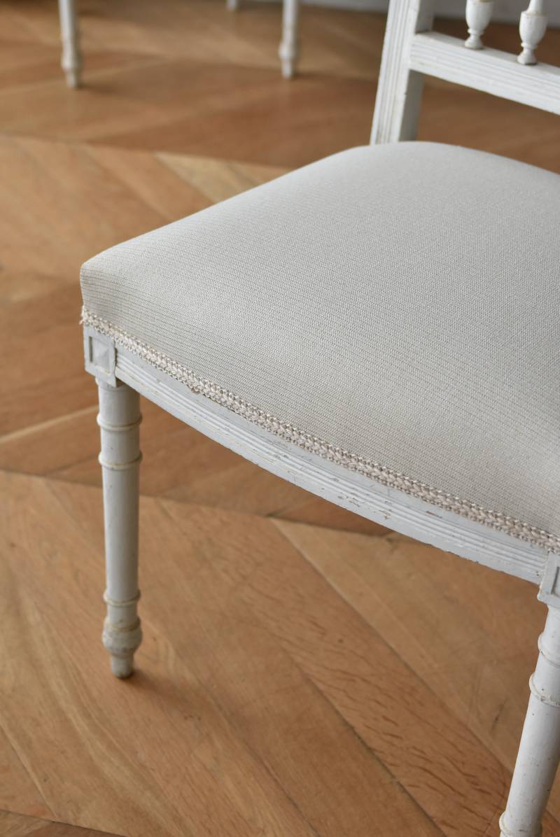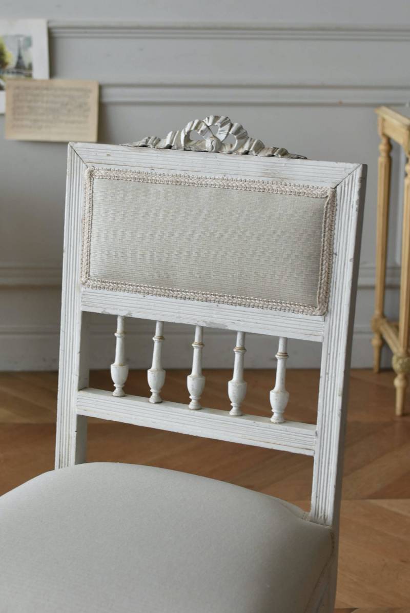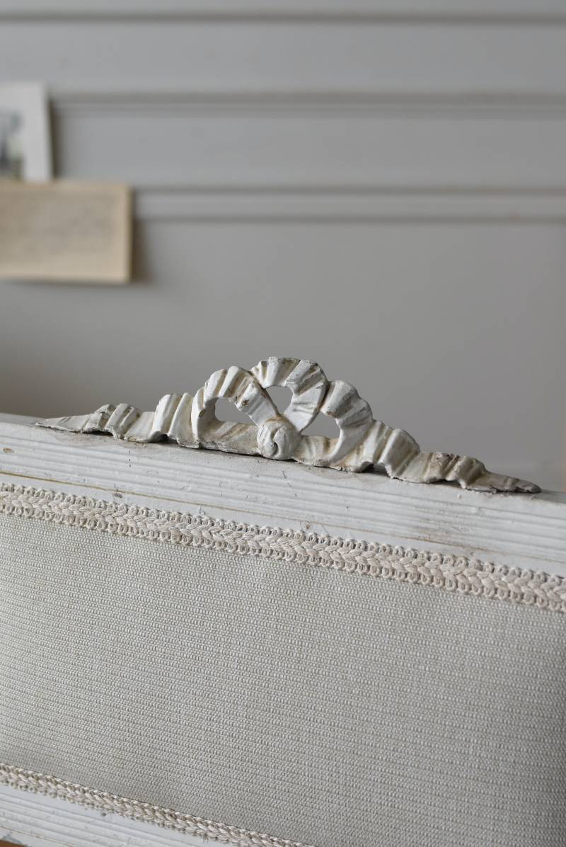 直線を基調とした端正なシルエットが魅力で、上品なホワイトカラーが清楚な印象をもたらしてくれる佇まい。背もたれのトップには繊細なリボンレリーフがあしらわれた優美な姿で、ずらりと並ぶ小さなバルスター装飾に抜け感と格式高さを感じられるエレガントなデザインです。