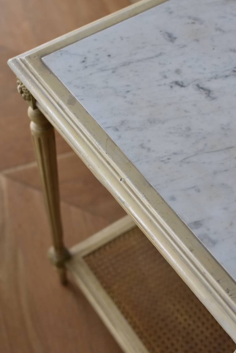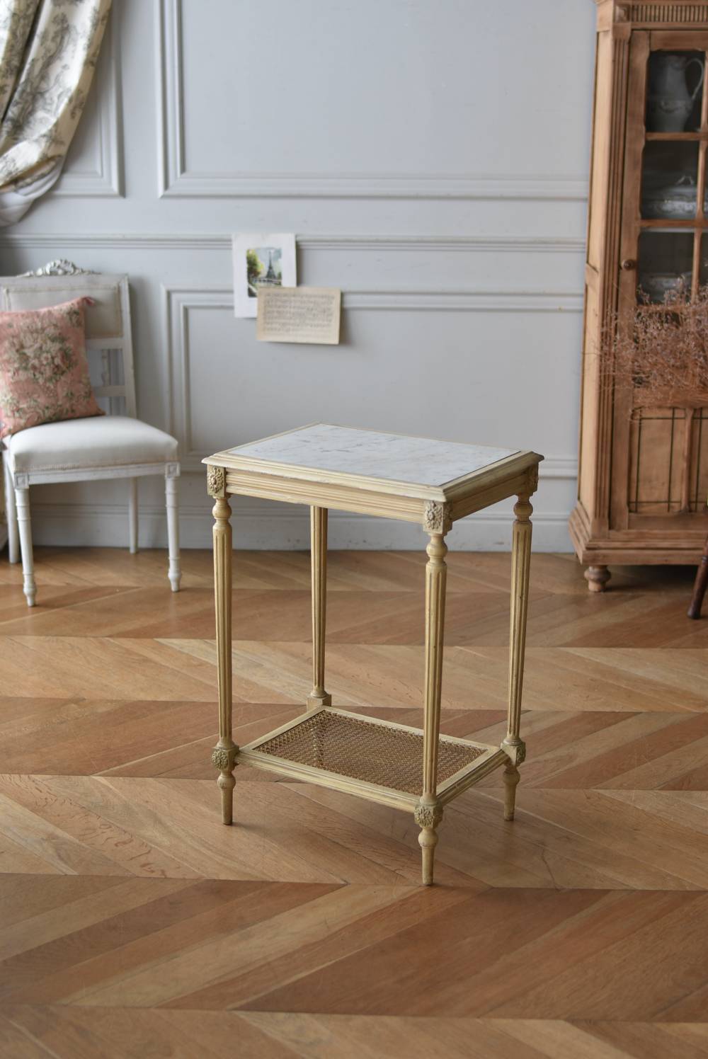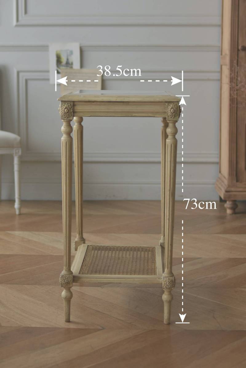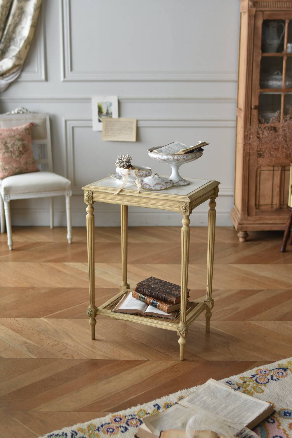 温かみのあるクリームカラーでペイントされたボディに、ホワイトを基調としたマーブルストーン(大理石)の組み合わせが優しげながらも凛とした美しさを感じられる佇まい。四隅や脚元には細やかな小花レリーフがあしらわれ、甘すぎず程よいバランスのクラシカルなデザインとなっています。すらりとした脚元とラタン製の棚が抜け感と軽やかさを演出し、お気に入りの洋書や小物のディスプレイも楽しめる構造に。