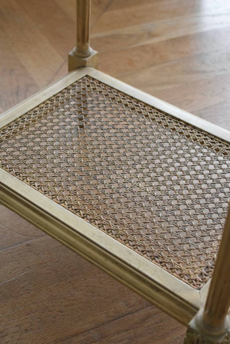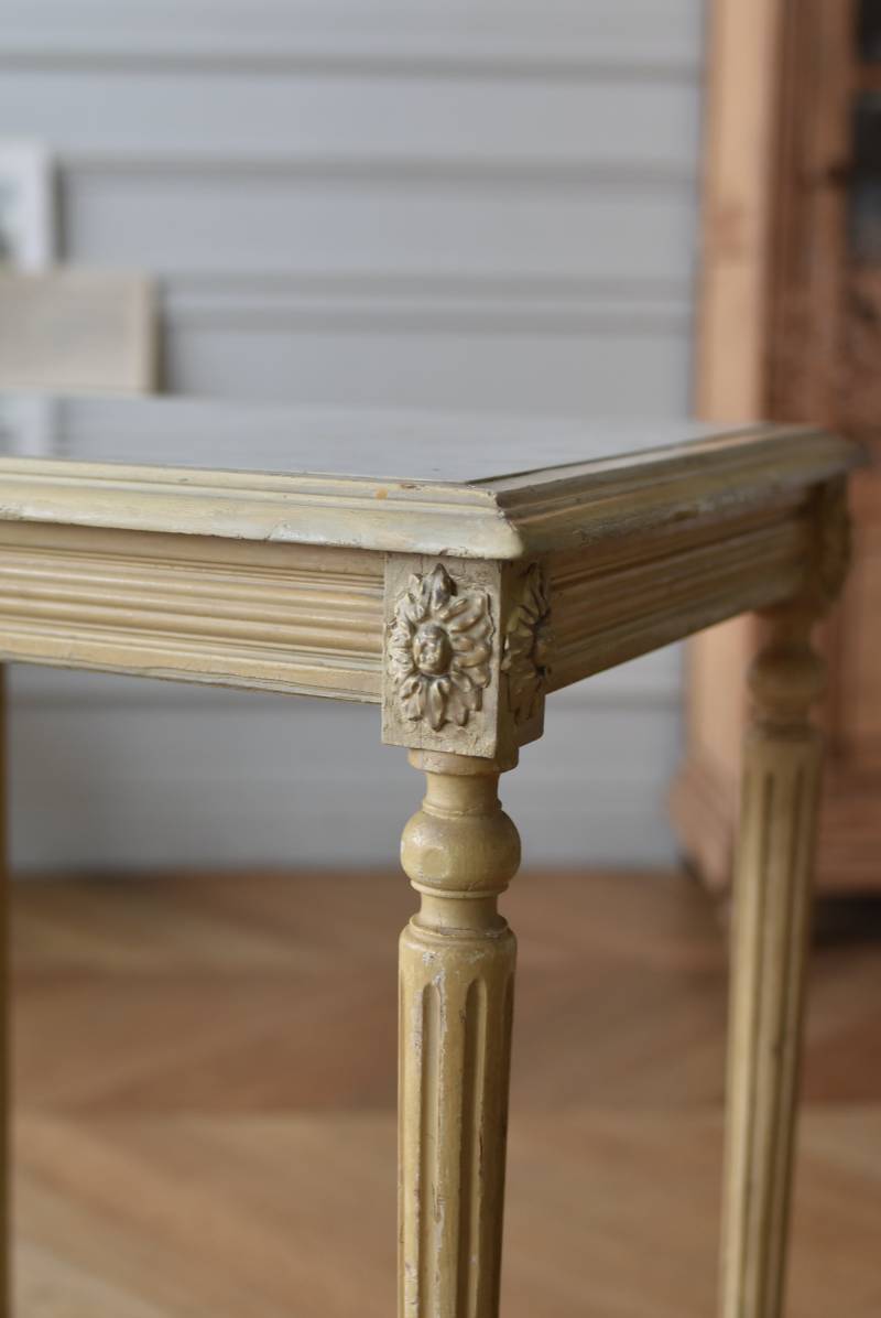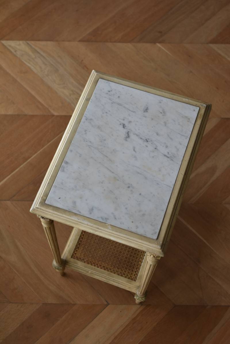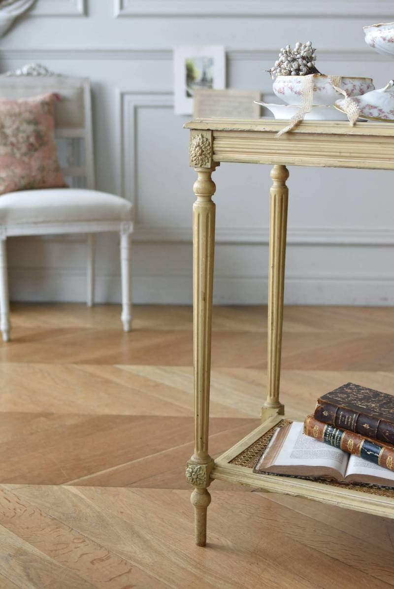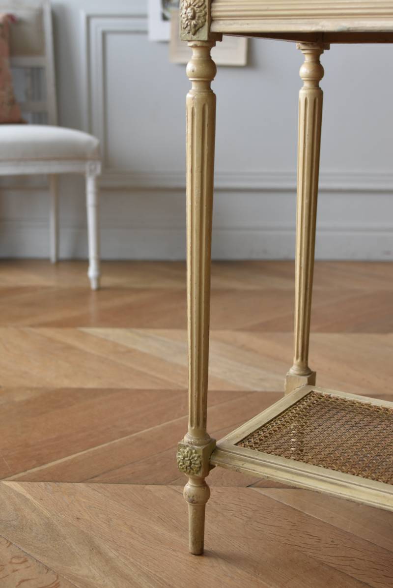 温かみのあるクリームカラーでペイントされたボディに、ホワイトを基調としたマーブルストーン(大理石)の組み合わせが優しげながらも凛とした美しさを感じられる佇まい。四隅や脚元には細やかな小花レリーフがあしらわれ、甘すぎず程よいバランスのクラシカルなデザインとなっています。すらりとした脚元とラタン製の棚が抜け感と軽やかさを演出し、お気に入りの洋書や小物のディスプレイも楽しめる構造に。