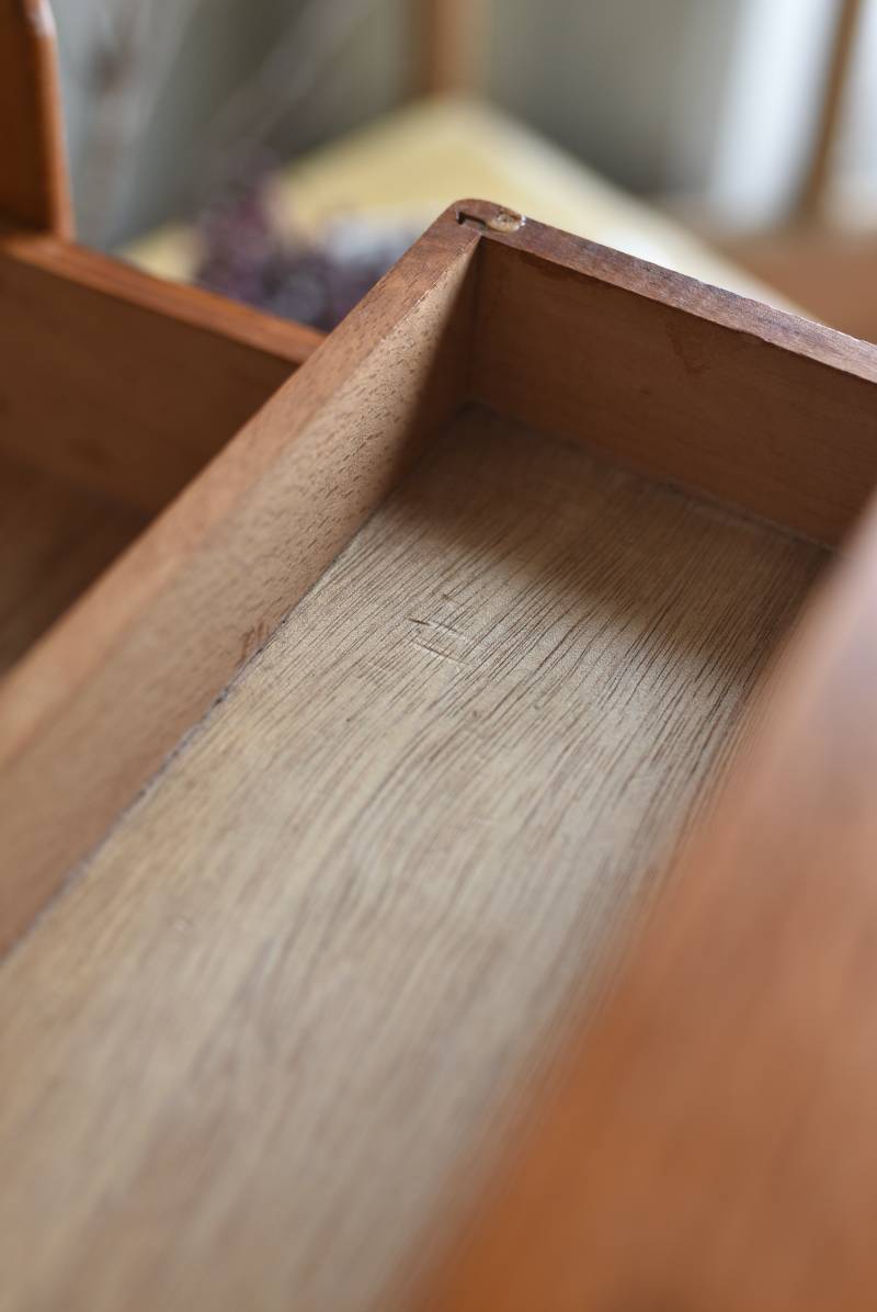 木の温もりを感じさせてくれる明るめのブラウンカラーが優しげで、ナチュラルテイストな空間に映える佇まい。しなやかな曲線を描く猫脚が美しく優美な姿となっており、軽やかな印象ももたらしてくれるデザインです。左右に大きく階段上に開き、細かなものの出し入れもしやすい構造に。