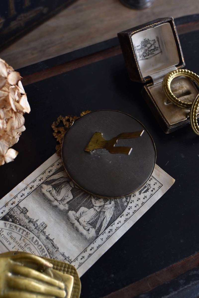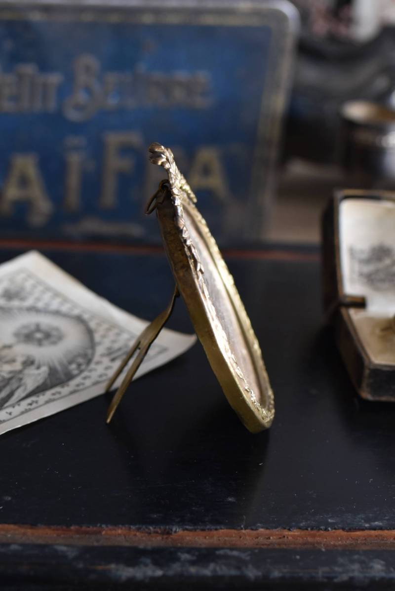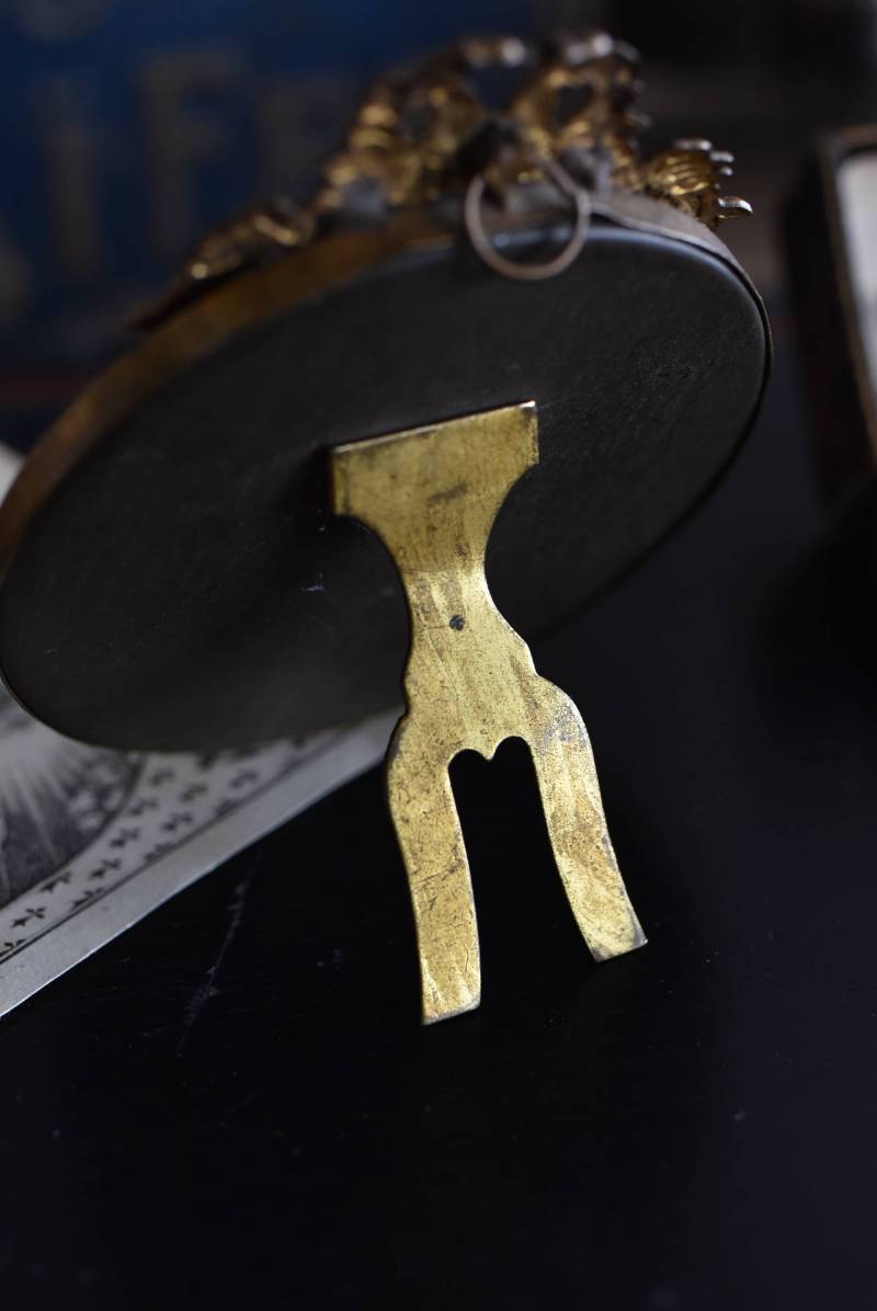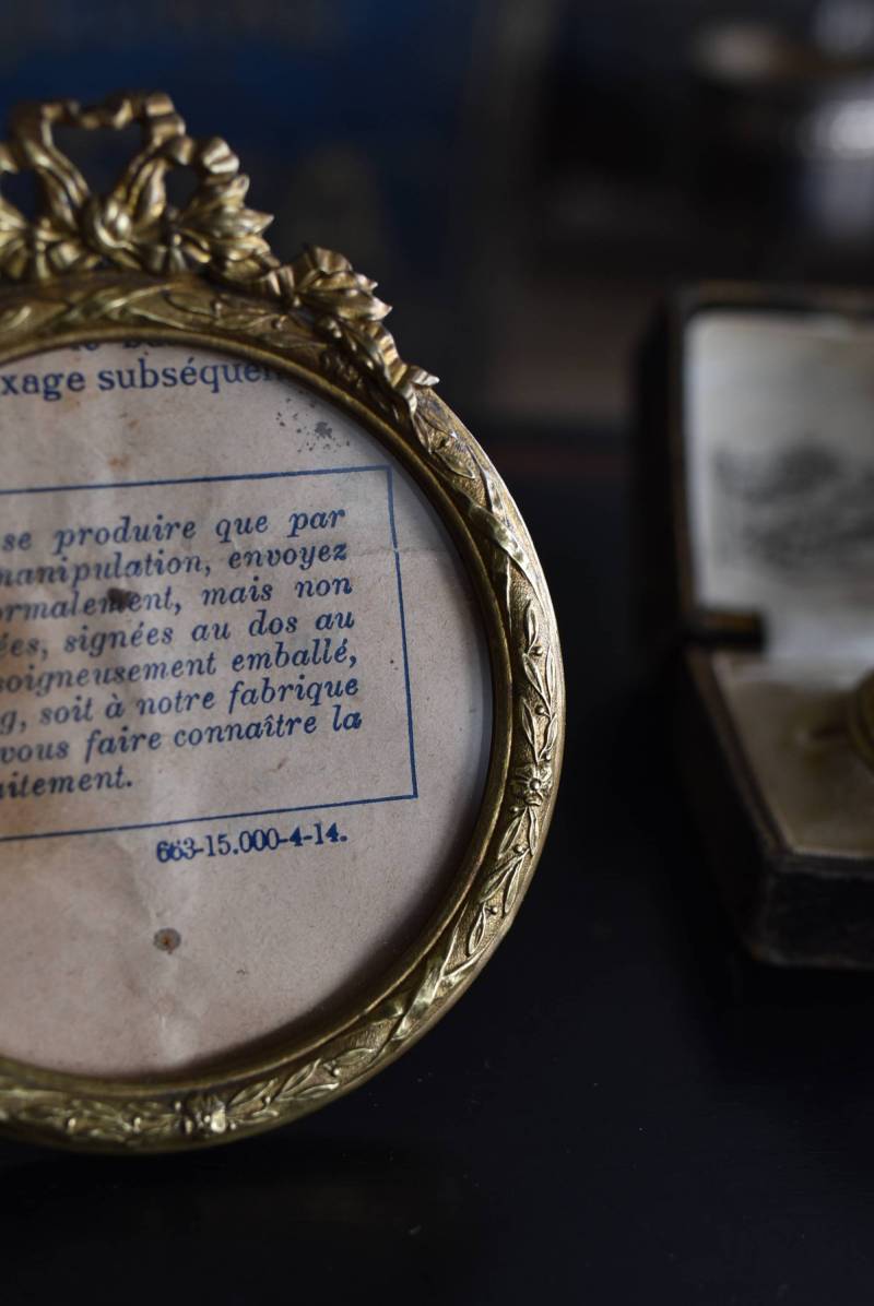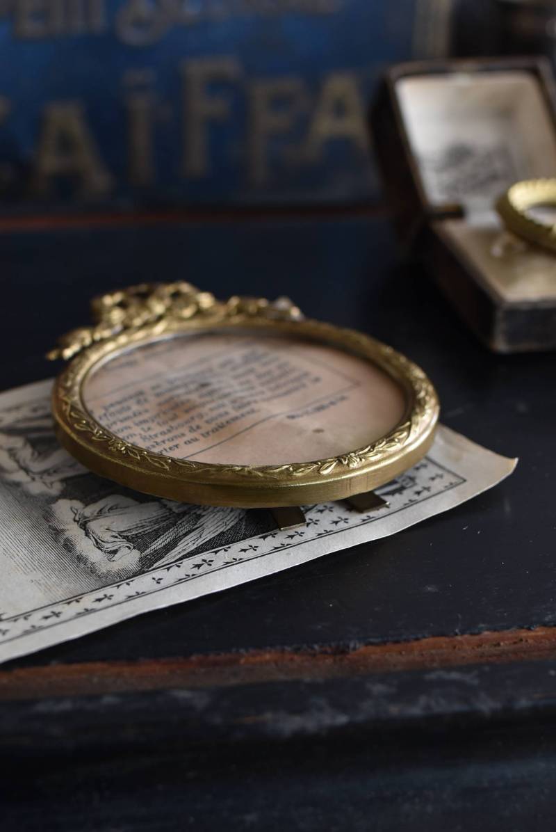 手のひらサイズとなったフランスのフォトフレーム。 月桂樹とリボンが合わさった繊細な装飾が施され、風にそよめいたような動きのある姿となり、小さな宝物のような丁寧な造形にうっとりさせられます。ころんとまんまるいシルエットになった可愛らしさと、真鍮プレートならではの深みのあるシックさを兼ね備わった佇まいです。 古いものですので歪みなどはありますが、置き型・壁掛けどちらでも楽しめる金具が付いており、小ぶりながらも優雅に彩ってくれそうです。 W 約6.7cm D 約4.5cm H 約7.5cm スタンド折り畳み時 D約1.2cm