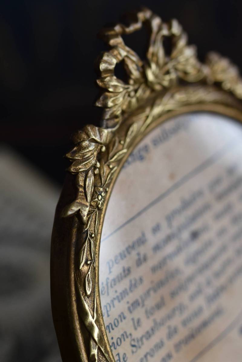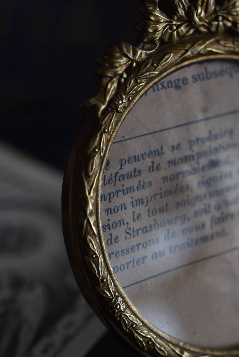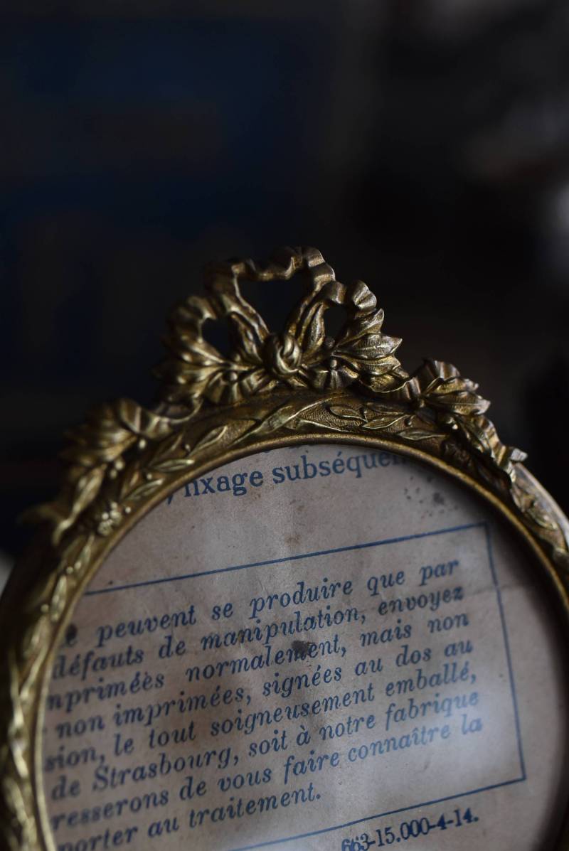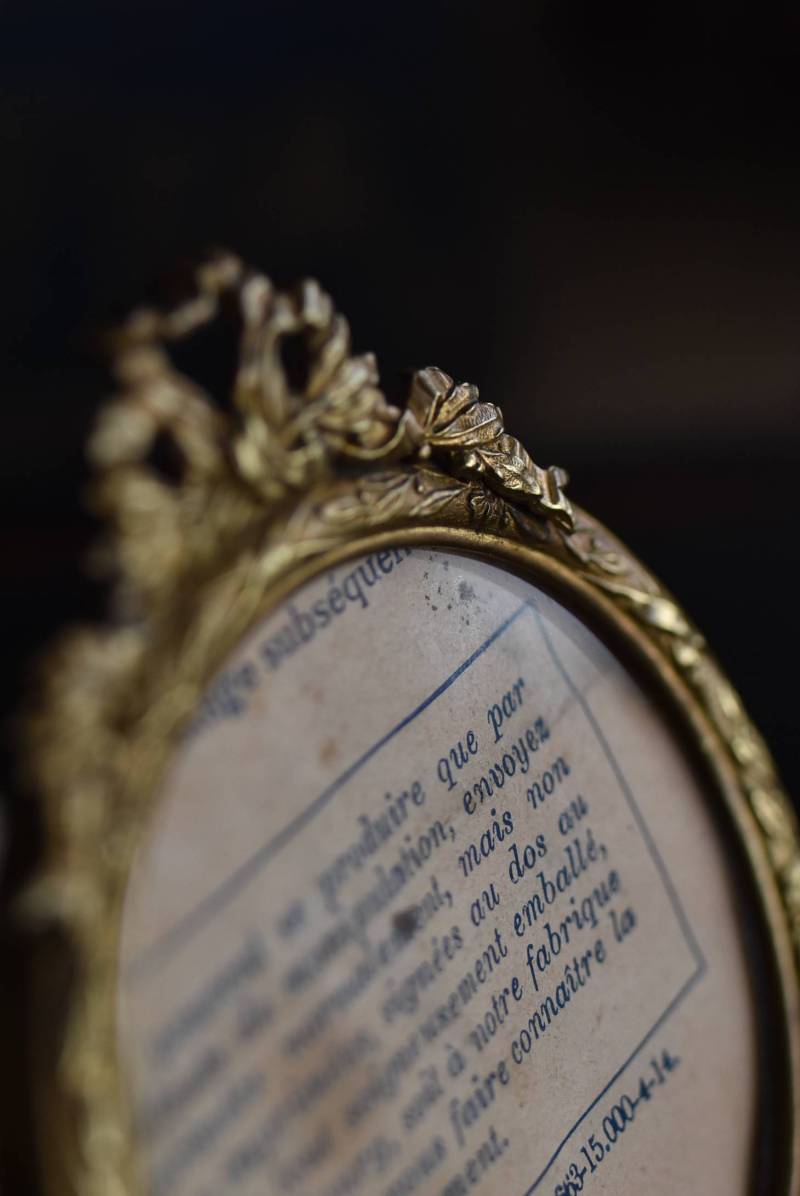 手のひらサイズとなったフランスのフォトフレーム。 月桂樹とリボンが合わさった繊細な装飾が施され、風にそよめいたような動きのある姿となり、小さな宝物のような丁寧な造形にうっとりさせられます。ころんとまんまるいシルエットになった可愛らしさと、真鍮プレートならではの深みのあるシックさを兼ね備わった佇まいです。 古いものですので歪みなどはありますが、置き型・壁掛けどちらでも楽しめる金具が付いており、小ぶりながらも優雅に彩ってくれそうです。 W 約6.7cm D 約4.5cm H 約7.5cm スタンド折り畳み時 D約1.2cm