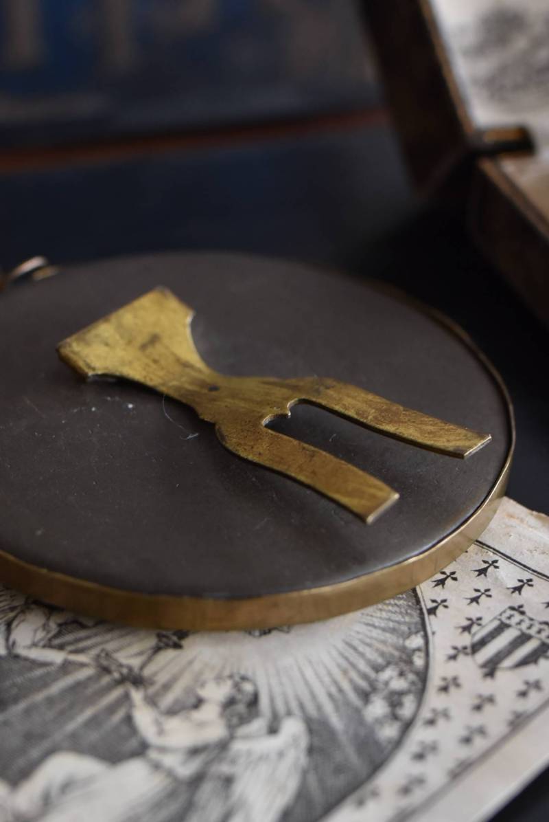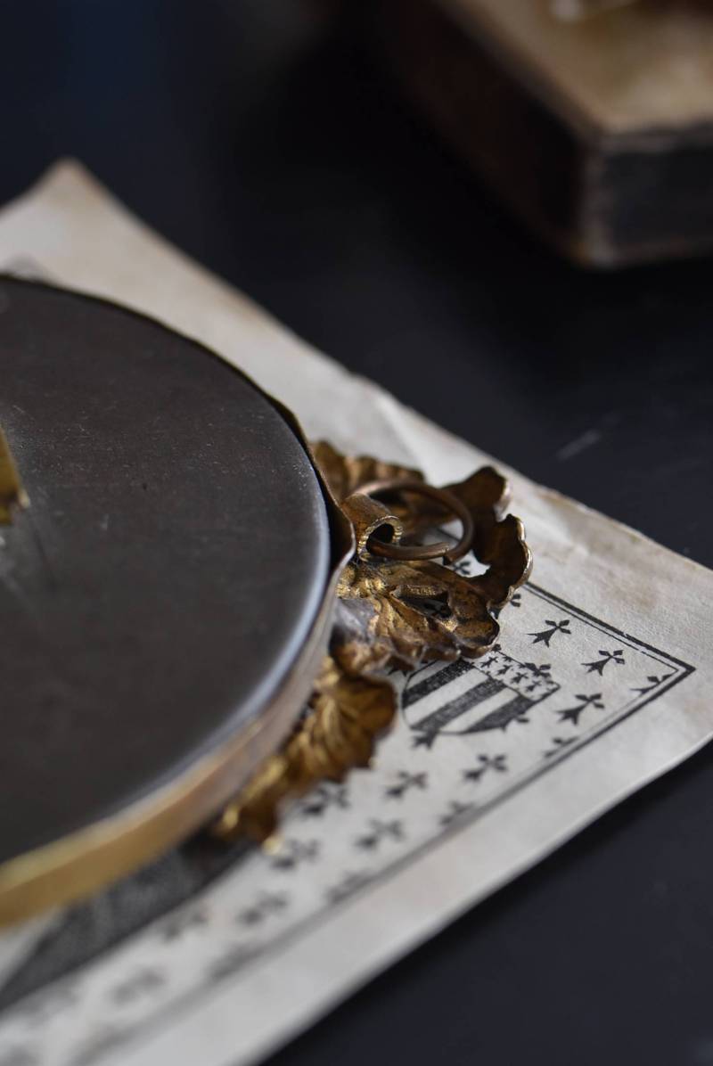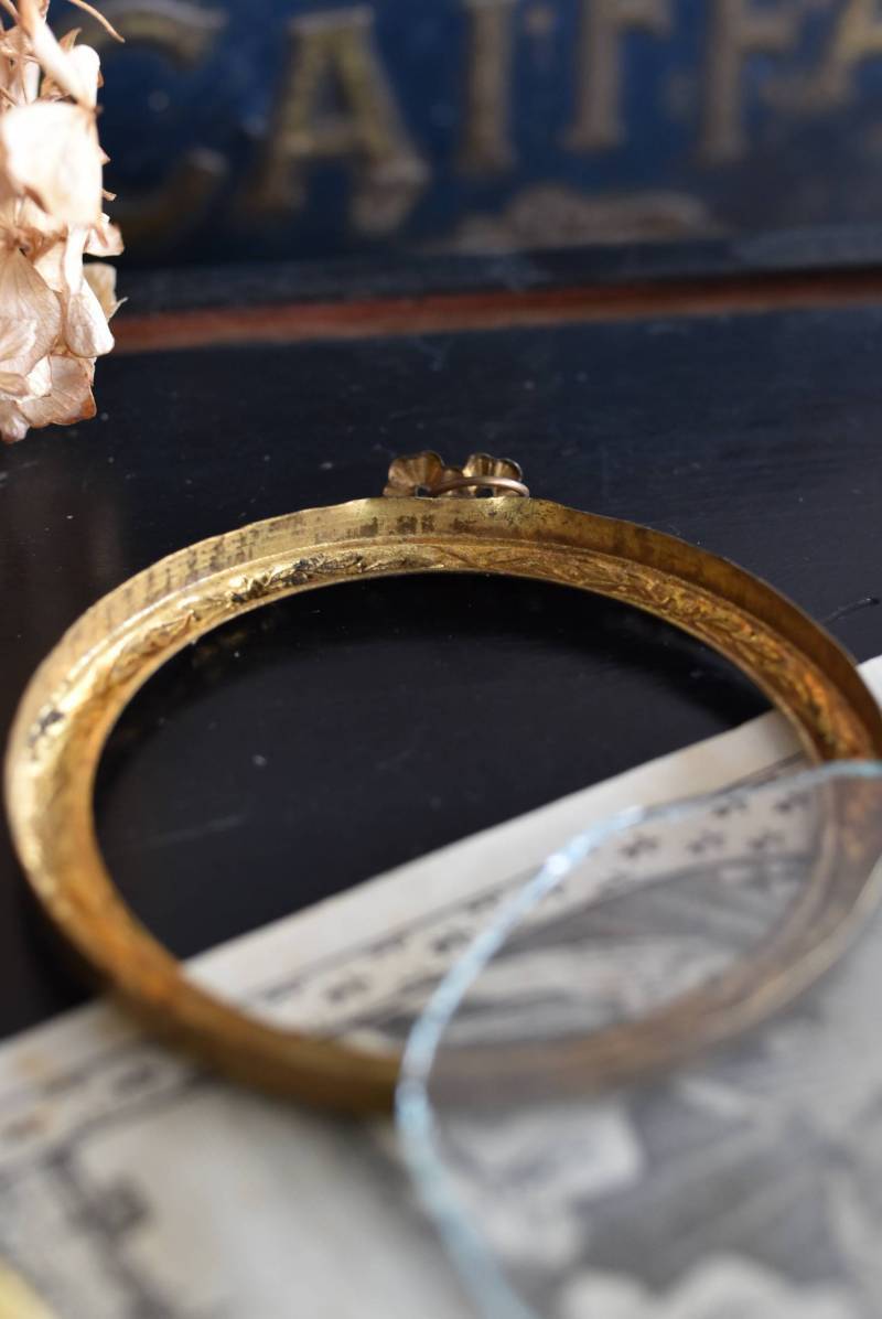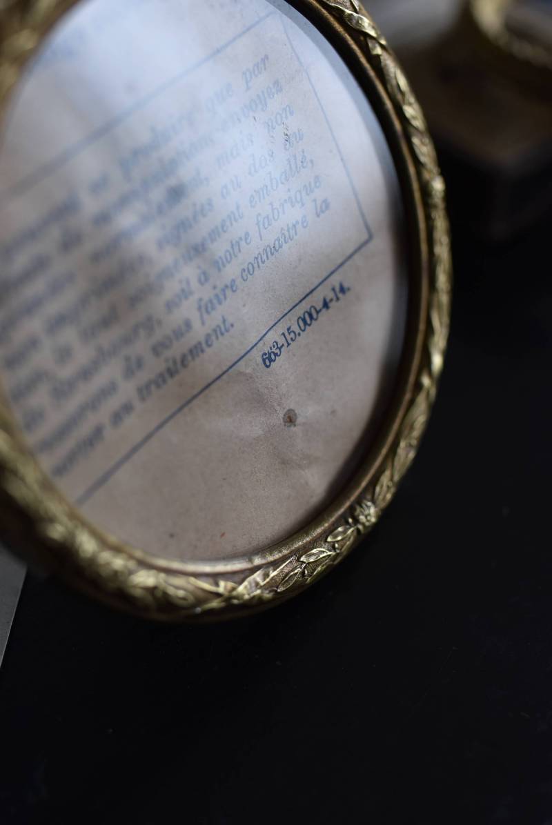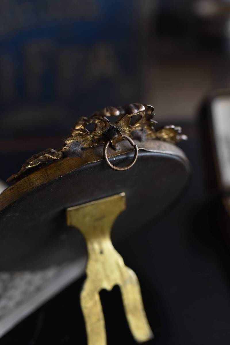 手のひらサイズとなったフランスのフォトフレーム。 月桂樹とリボンが合わさった繊細な装飾が施され、風にそよめいたような動きのある姿となり、小さな宝物のような丁寧な造形にうっとりさせられます。ころんとまんまるいシルエットになった可愛らしさと、真鍮プレートならではの深みのあるシックさを兼ね備わった佇まいです。 古いものですので歪みなどはありますが、置き型・壁掛けどちらでも楽しめる金具が付いており、小ぶりながらも優雅に彩ってくれそうです。 W 約6.7cm D 約4.5cm H 約7.5cm スタンド折り畳み時 D約1.2cm