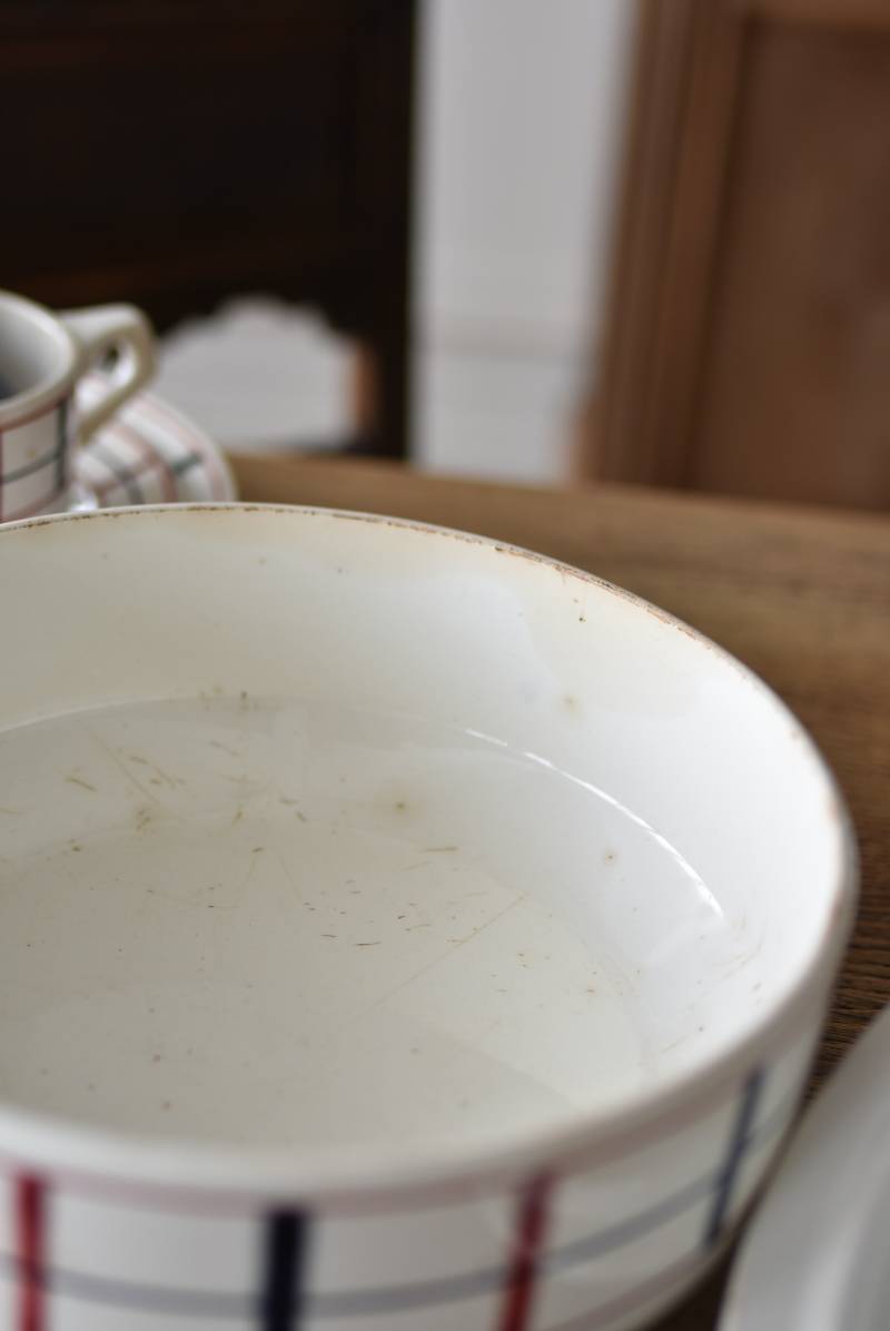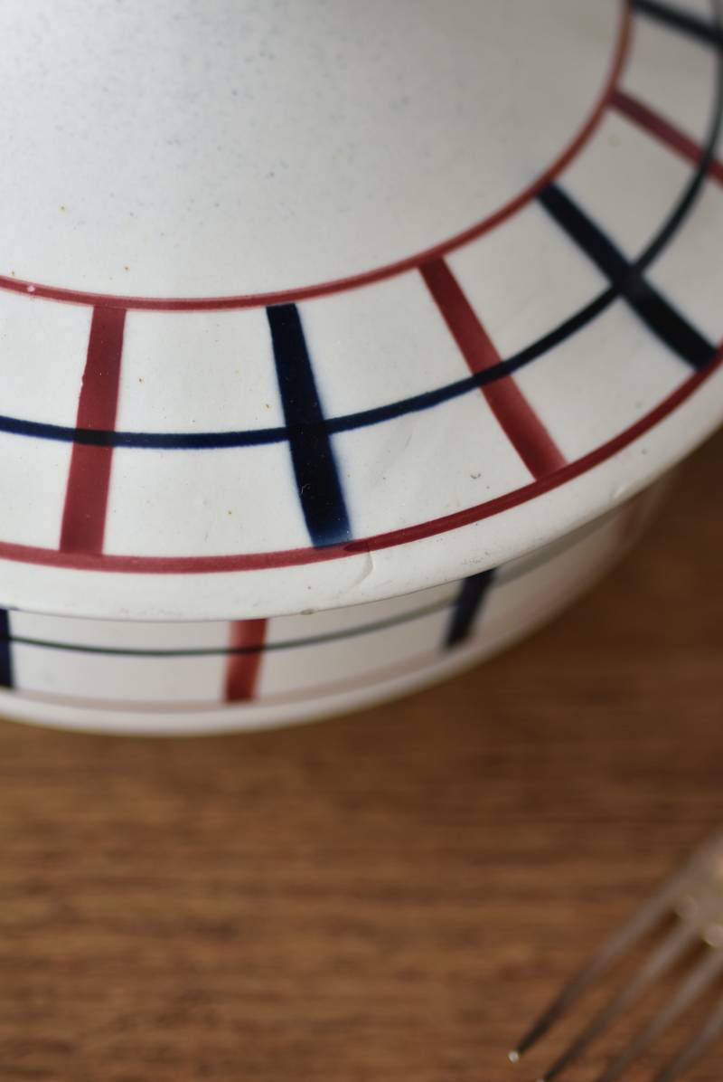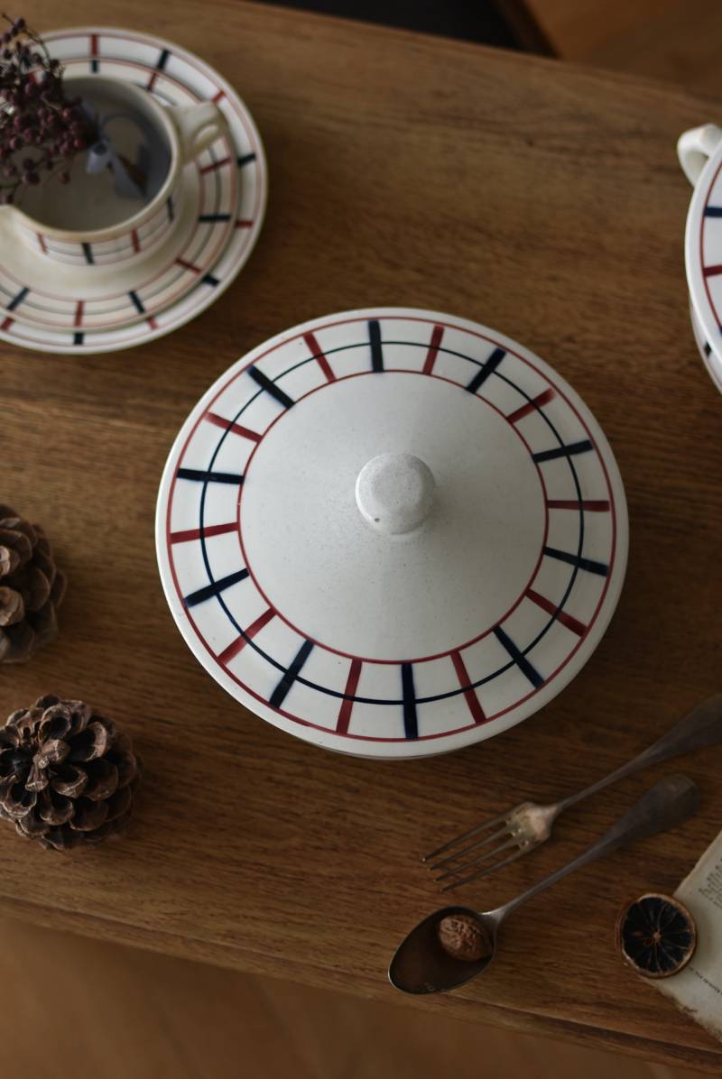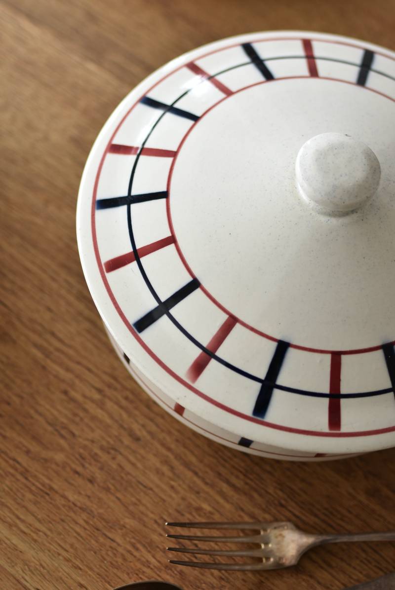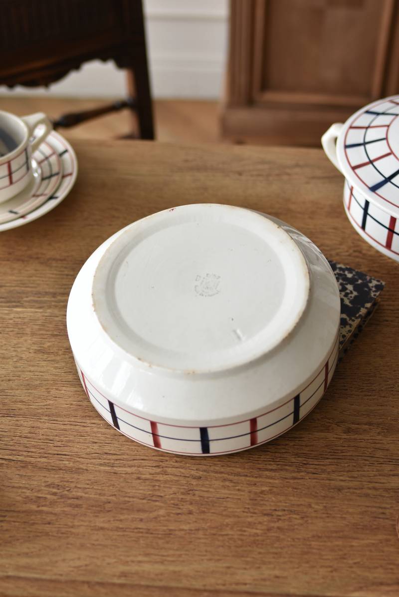 フランス・St.Amand(サンタマン)のスーピエール。 艶やかなボディは温かみのあるミルクカラーで、やや角ばったシルエットが特徴的な佇まい。バスク地方の伝統的な建築からインスピレーションを得た"Lou Basquez"シリーズのもので、赤と濃紺のバスクカラーで表現された手描きラインがほっこりとした優しげな雰囲気のデザインです。使い込まれた趣豊かな風合いがテーブルコーディネートに深みを与えてくれる一品に。 独自の存在感が目を惹くどこか素朴な姿で、コレクターも多いアイコニックなアイテムです。(Lou Basquezシリーズ) 直径 約26cm H 約14cm 口径 約22.5cm 深さ 約8cm