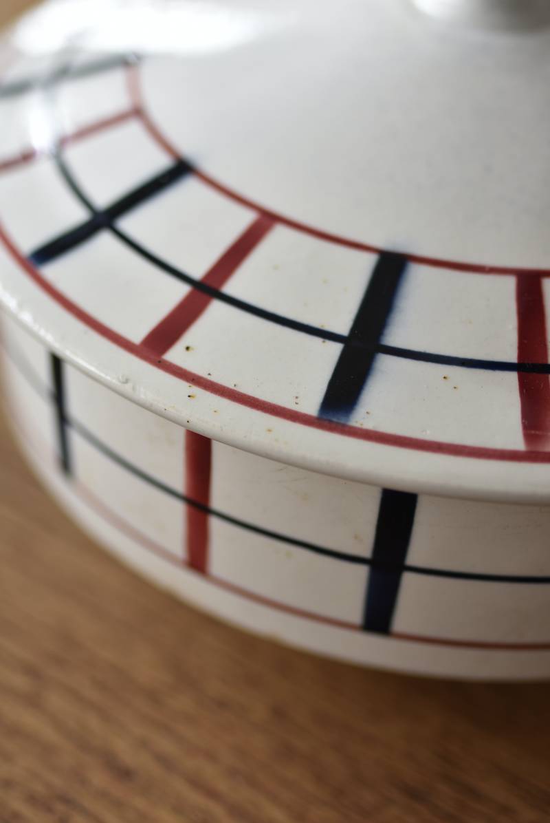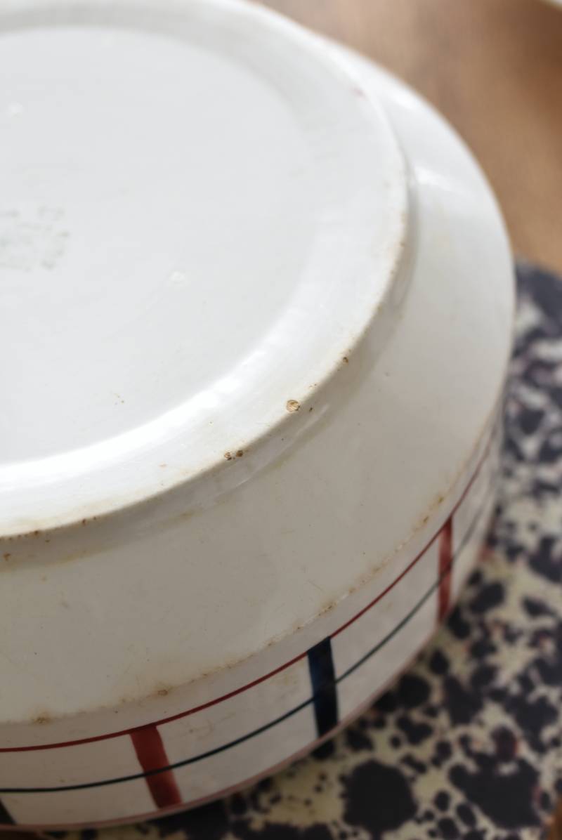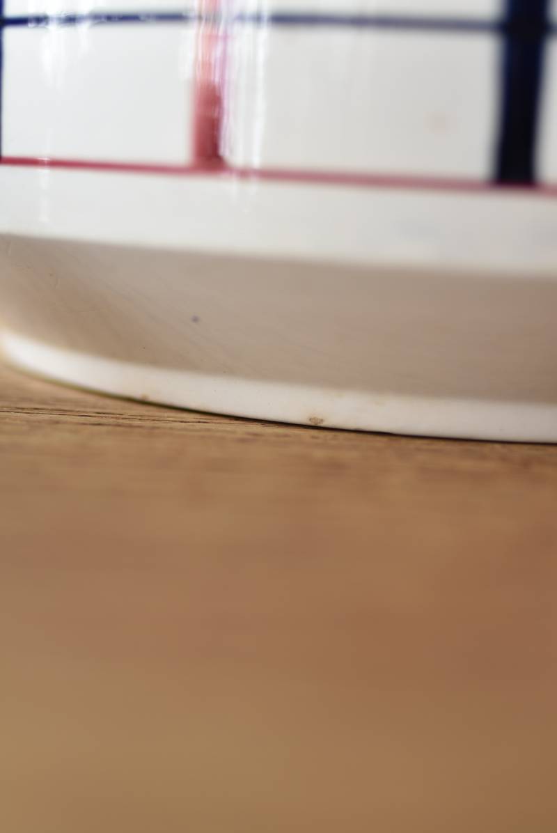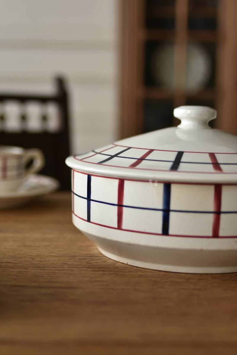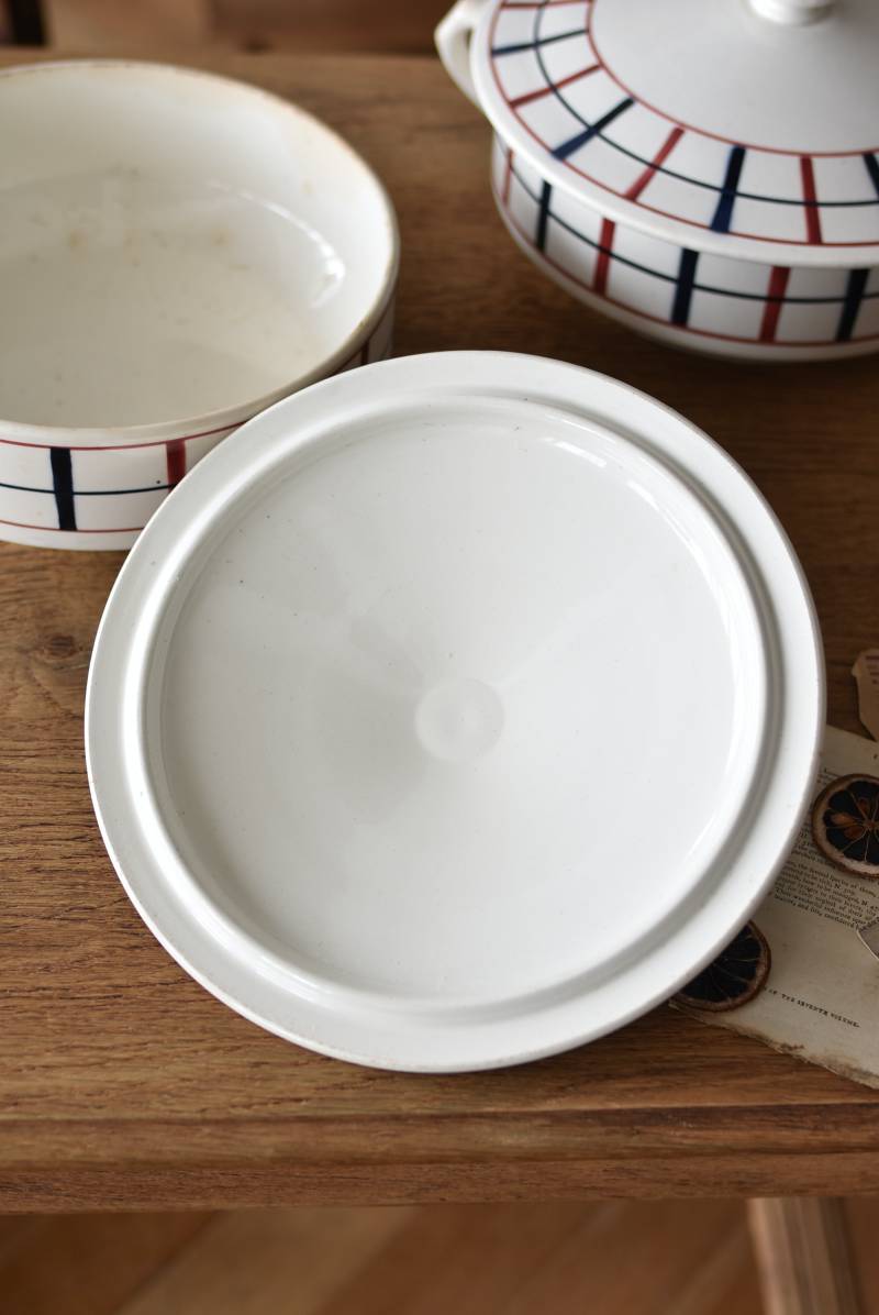 フランス・St.Amand(サンタマン)のスーピエール。 艶やかなボディは温かみのあるミルクカラーで、やや角ばったシルエットが特徴的な佇まい。バスク地方の伝統的な建築からインスピレーションを得た"Lou Basquez"シリーズのもので、赤と濃紺のバスクカラーで表現された手描きラインがほっこりとした優しげな雰囲気のデザインです。使い込まれた趣豊かな風合いがテーブルコーディネートに深みを与えてくれる一品に。 独自の存在感が目を惹くどこか素朴な姿で、コレクターも多いアイコニックなアイテムです。(Lou Basquezシリーズ) 直径 約26cm H 約14cm 口径 約22.5cm 深さ 約8cm
