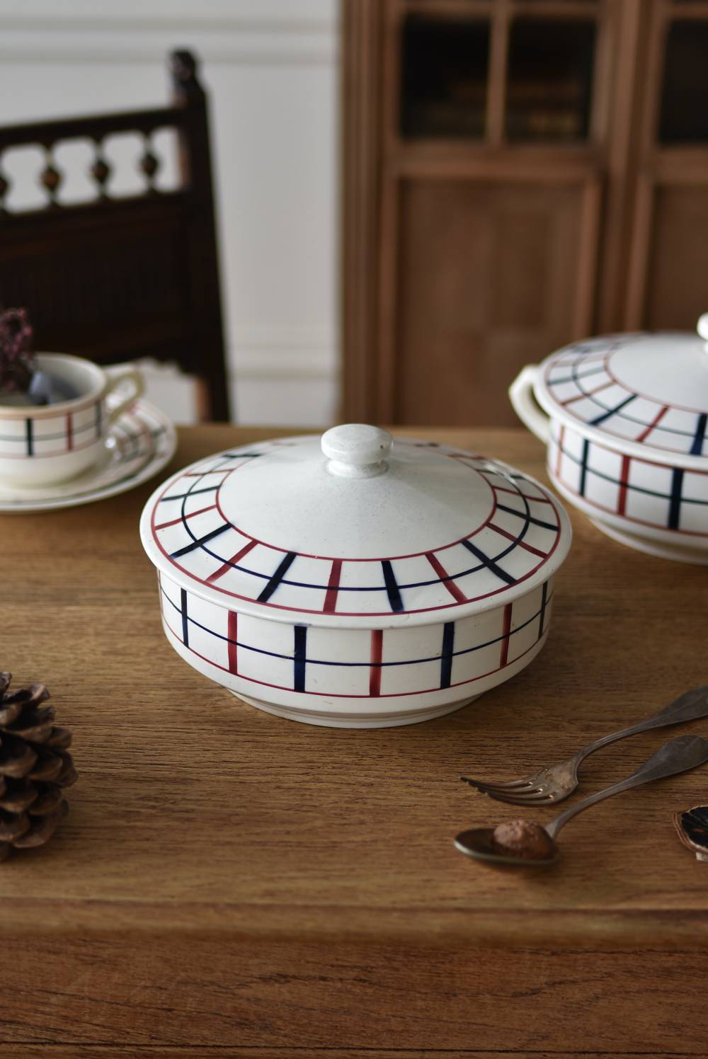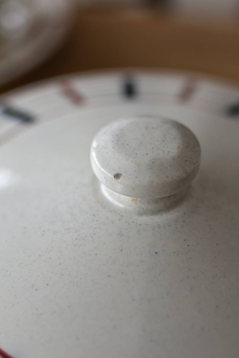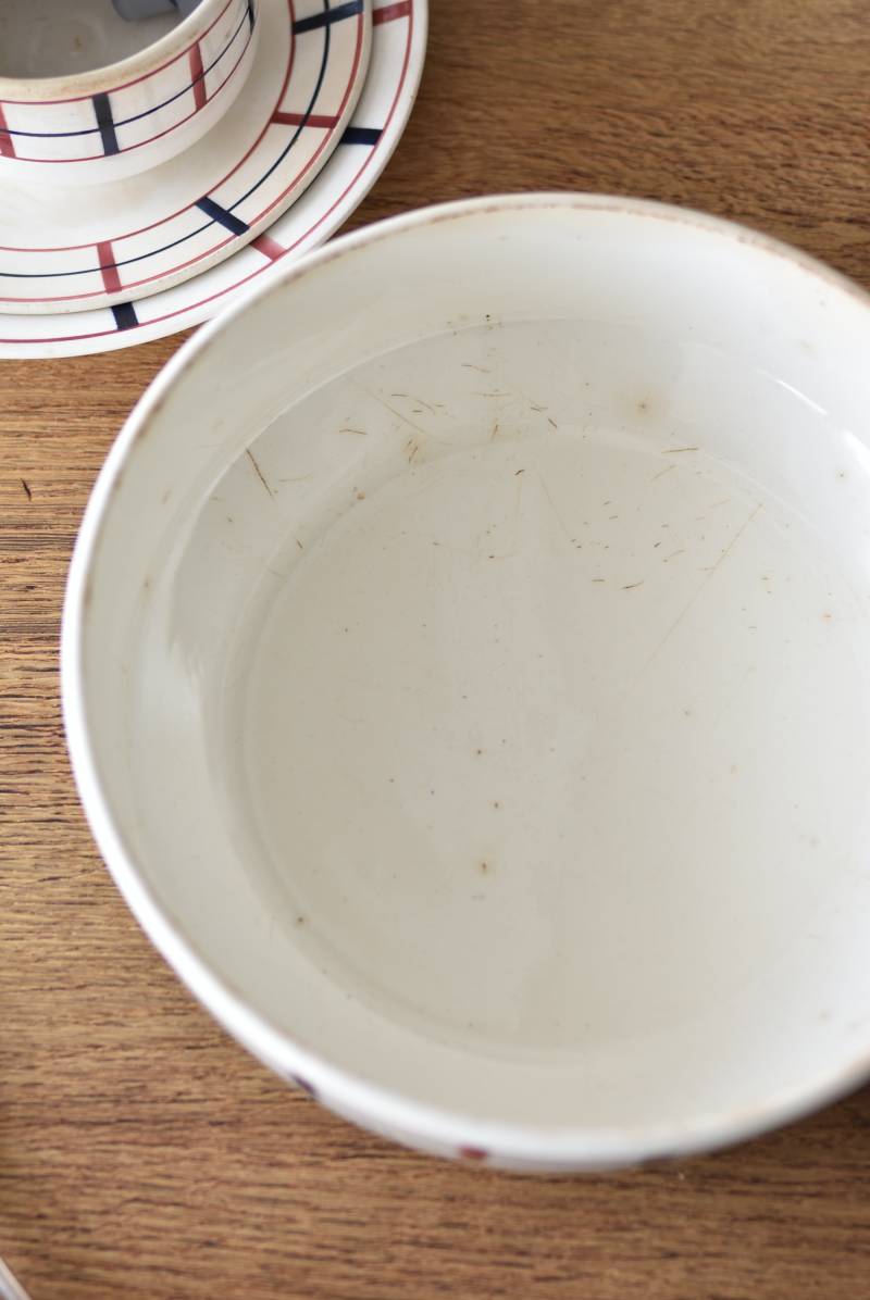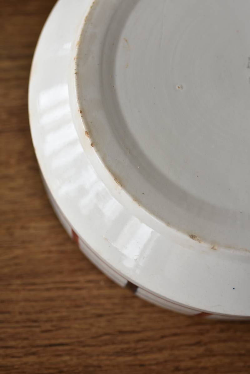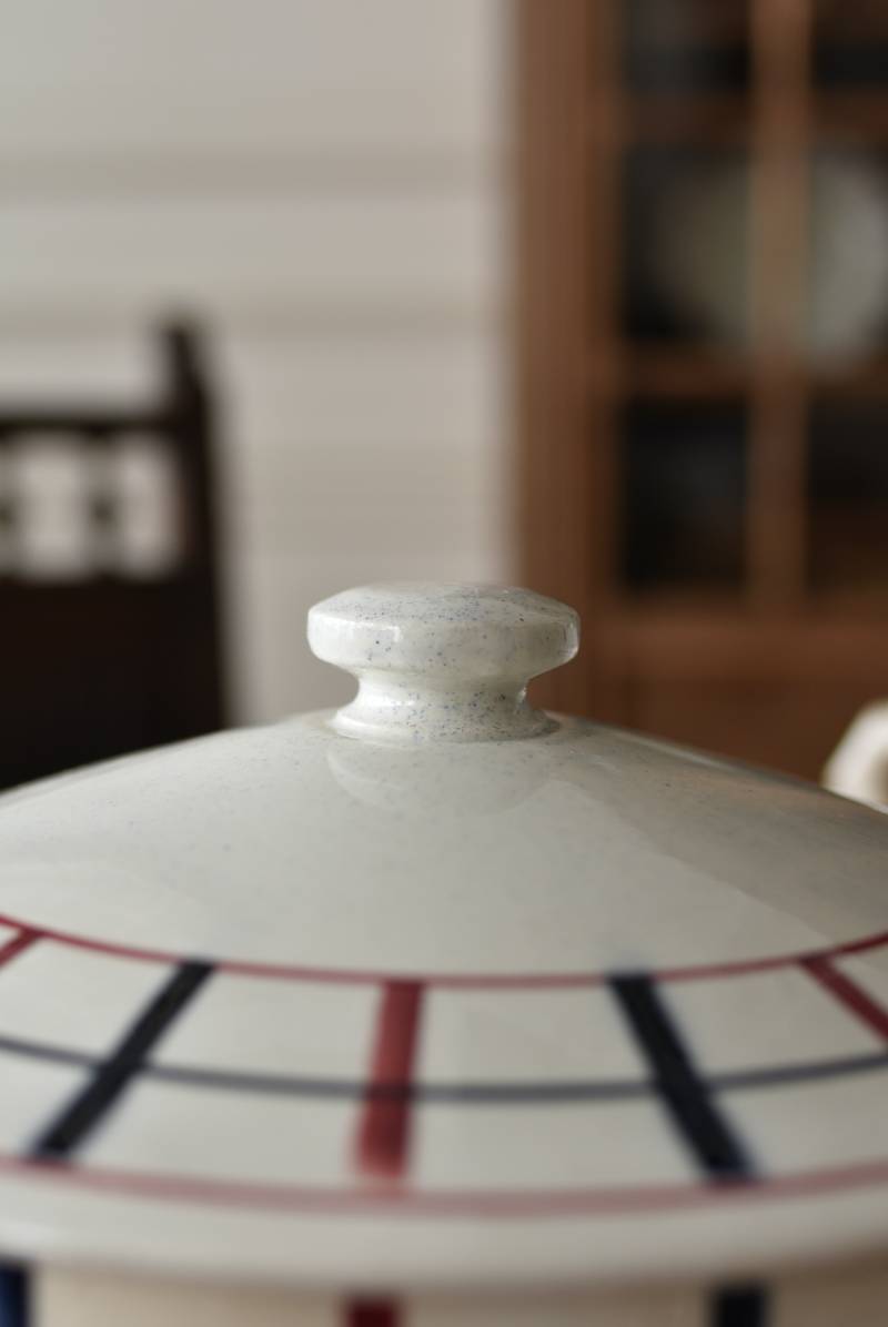 フランス・St.Amand(サンタマン)のスーピエール。 艶やかなボディは温かみのあるミルクカラーで、やや角ばったシルエットが特徴的な佇まい。バスク地方の伝統的な建築からインスピレーションを得た"Lou Basquez"シリーズのもので、赤と濃紺のバスクカラーで表現された手描きラインがほっこりとした優しげな雰囲気のデザインです。使い込まれた趣豊かな風合いがテーブルコーディネートに深みを与えてくれる一品に。 独自の存在感が目を惹くどこか素朴な姿で、コレクターも多いアイコニックなアイテムです。(Lou Basquezシリーズ) 直径 約26cm H 約14cm 口径 約22.5cm 深さ 約8cm