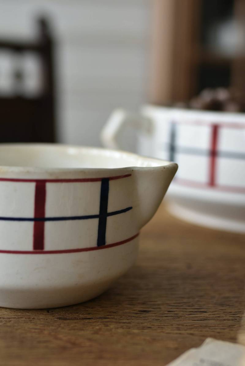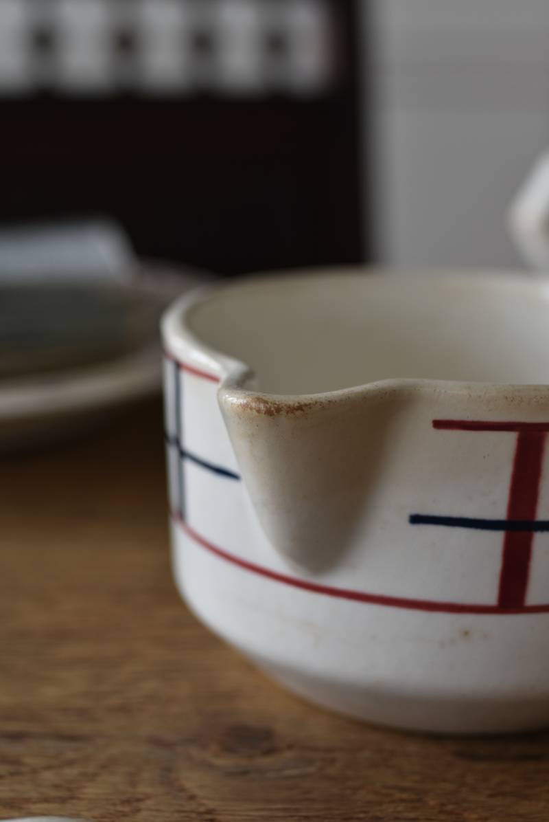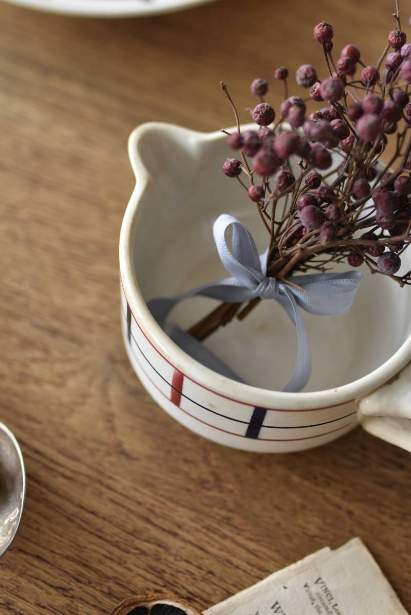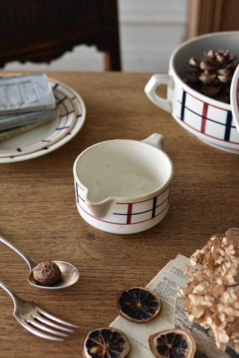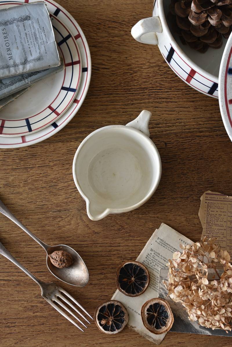フランス・St.Amand(サンタマン)のミルクポット。 艶やかなボディは温かみのあるミルクカラーで、小さな注ぎ口とハンドルがあしらわれた可愛らしい佇まい。バスク地方の伝統的な建築からインスピレーションを得た"Lou Basquez"シリーズのもので、赤と濃紺のバスクカラーで表現された手描きラインがほっこりとした優しげな雰囲気のデザインです。使い込まれた趣豊かな風合いがテーブルコーディネートに深みを与えてくれる一品に。 独自の存在感が目を惹くどこか素朴な姿で、コレクターも多いアイコニックなアイテムです。(Lou Basquezシリーズ) W 約16cm D 約11.3cm H 約6.8cm