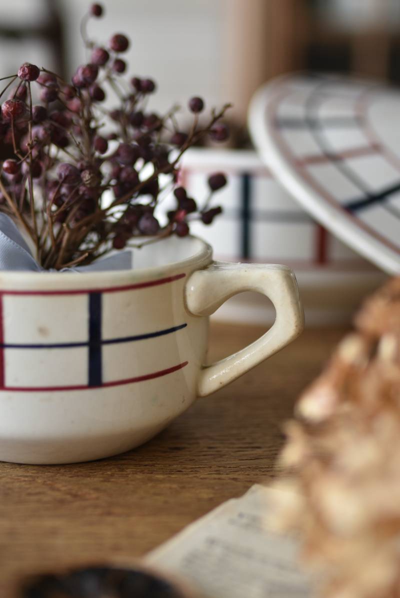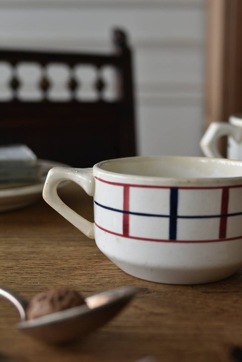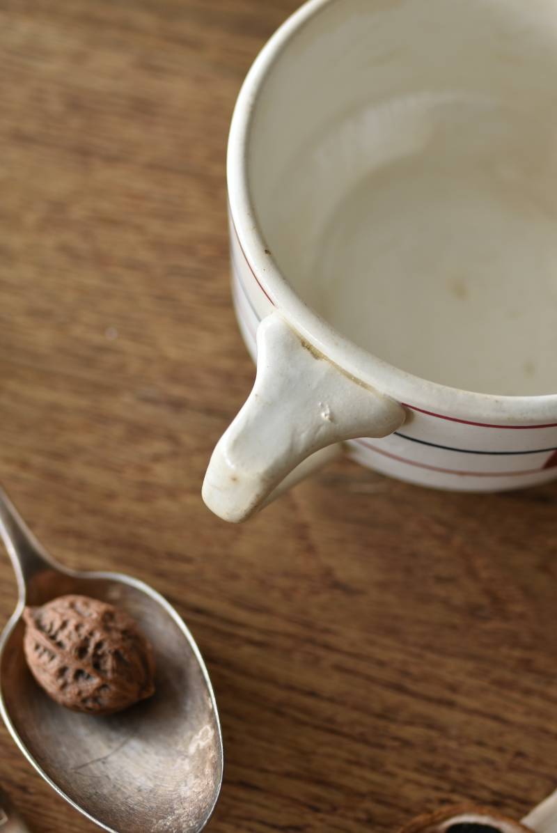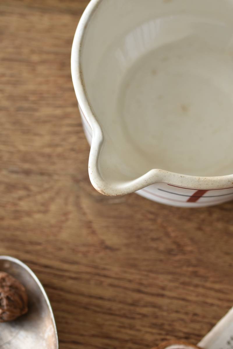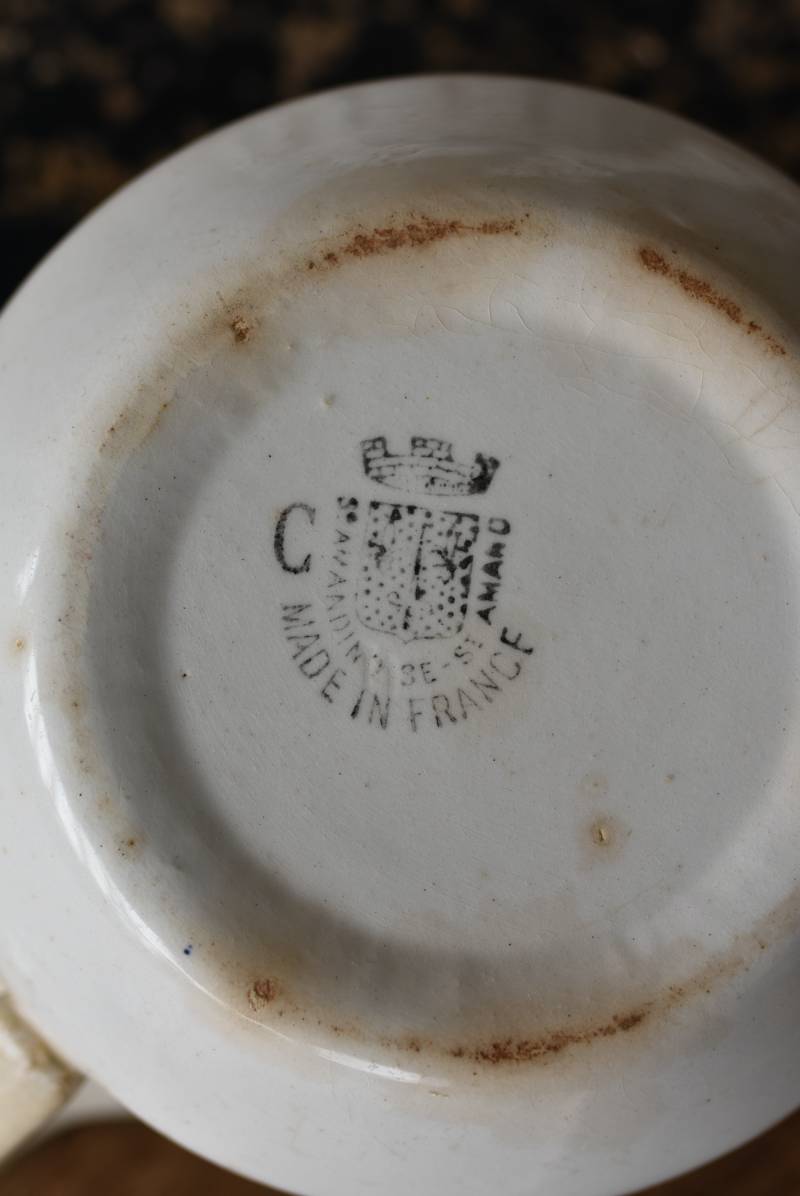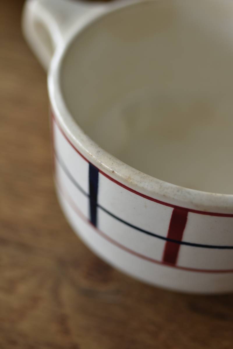 フランス・St.Amand(サンタマン)のミルクポット。 艶やかなボディは温かみのあるミルクカラーで、小さな注ぎ口とハンドルがあしらわれた可愛らしい佇まい。バスク地方の伝統的な建築からインスピレーションを得た"Lou Basquez"シリーズのもので、赤と濃紺のバスクカラーで表現された手描きラインがほっこりとした優しげな雰囲気のデザインです。使い込まれた趣豊かな風合いがテーブルコーディネートに深みを与えてくれる一品に。 独自の存在感が目を惹くどこか素朴な姿で、コレクターも多いアイコニックなアイテムです。(Lou Basquezシリーズ) W 約16cm D 約11.3cm H 約6.8cm