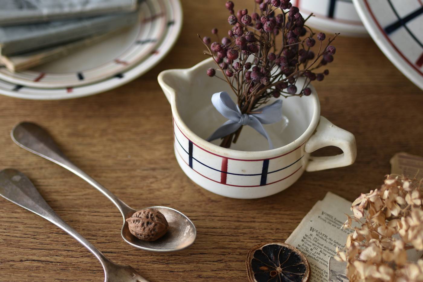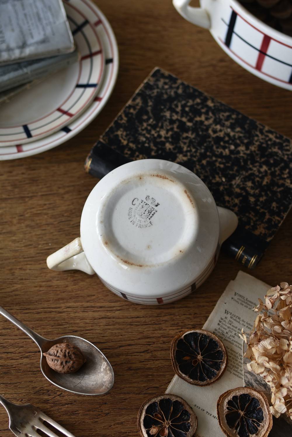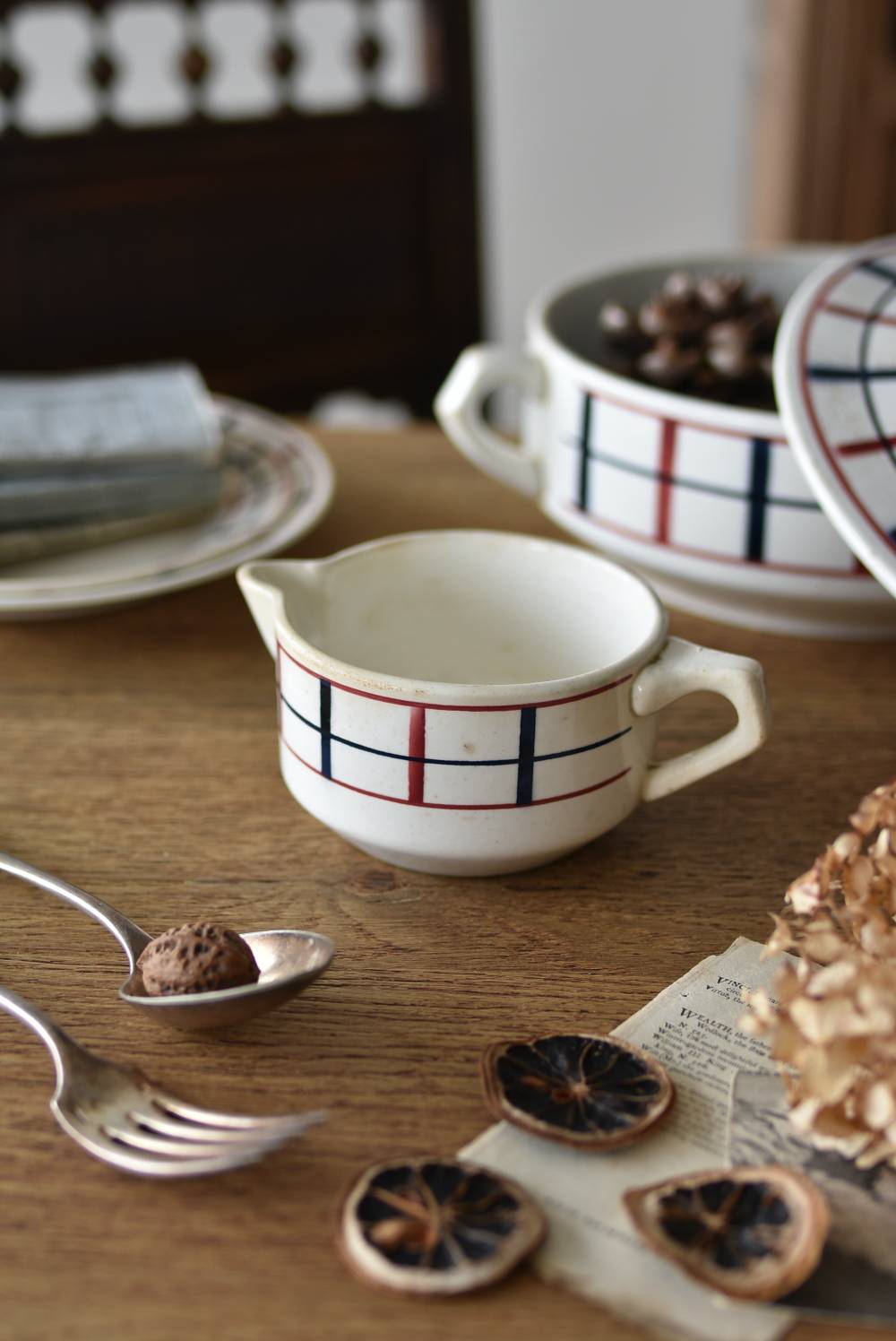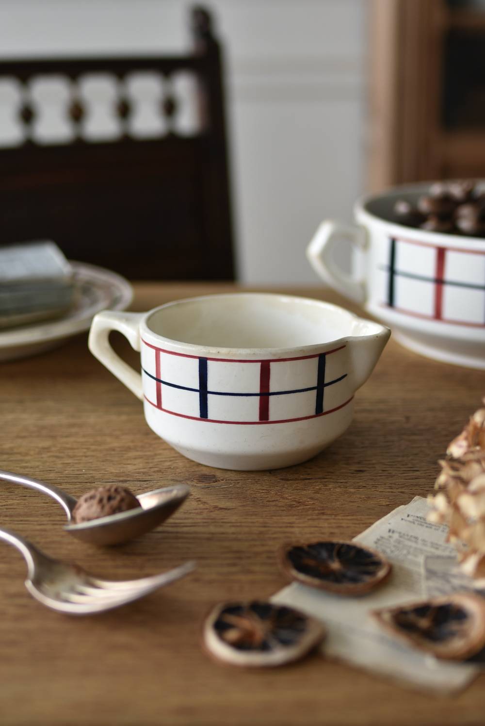 フランス・St.Amand(サンタマン)のミルクポット。 艶やかなボディは温かみのあるミルクカラーで、小さな注ぎ口とハンドルがあしらわれた可愛らしい佇まい。バスク地方の伝統的な建築からインスピレーションを得た"Lou Basquez"シリーズのもので、赤と濃紺のバスクカラーで表現された手描きラインがほっこりとした優しげな雰囲気のデザインです。使い込まれた趣豊かな風合いがテーブルコーディネートに深みを与えてくれる一品に。 独自の存在感が目を惹くどこか素朴な姿で、コレクターも多いアイコニックなアイテムです。(Lou Basquezシリーズ) W 約16cm D 約11.3cm H 約6.8cm