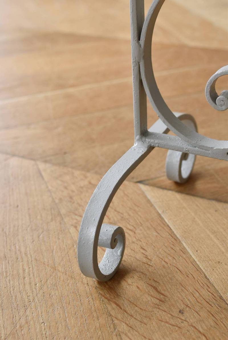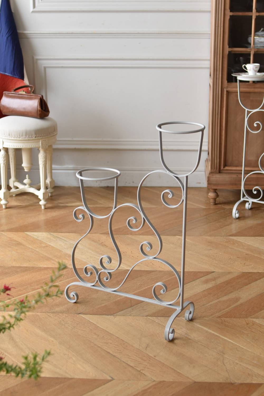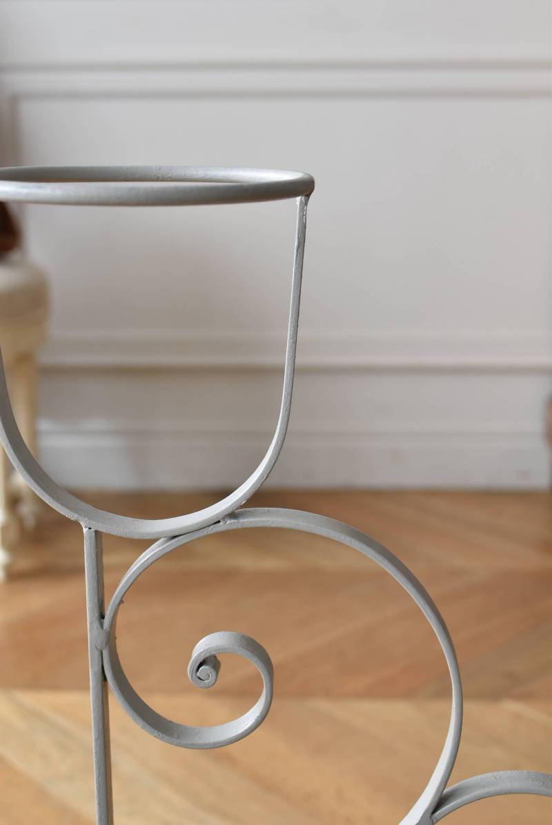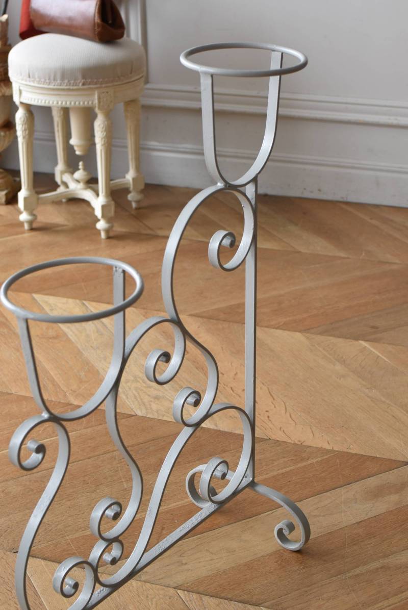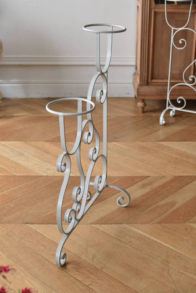 フランスのアイアンプランタースタンド。 ラインの先端がくるんと渦巻いたリズミカルなデザインが合わさり、抑揚のある曲線が織りなす柔らかさを感じるような美しい姿です。大きく抜け感のある軽快な姿ながらもしっかりと幅のあるアイアンによってはっきりと主張してくれ、淡いグレーカラーが爽やかさをもたらしてくれます。 2つのリング状になったホルダー部分は高低差があり、それぞれが引き立つようなバランス良いデザインです。同じデザインのプランタースタンドがあり、それぞれでの販売となりますが、シンメトリーに配置するのもおすすめです。 W 約54cm D 約23.5cm H 約74.5cm リング内径 約14.5cm こちらの商品の配送について