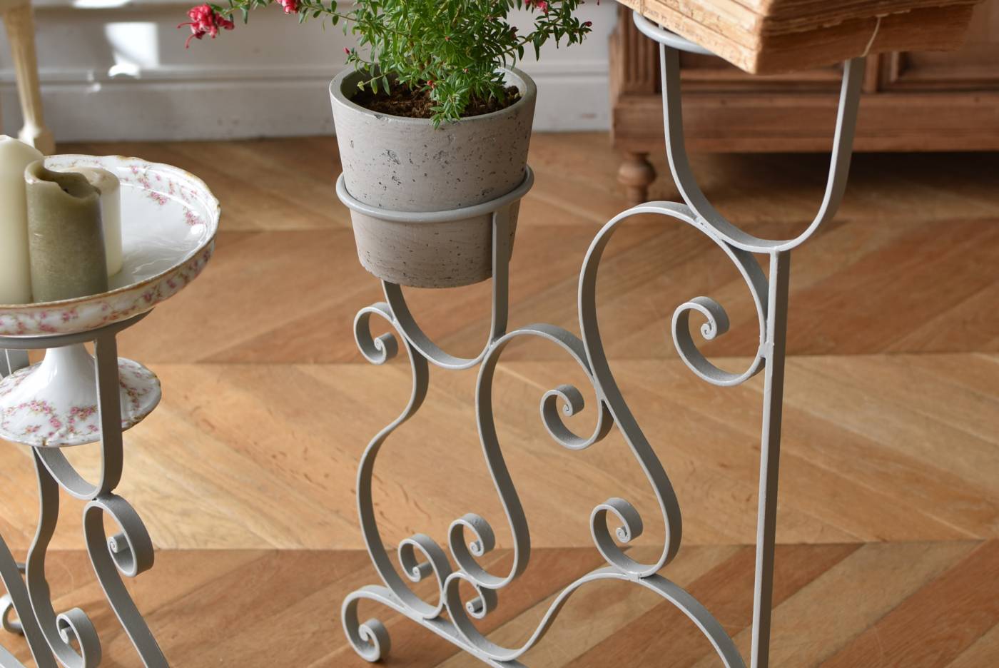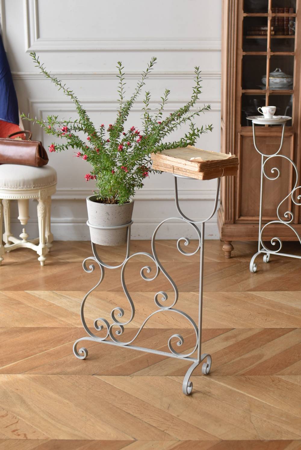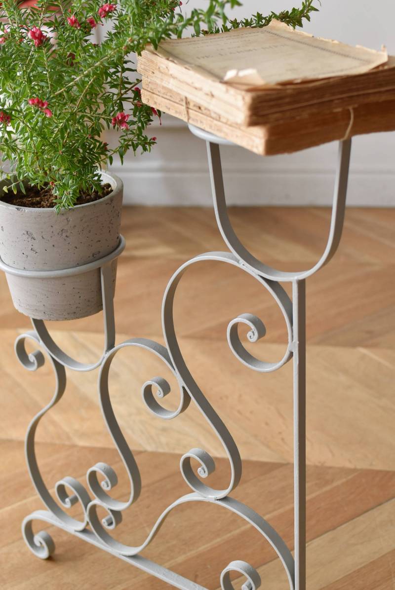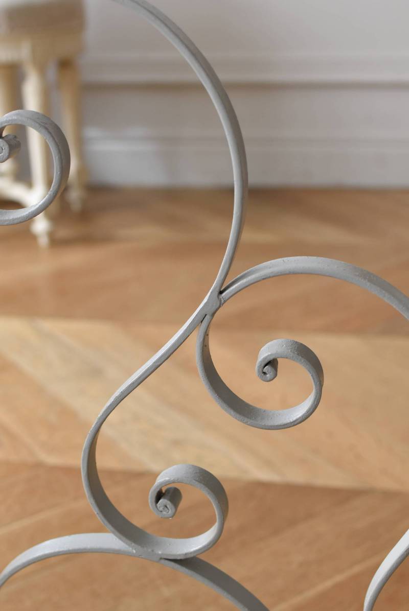 フランスのアイアンプランタースタンド。 ラインの先端がくるんと渦巻いたリズミカルなデザインが合わさり、抑揚のある曲線が織りなす柔らかさを感じるような美しい姿です。大きく抜け感のある軽快な姿ながらもしっかりと幅のあるアイアンによってはっきりと主張してくれ、淡いグレーカラーが爽やかさをもたらしてくれます。 2つのリング状になったホルダー部分は高低差があり、それぞれが引き立つようなバランス良いデザインです。同じデザインのプランタースタンドがあり、それぞれでの販売となりますが、シンメトリーに配置するのもおすすめです。 W 約54cm D 約23.5cm H 約74.5cm リング内径 約14.5cm こちらの商品の配送について