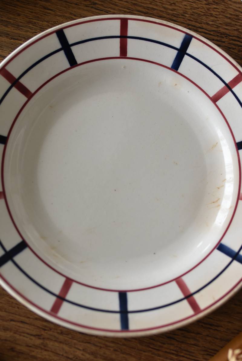 フランス・St.Amand(サンタマン)のラウンドプレート。 艶やかなボディは温かみのあるミルクカラーで、直径23cmほどの使い勝手の良いサイズ感。バスク地方の伝統的な建築からインスピレーションを得た"Lou Basquez"シリーズのもので、赤と濃紺のバスクカラーで表現された手描きラインがほっこりとした優しげな雰囲気のデザインです。使い込まれた趣豊かな風合いがテーブルコーディネートに深みを与えてくれる一品に。 独自の存在感が目を惹くどこか素朴な姿で、コレクターも多いアイコニックなアイテムです。(Lou Basquezシリーズ) 直径 約23cm H 約3cm 見込み 約13.5cm