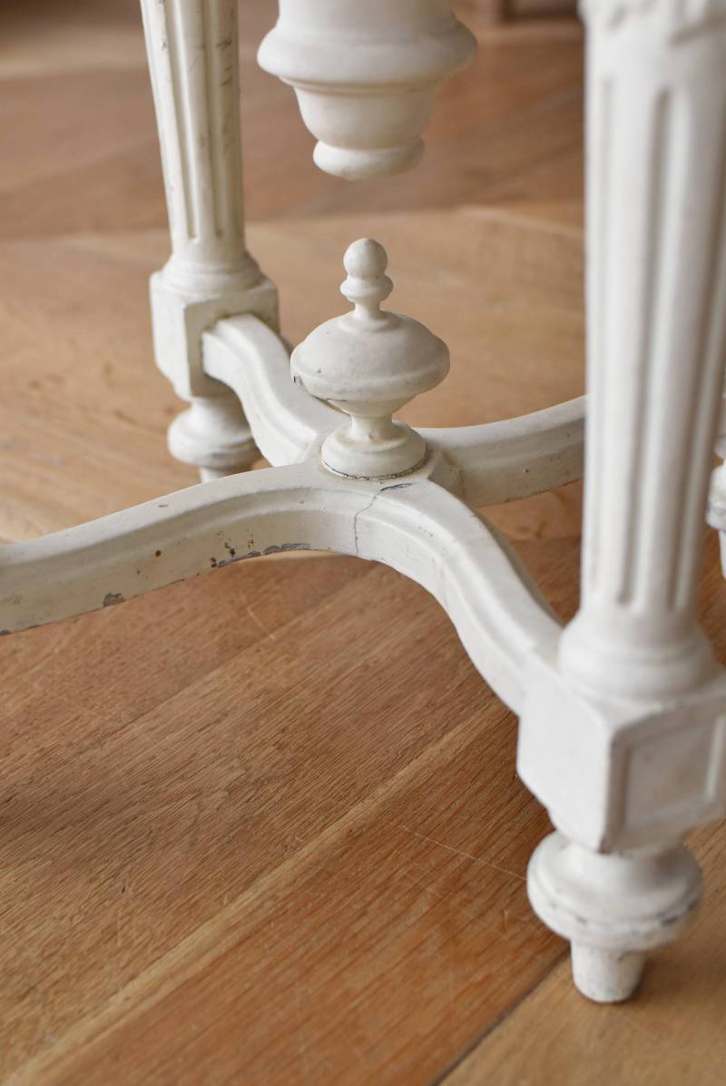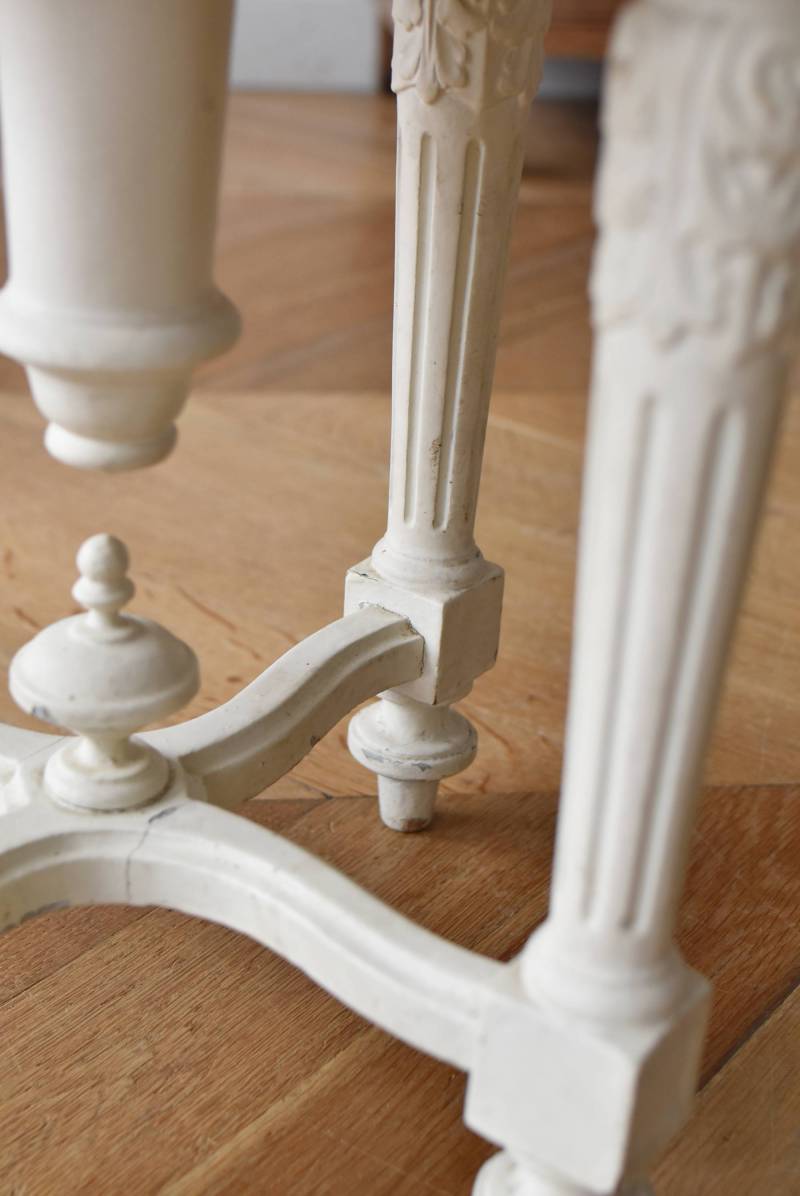 脚先に向かって細くなったエレガントな姿に植物モチーフや縦ラインが立体的に施されたまるでアート作品かのようなこだわり抜かれた作りです。下部の貫中央にもあしらわれた膨らみのある装飾までも華やかさをもたらしてくれ、ホワイトに近いぬくもりのある色合いが気品よく見せてくれます。