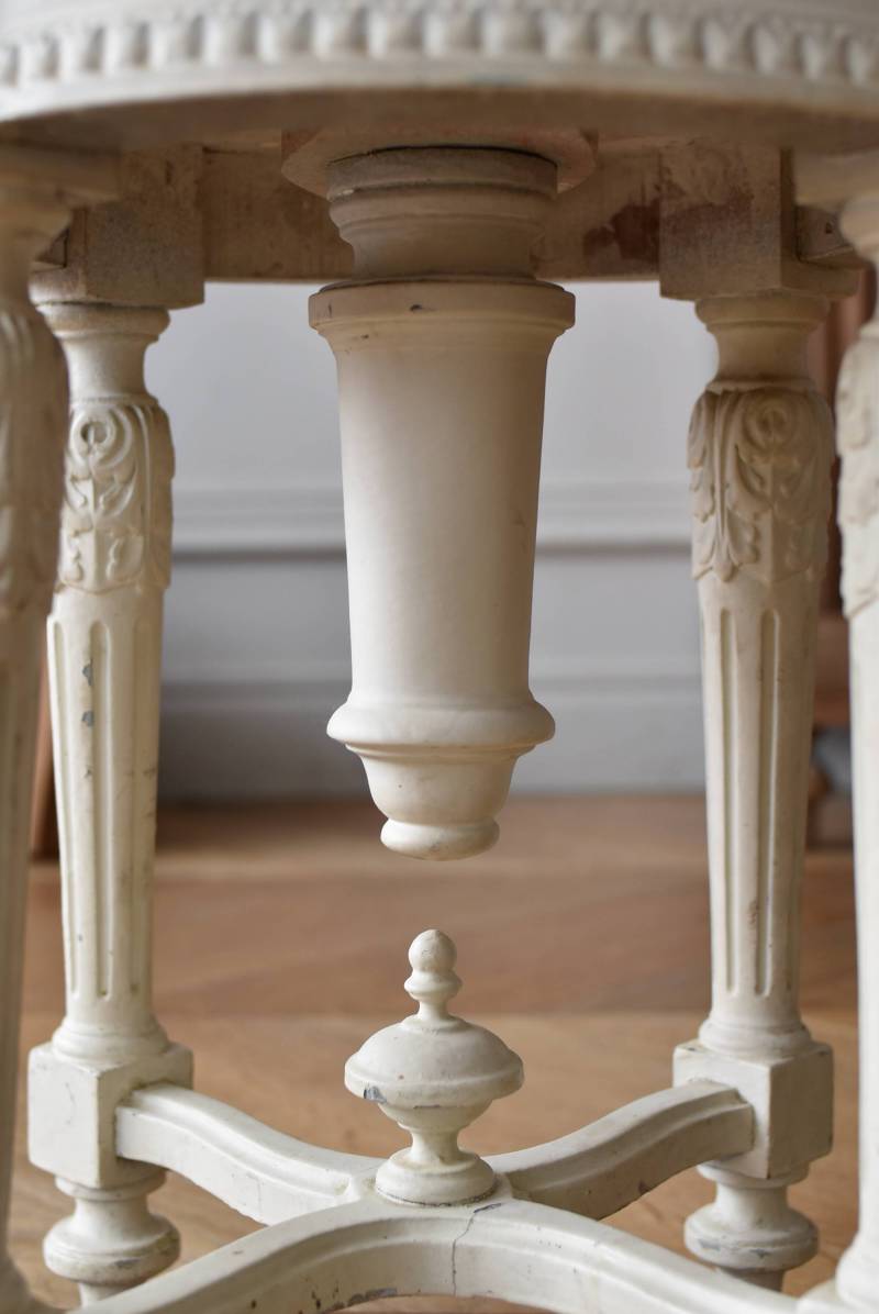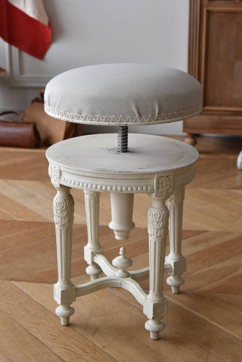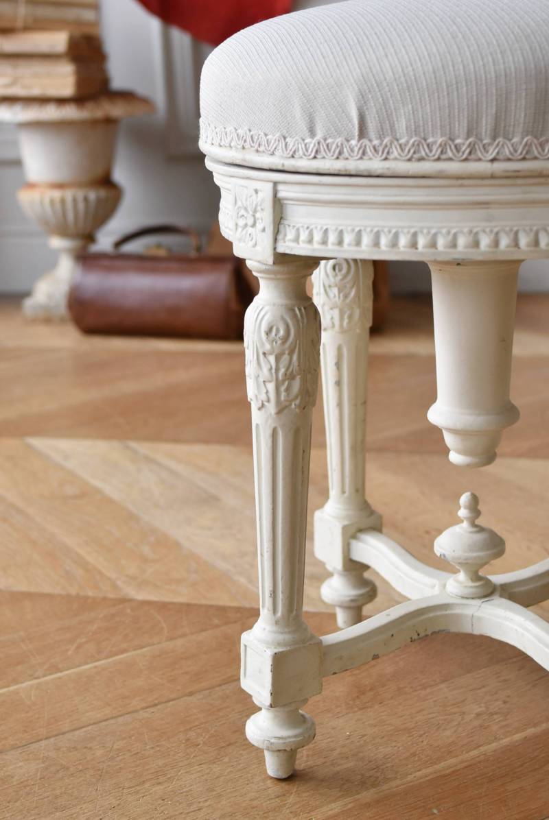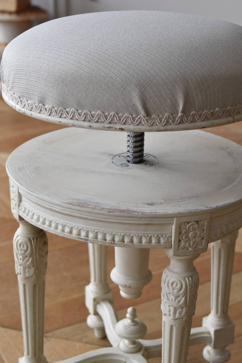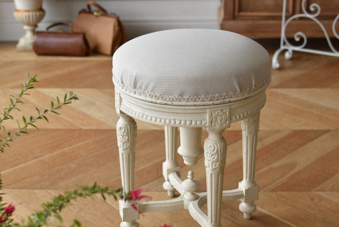 フレームは一度バラして組み直しを行っています。座面のファブリックは新しく張り直し、中もウレタンに交換しているので程よい柔らかさを感じられる座り心地です。 座面をくるくると回すと高さの調節が出来ます。 座面直径 約35cm