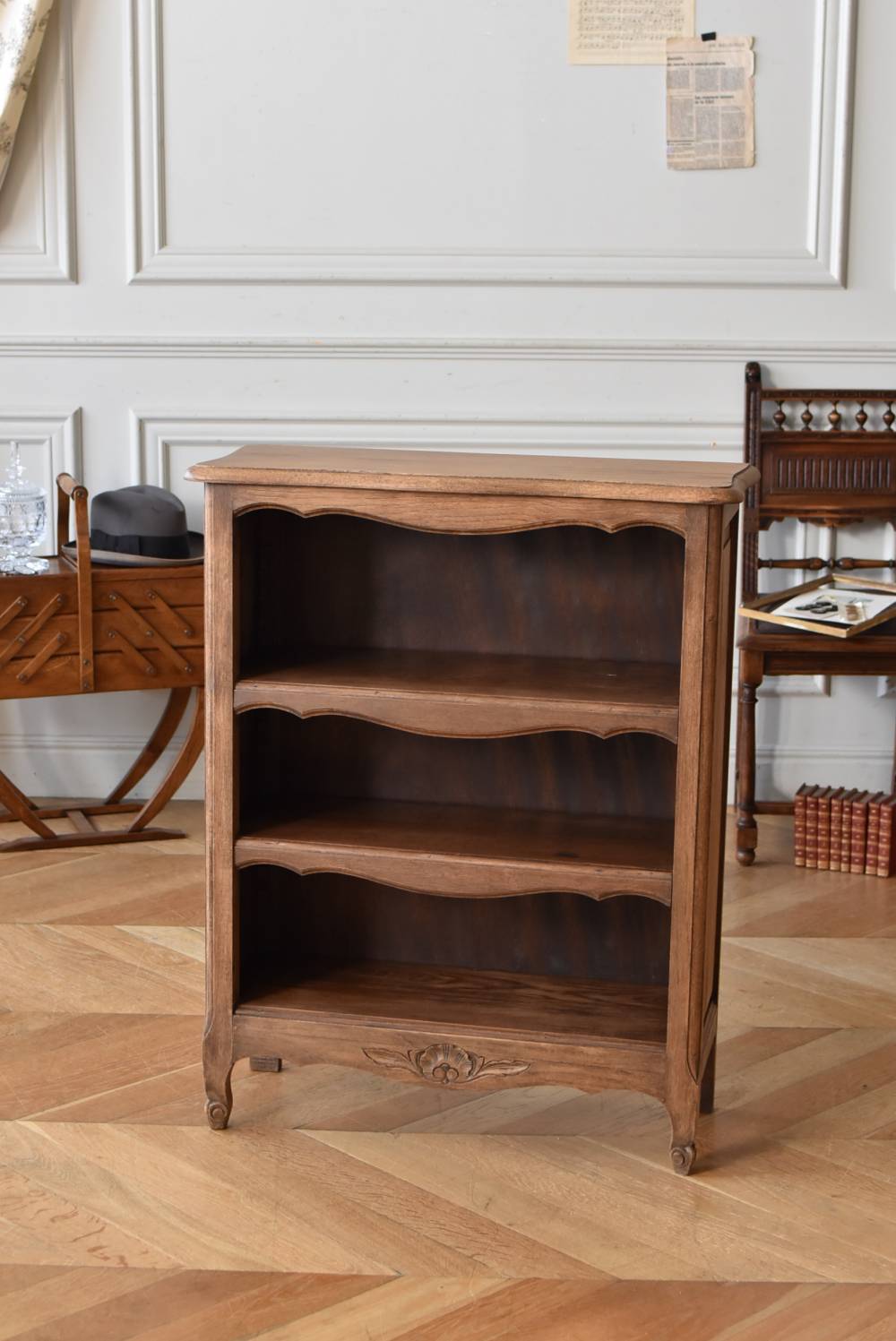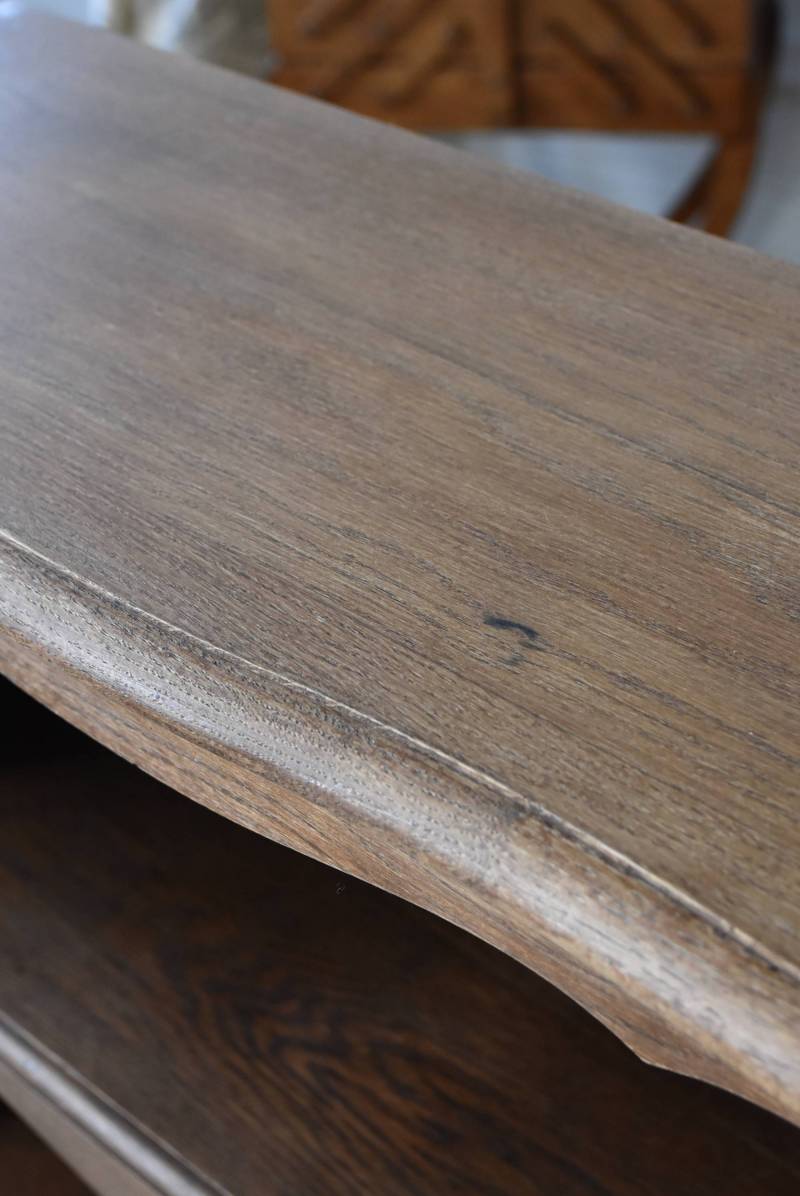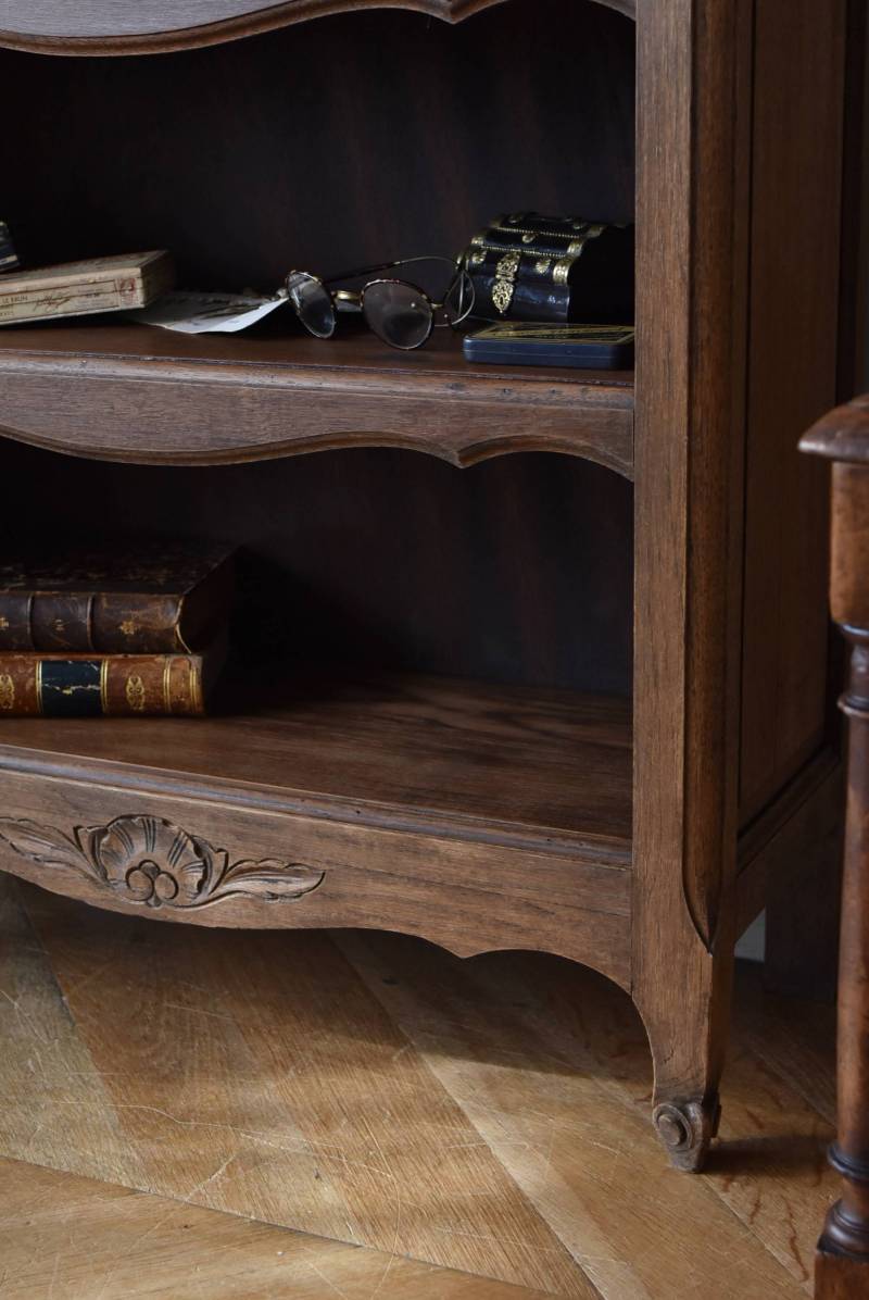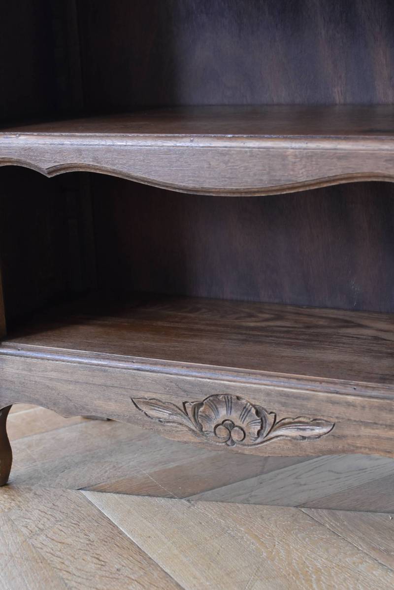 フランスのオープンシェルフ。 しなやかに流れるような横ラインがあしらわれ、しっかりと幅のある木板によって優しげな温もりが伝わってきます。脚元の植物とシェルが合わさった彫り模様によって華やかさをもたらしてくれ、小さく渦巻いた抜け感のある脚先が気品高いデザインです。 味わいを増し、落ち着いたブラウンとなったカラーによってディスプレイするアイテムを引き立ててくれ、棚板は高さ調節が可能なので収めるアイテムに合わせて変更できるのも実用的で使いやすいです。 W 約71.5cm D 約27cm H 約90.5cm 棚面積 W約64cm×D約21cm 搬入経路について こちらの商品の配送について