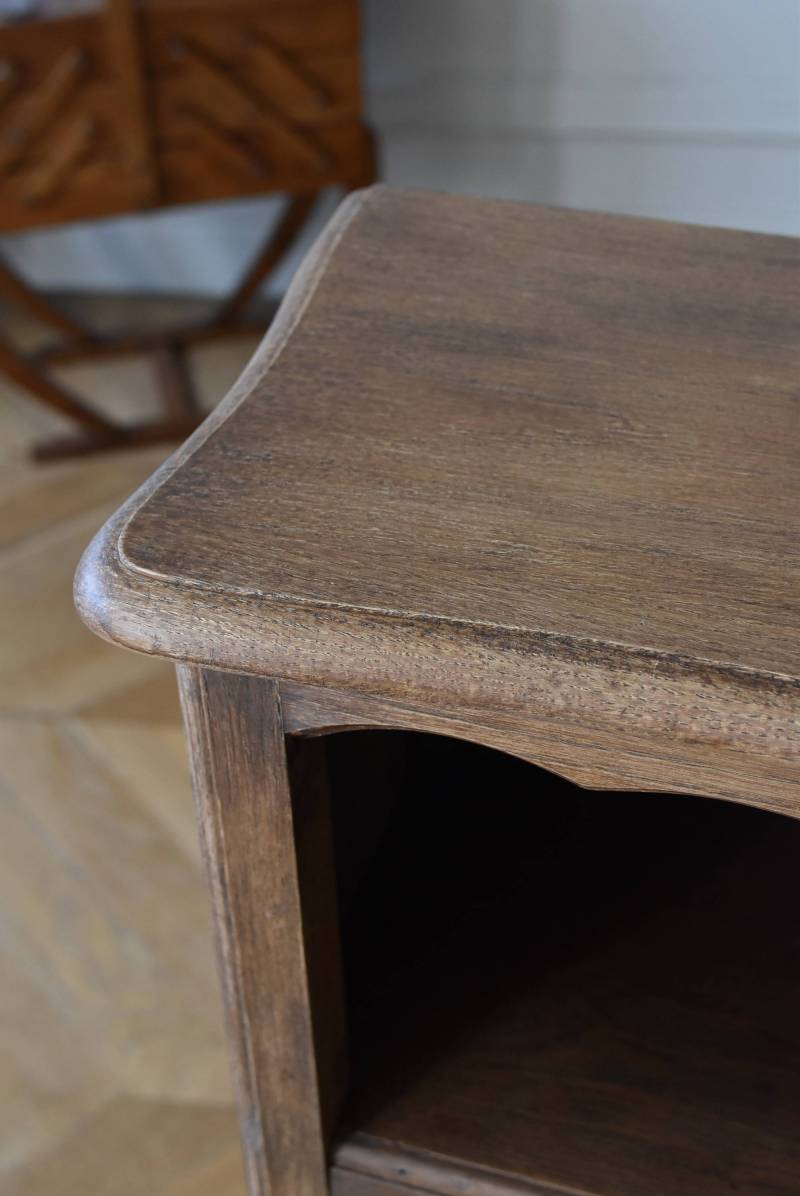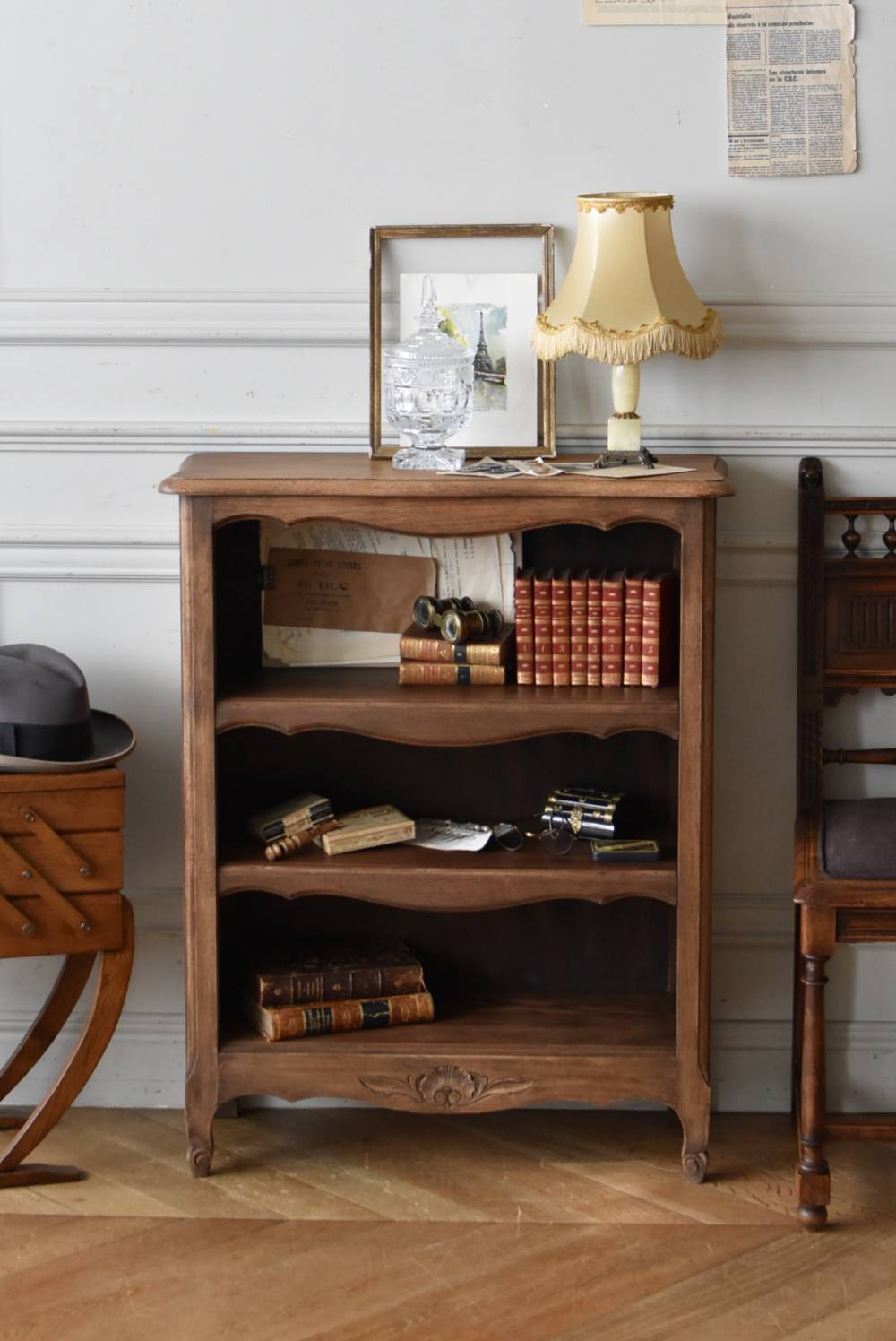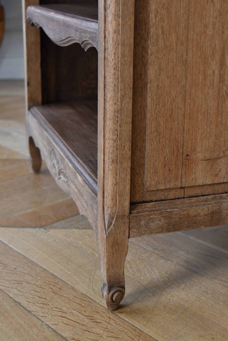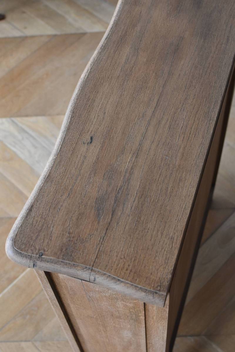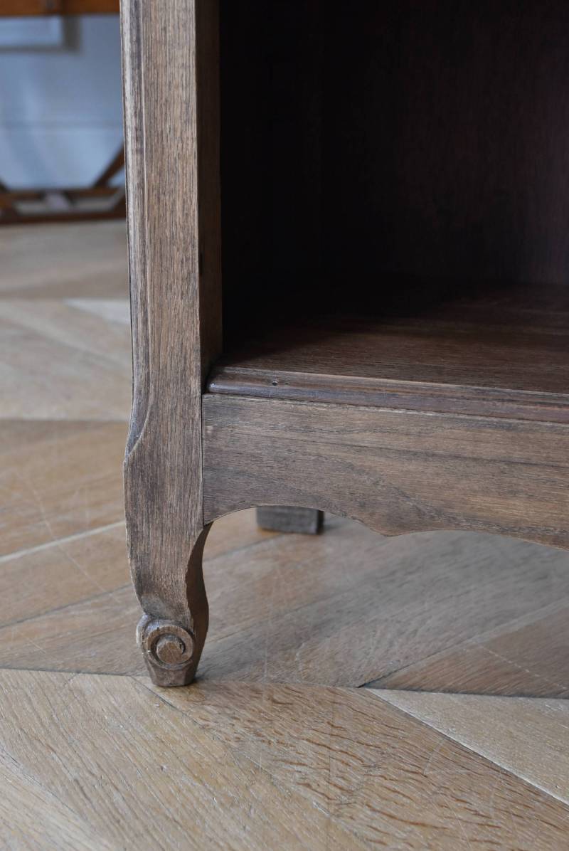 フランスのオープンシェルフ。 しなやかに流れるような横ラインがあしらわれ、しっかりと幅のある木板によって優しげな温もりが伝わってきます。脚元の植物とシェルが合わさった彫り模様によって華やかさをもたらしてくれ、小さく渦巻いた抜け感のある脚先が気品高いデザインです。 味わいを増し、落ち着いたブラウンとなったカラーによってディスプレイするアイテムを引き立ててくれ、棚板は高さ調節が可能なので収めるアイテムに合わせて変更できるのも実用的で使いやすいです。 W 約71.5cm D 約27cm H 約90.5cm 棚面積 W約64cm×D約21cm 搬入経路について こちらの商品の配送について