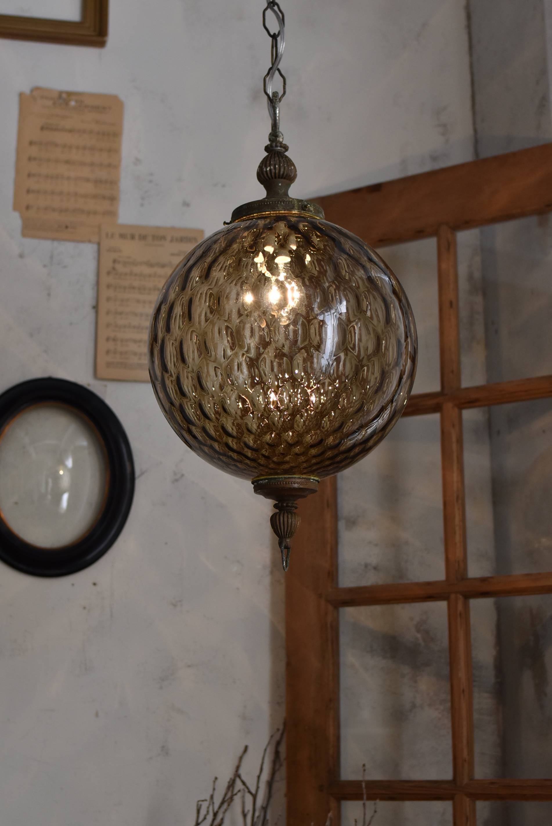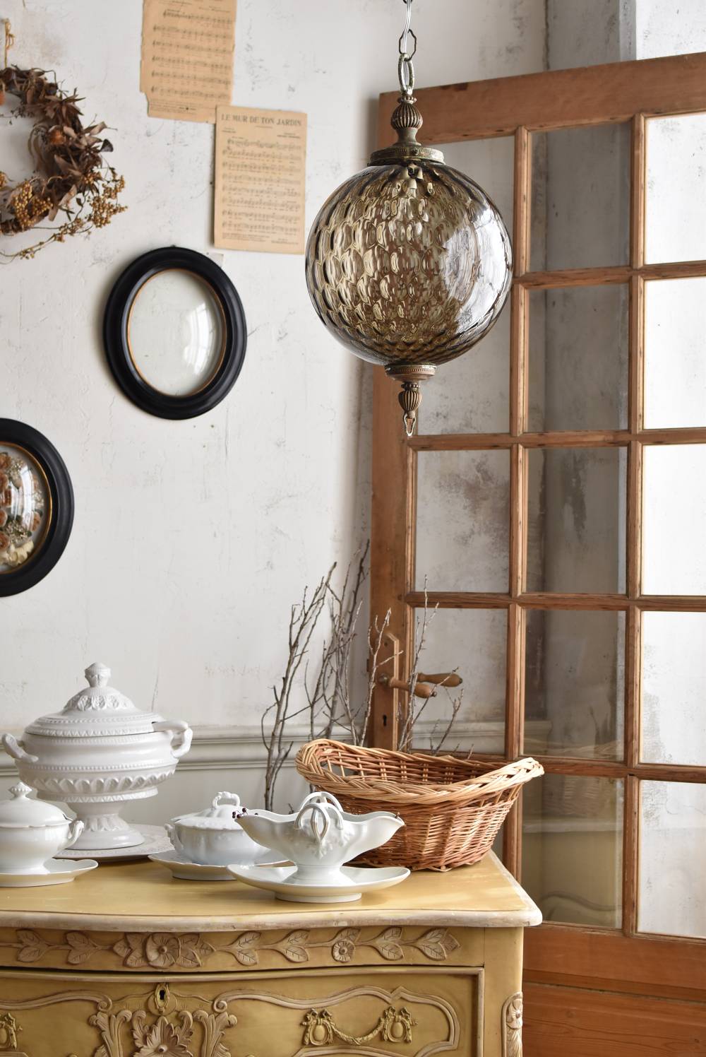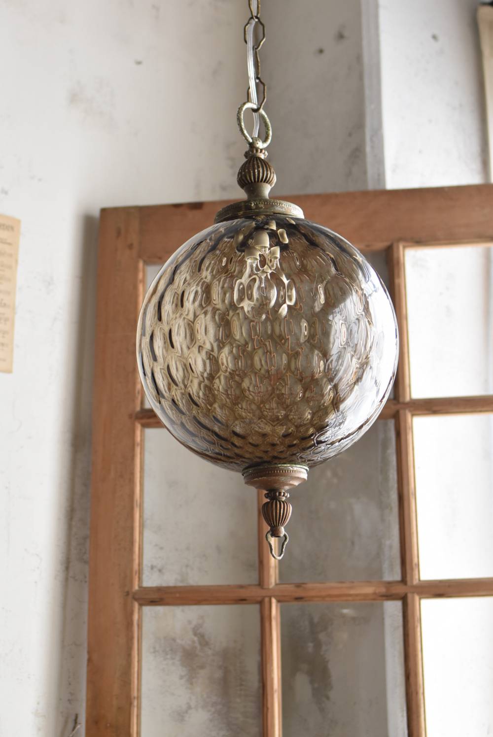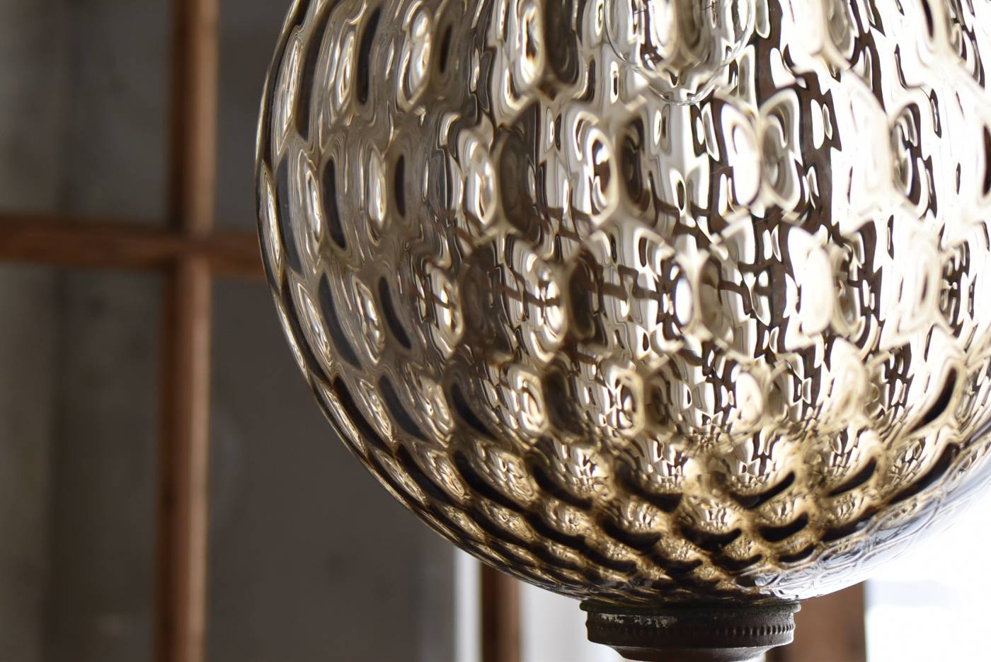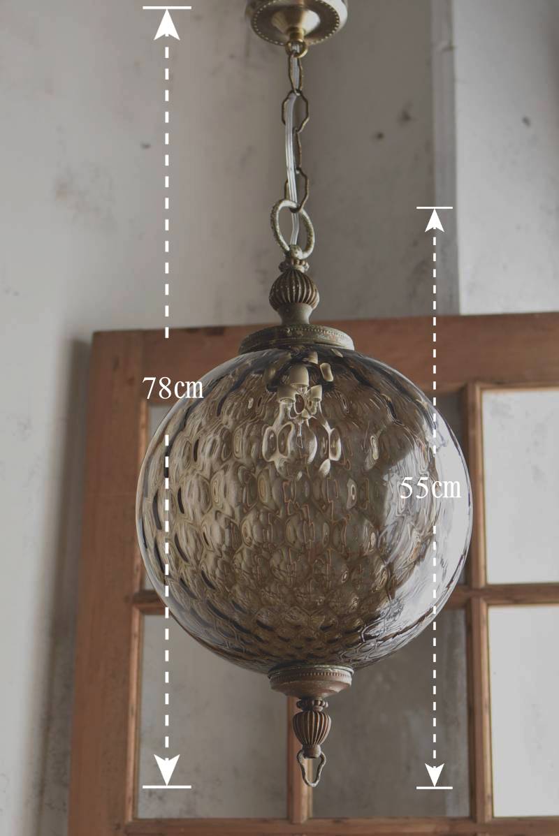 フランスの1灯ペンダントランプ。 まるで風船のようにぷっくりと膨らんだガラスの球体には滑らかに少し凹凸のある交差した連続模様が施されており、スモーキーなブラウンに色づいた上品かつシックな雰囲気を演出してくれます。上下に施された装飾によってもキリッと引き締まり、光を優しく包み込まれ、壁や天井などに映し出される姿も幻想的です。 古いものですのでガラスシェードの取り付け部分に小さな欠けなどが見受けられますが、設置後は目立ちにくい箇所です。 コード・ソケット・シーリングは新しいものに交換済みです。こちらの商品は条件を満たしているので引掛シーリングをご使用いただけます。元は直付けで使われていた物で天井カバーが浅い為、天井との間に隙間ができます。天井との隙間が気になられる方は直付け工事をおすすめします。 電球は付属しません。 直径 約30cm H 約55cm コード含む全長 約78cm 重量 約2.4kg 電球口径 E26 *60W以下をご使用下さい。
