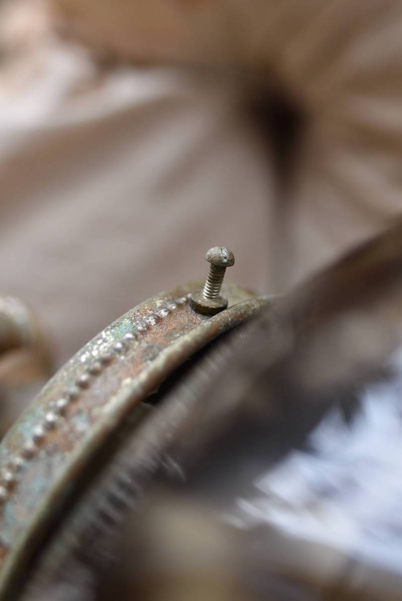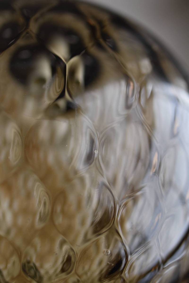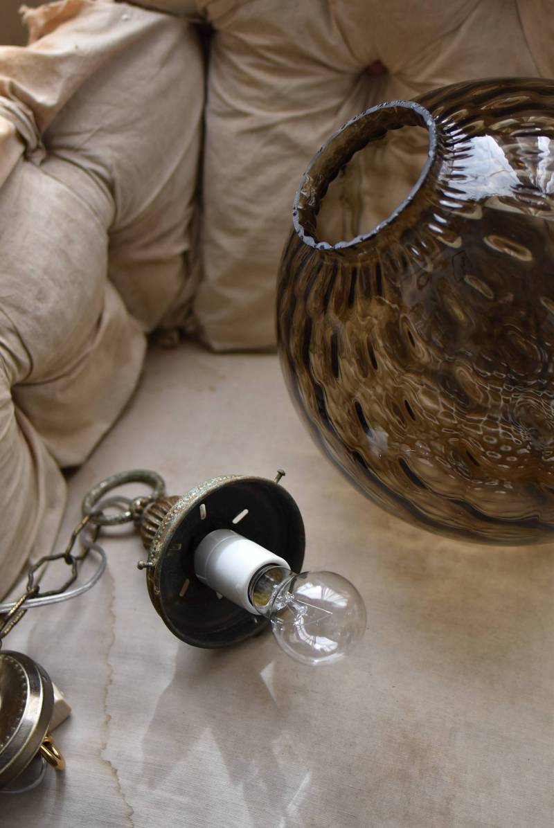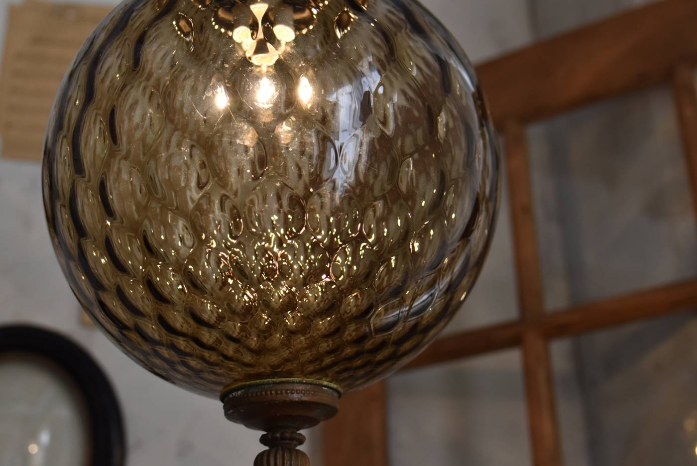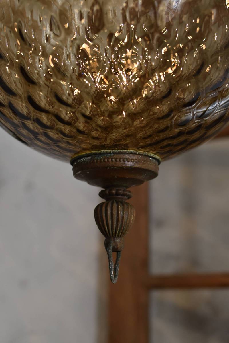 フランスの1灯ペンダントランプ。 まるで風船のようにぷっくりと膨らんだガラスの球体には滑らかに少し凹凸のある交差した連続模様が施されており、スモーキーなブラウンに色づいた上品かつシックな雰囲気を演出してくれます。上下に施された装飾によってもキリッと引き締まり、光を優しく包み込まれ、壁や天井などに映し出される姿も幻想的です。 古いものですのでガラスシェードの取り付け部分に小さな欠けなどが見受けられますが、設置後は目立ちにくい箇所です。 コード・ソケット・シーリングは新しいものに交換済みです。こちらの商品は条件を満たしているので引掛シーリングをご使用いただけます。元は直付けで使われていた物で天井カバーが浅い為、天井との間に隙間ができます。天井との隙間が気になられる方は直付け工事をおすすめします。 電球は付属しません。 直径 約30cm H 約55cm コード含む全長 約78cm 重量 約2.4kg 電球口径 E26 *60W以下をご使用下さい。