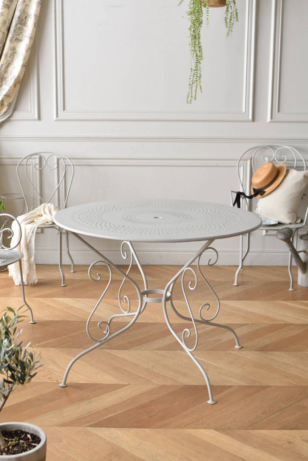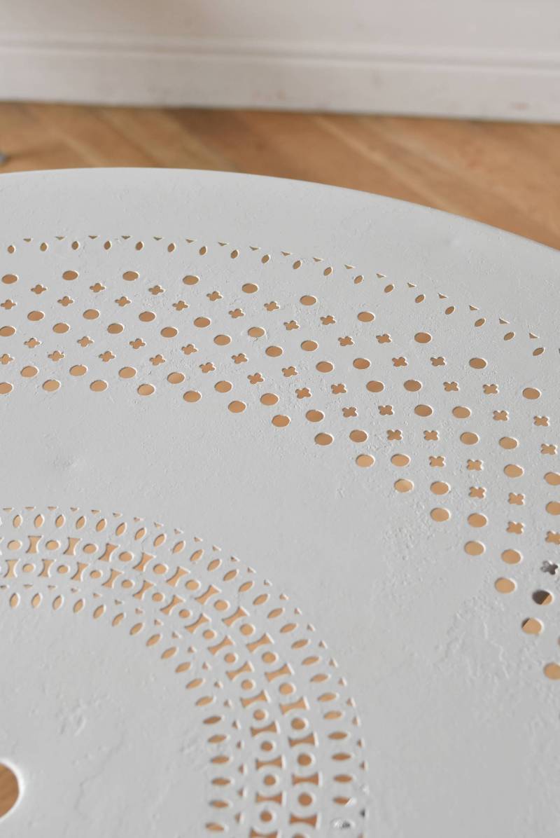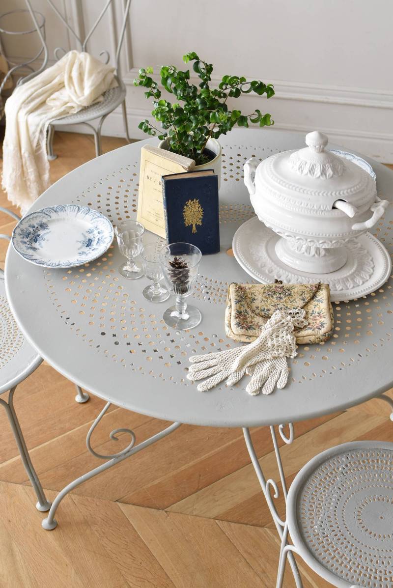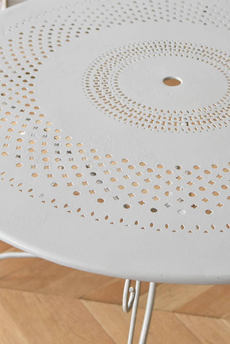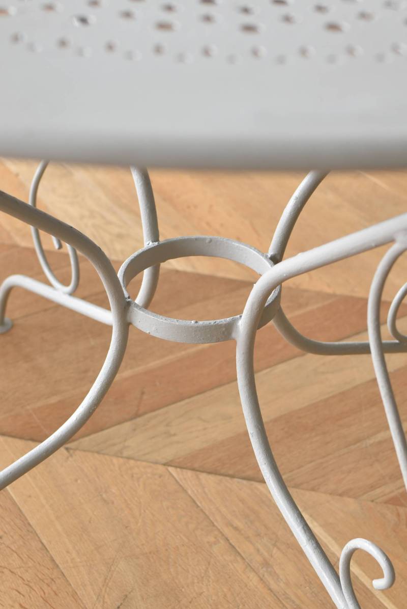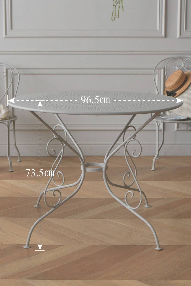 ラウンド型になったフランスのガーデンテーブル。 蔦性の植物を連想させるような華奢ながらもしっかりとしたラインが描かれ、緩やかな曲線が軽快で上品な雰囲気を演出してくれます。明るいグレーカラーとなった天板には丸や雫型など様々な形がサークル状にくり抜かれ、幾何学的な連続模様が洗練された佇まいです。 丸いシルエットを引き立てるかのようなデザインに抜け感のある脚が調和し、空間を明るく華やかさをもたらしてくれそうです。 直径 約96.5cm H 約73.5cm 脚 W約71cm×D約74cm 搬入経路について こちらの商品の配送について