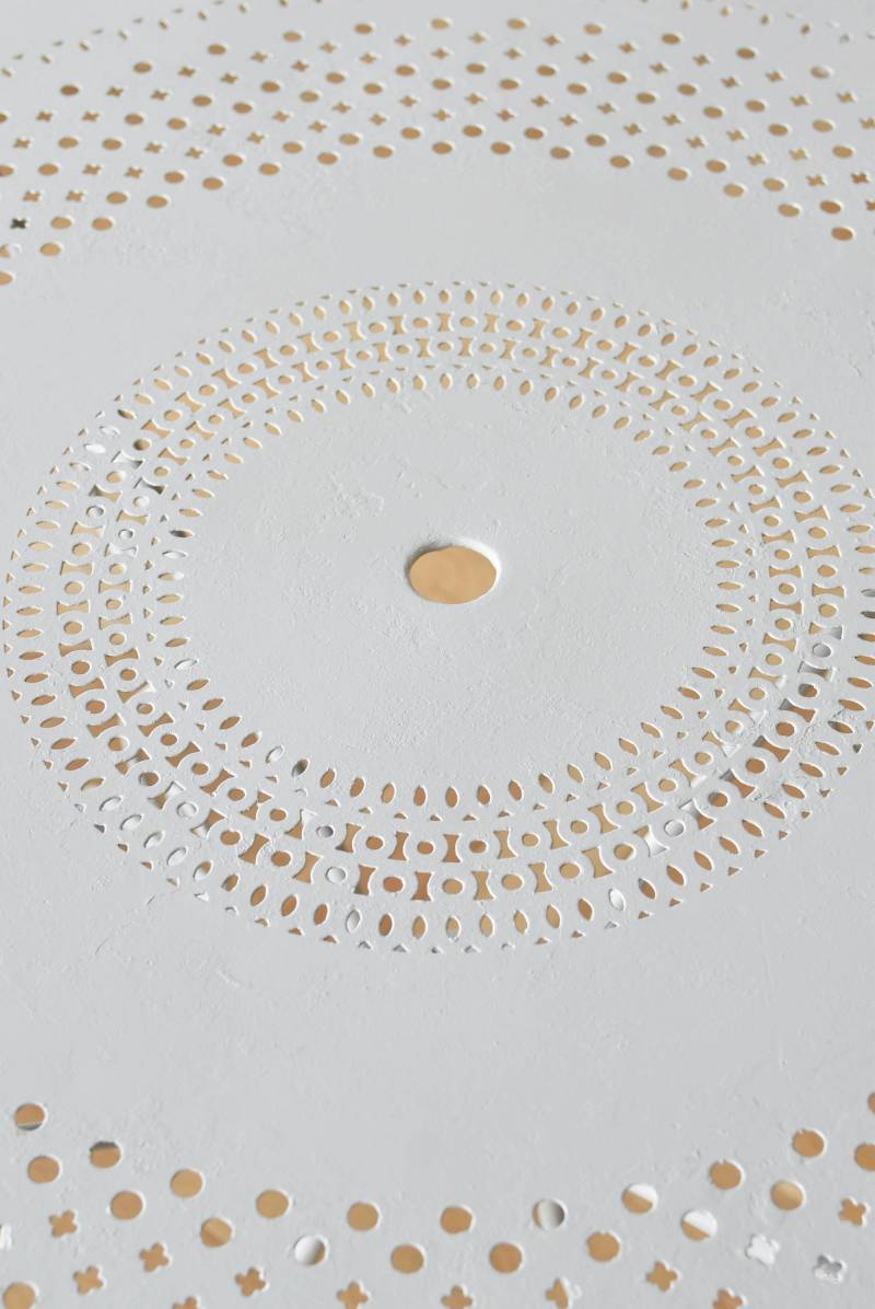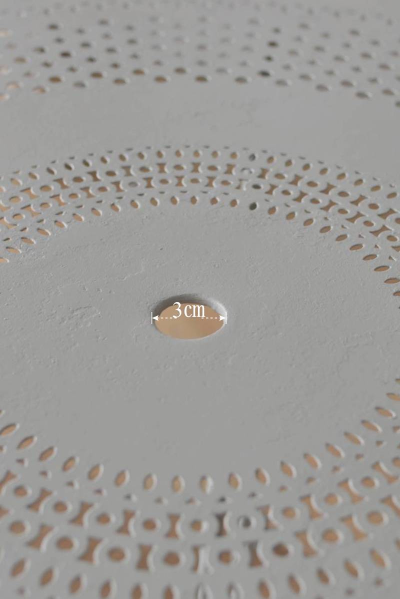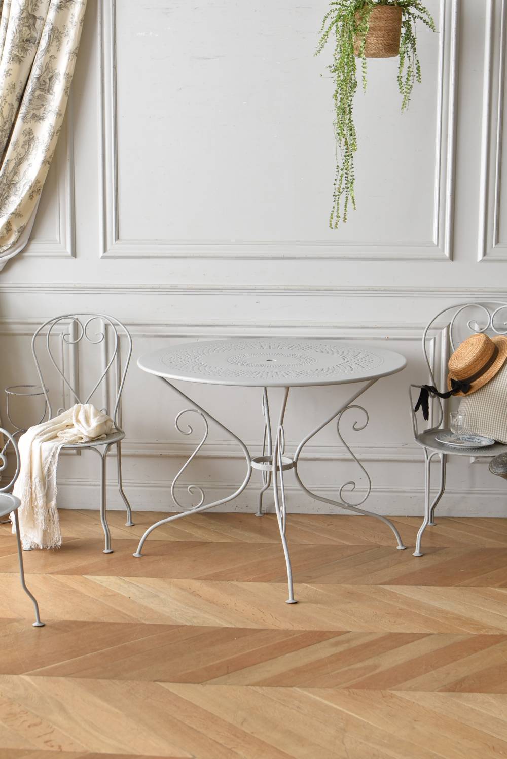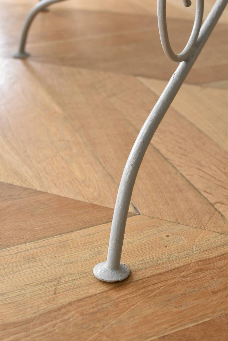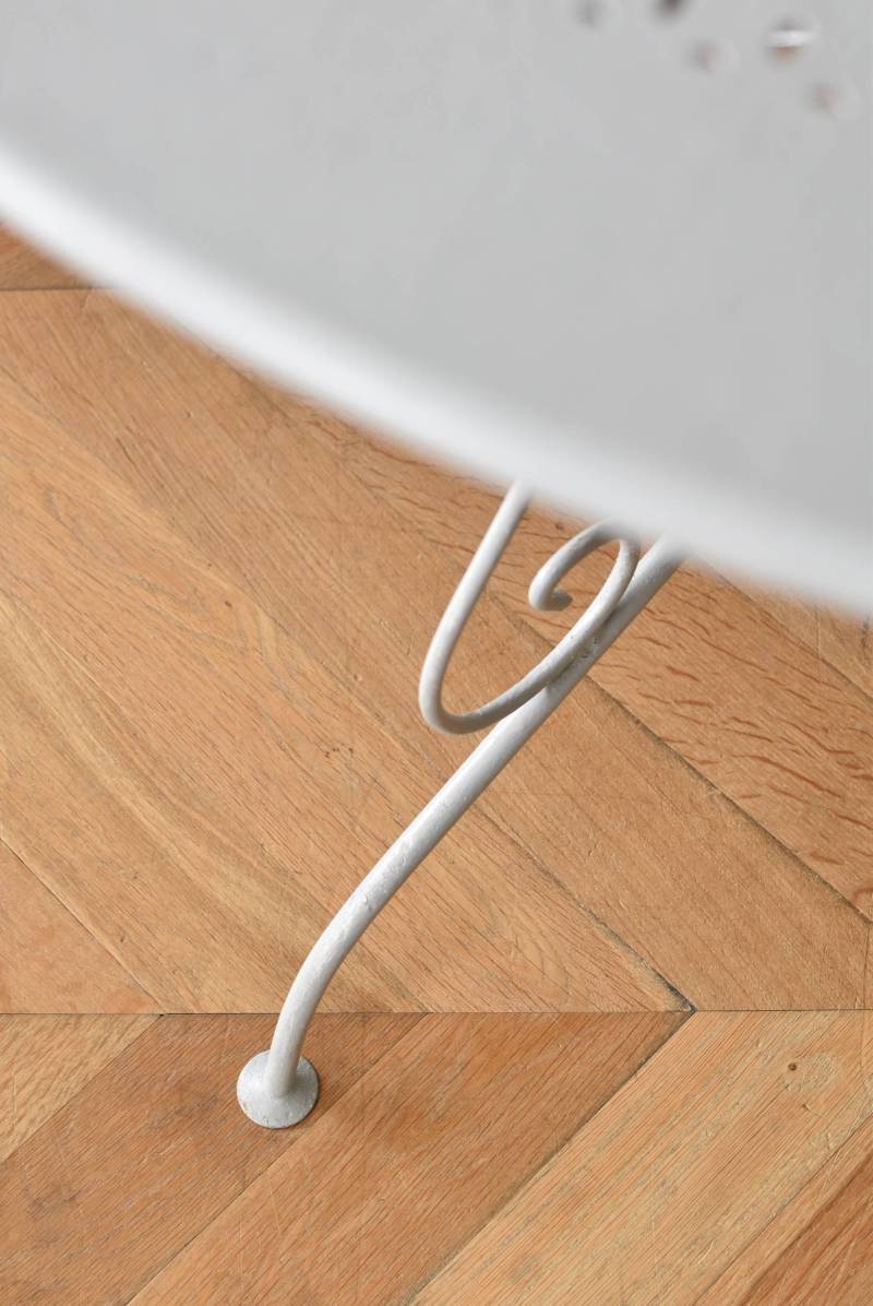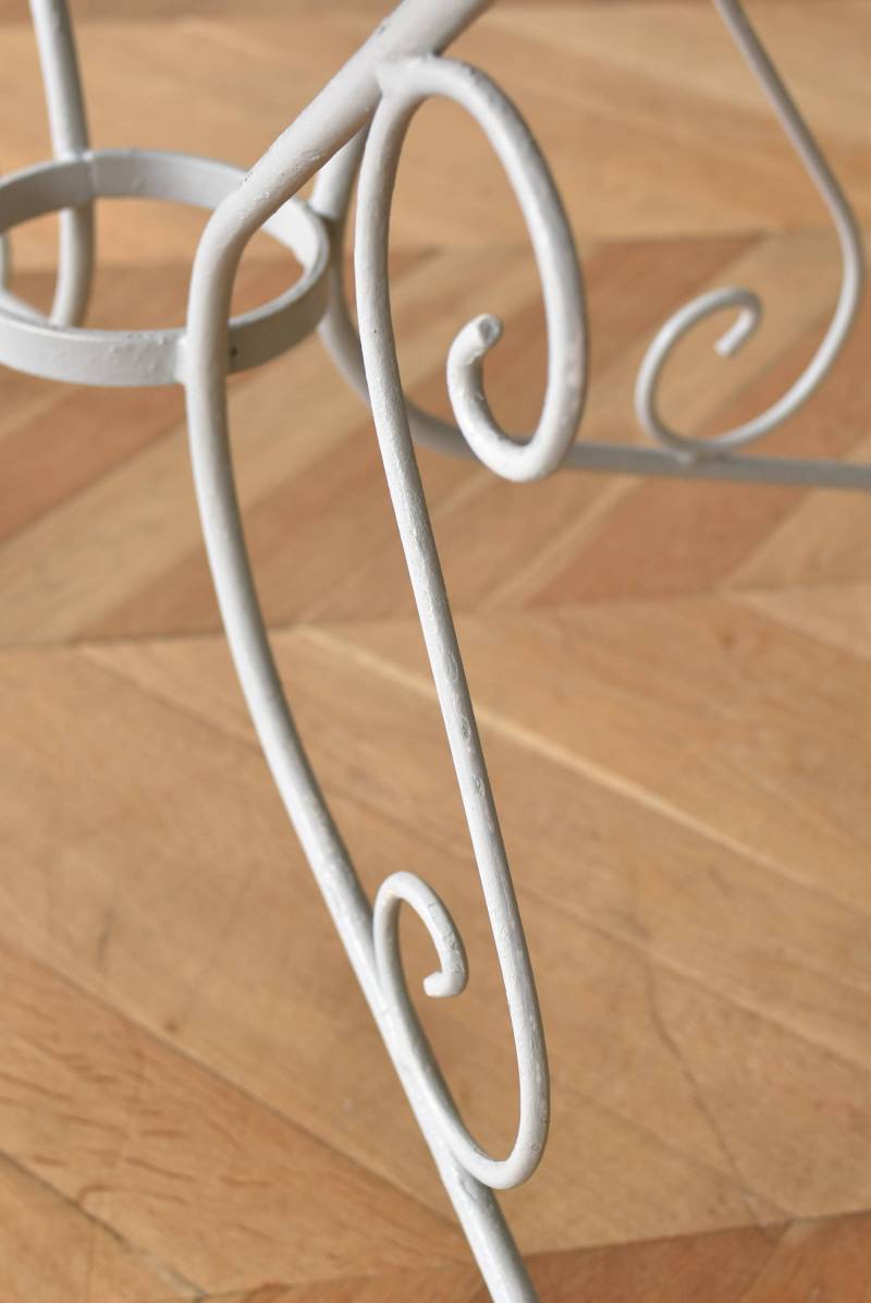 ラウンド型になったフランスのガーデンテーブル。 蔦性の植物を連想させるような華奢ながらもしっかりとしたラインが描かれ、緩やかな曲線が軽快で上品な雰囲気を演出してくれます。明るいグレーカラーとなった天板には丸や雫型など様々な形がサークル状にくり抜かれ、幾何学的な連続模様が洗練された佇まいです。 丸いシルエットを引き立てるかのようなデザインに抜け感のある脚が調和し、空間を明るく華やかさをもたらしてくれそうです。 直径 約96.5cm H 約73.5cm 脚 W約71cm×D約74cm 搬入経路について こちらの商品の配送について