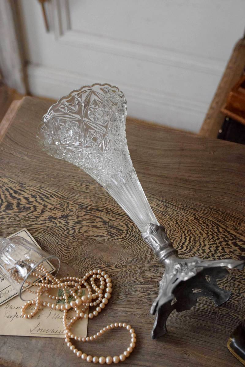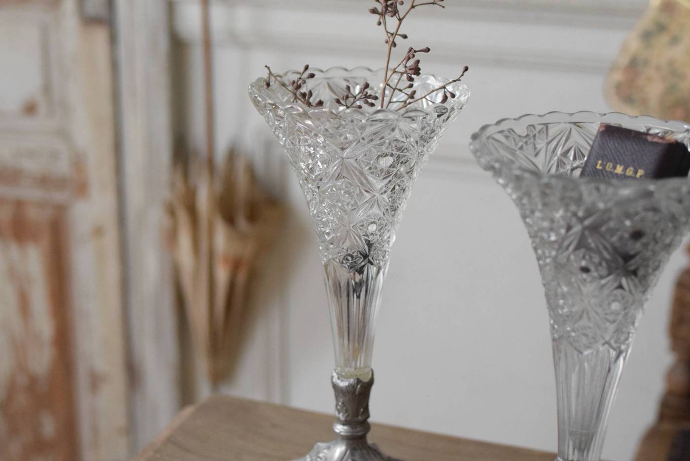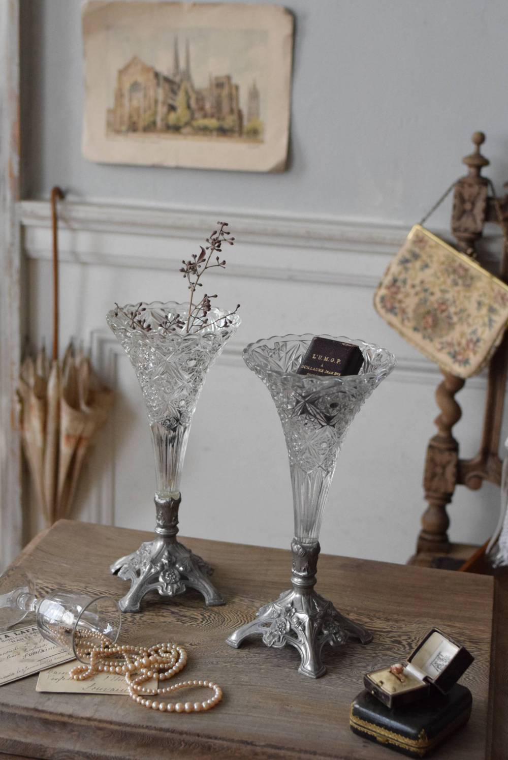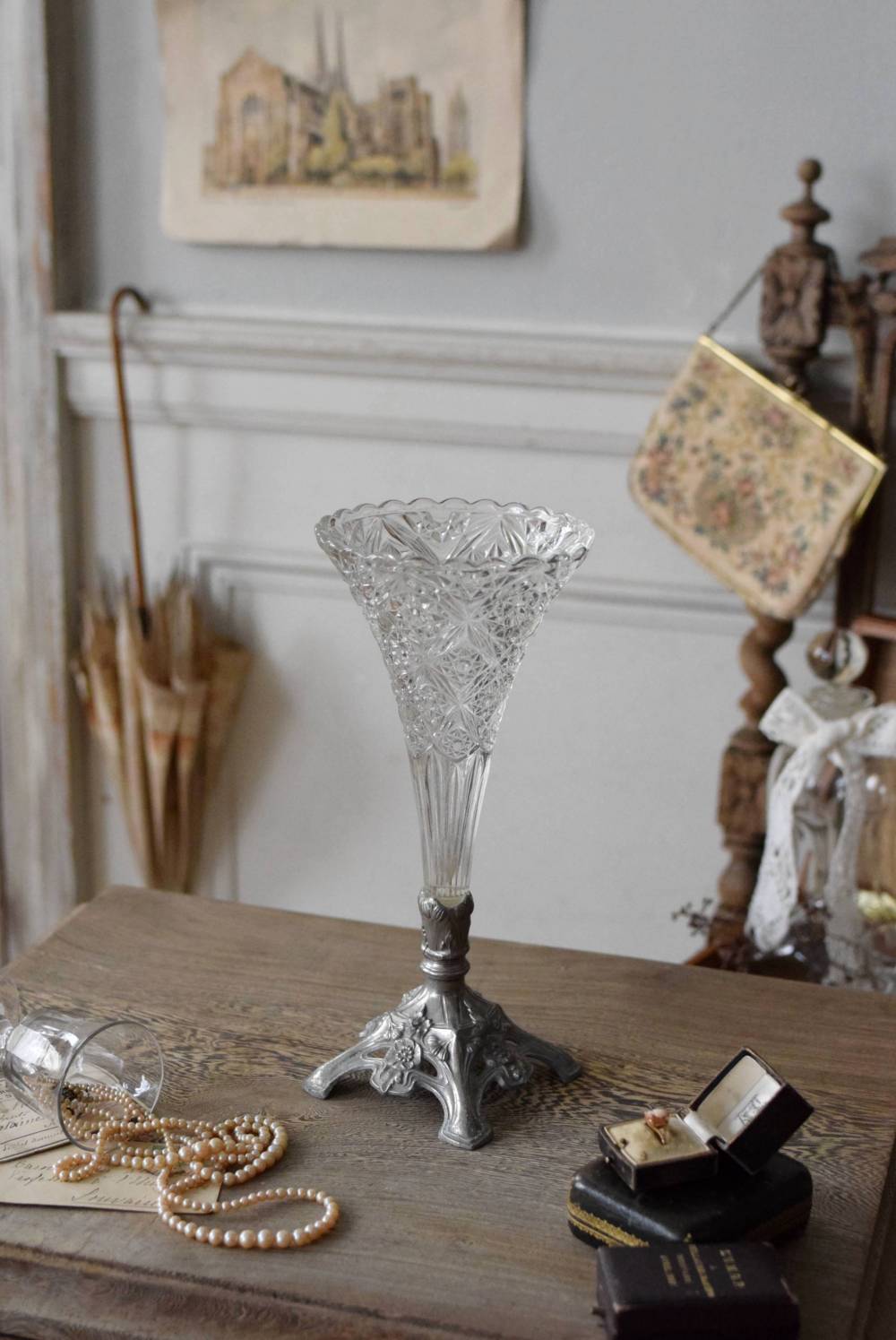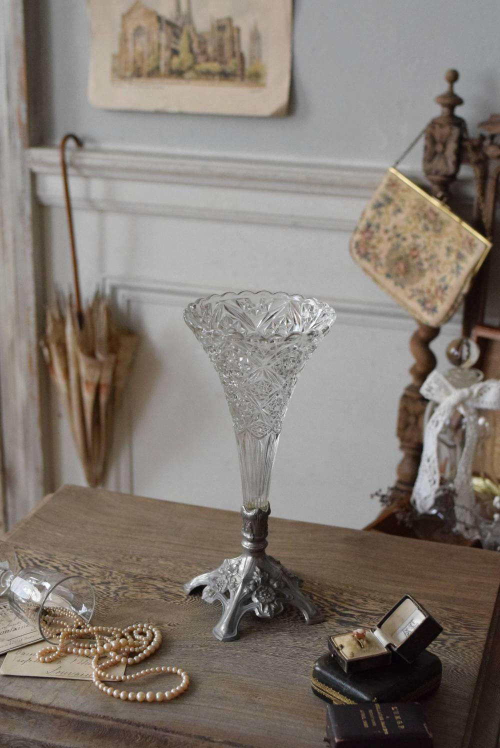 しとやかに咲いた花のようなフランスのフラワーベース。 キュッとくびれた土台からすらりと伸びたガラス部分には小花や雪の結晶を思わせるような,美しいカットが贅沢に施され、キラキラとした反射を見せてくれます。土台も同じく植物の息吹を感じさせるデザインで、繊細でありながらも、しっかりと踏ん張っているような姿が微笑ましいですね。 適度な高さがあるので、お花を飾っていない時もバランスよくディスプレイできます。もう一点同じデザインのものがあるので(フラワーベース.20B)ペアでのご使用もおすすめです。 直径 約12.5cm H 約27.5cm 土台 10.5×10.5cm