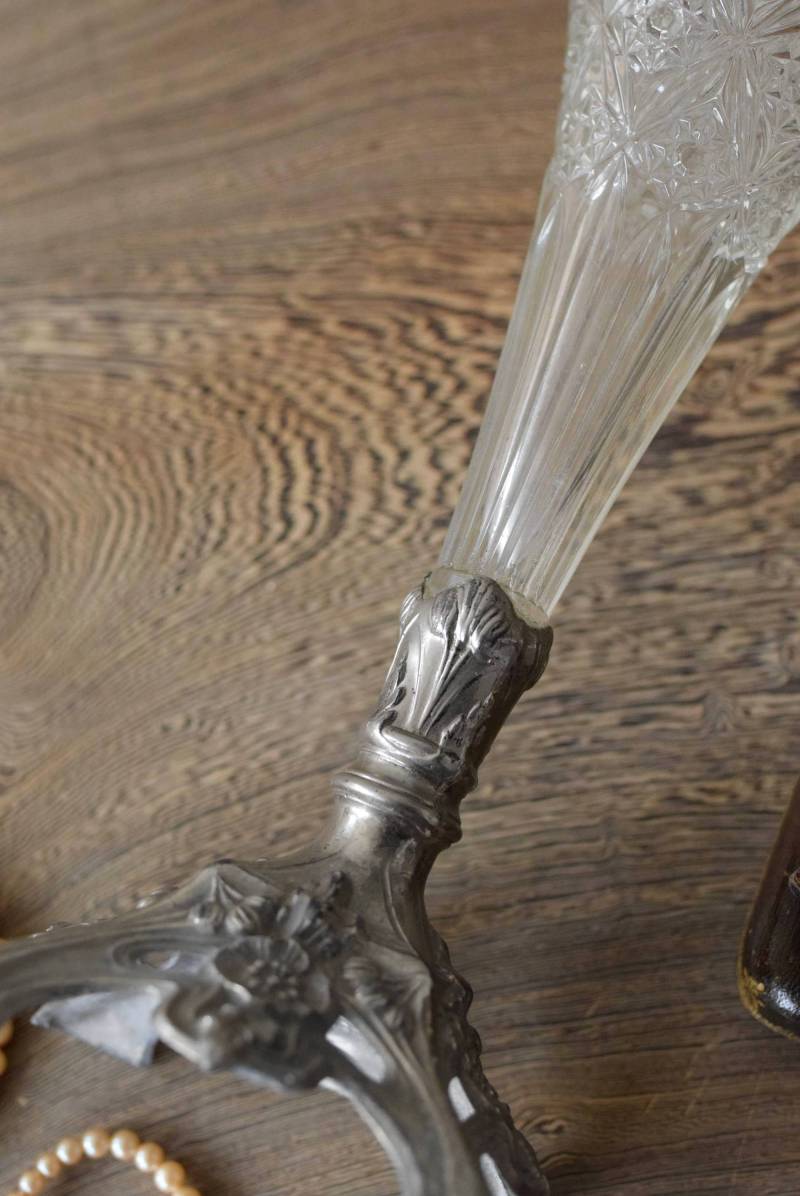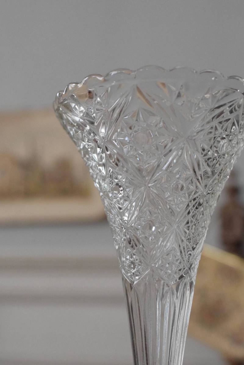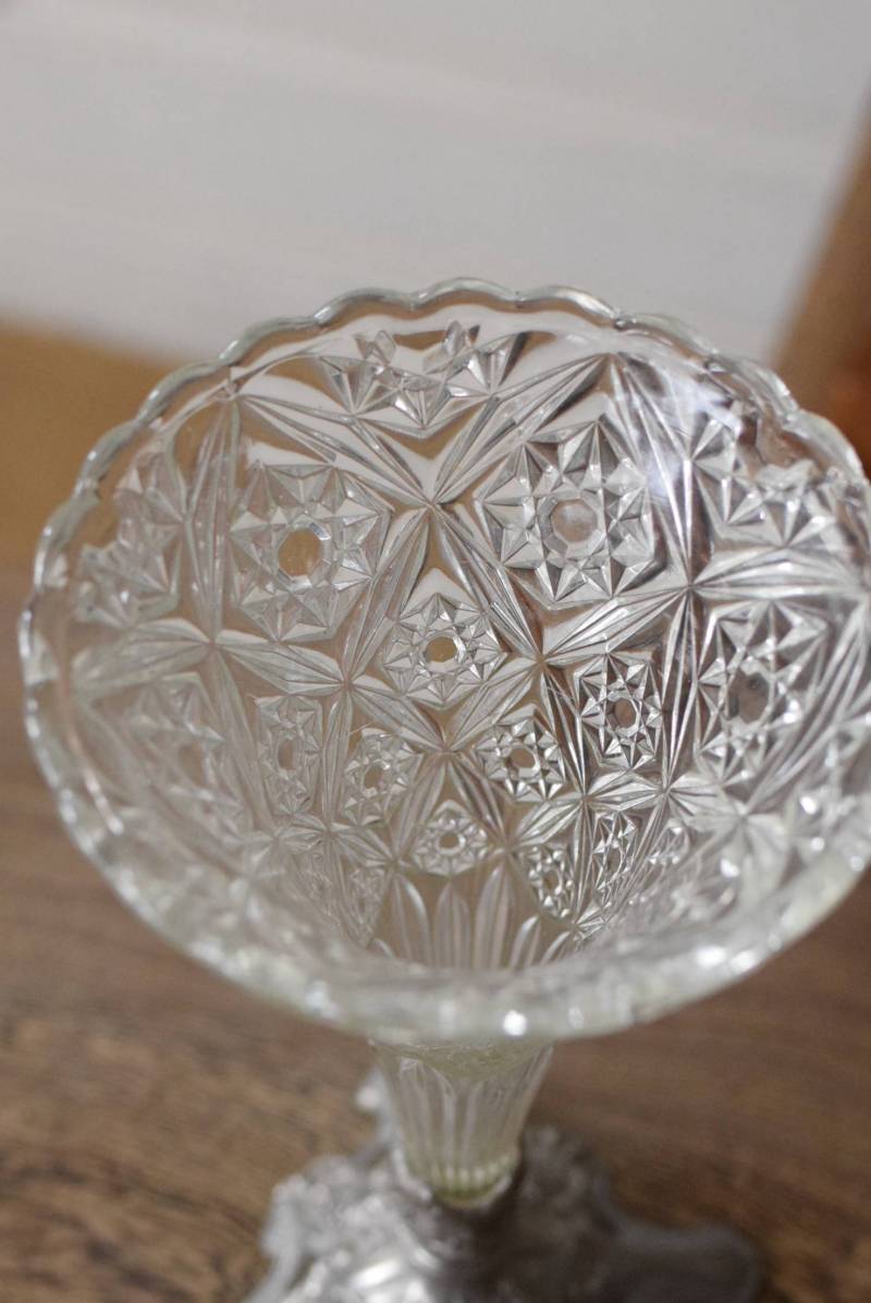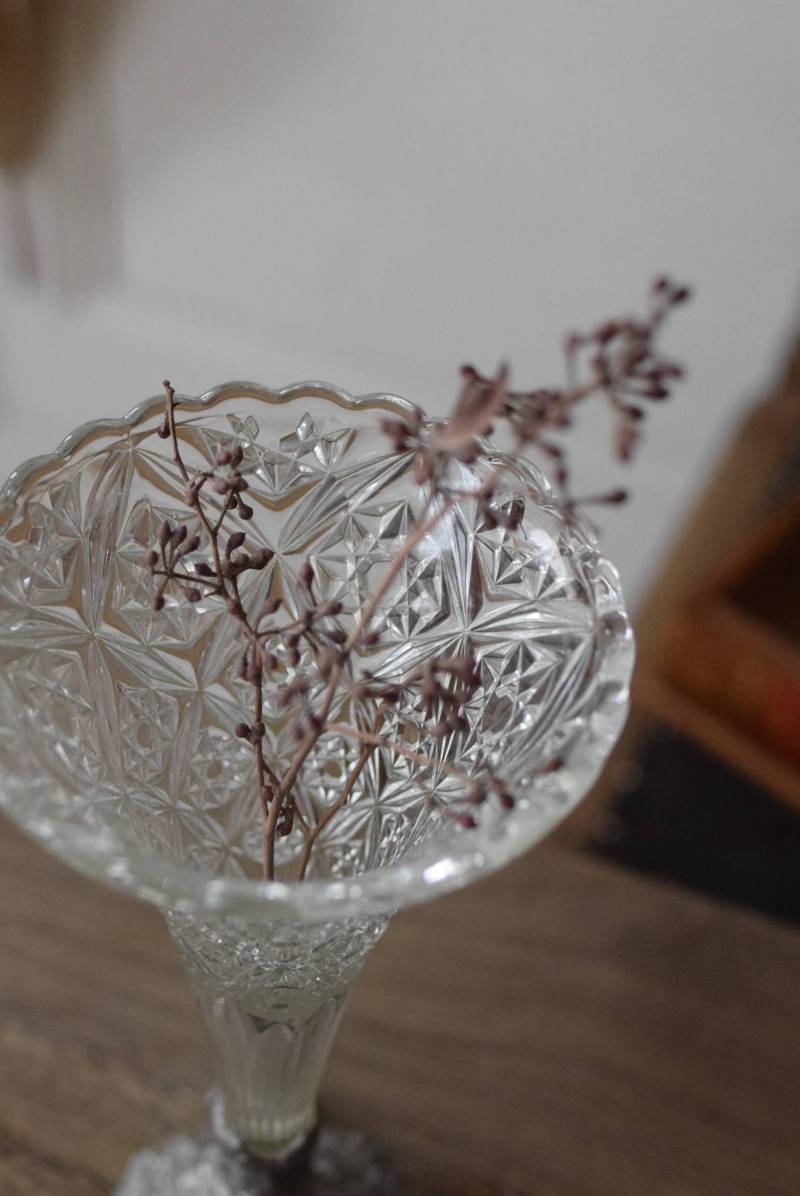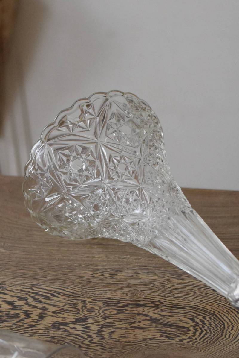 しとやかに咲いた花のようなフランスのフラワーベース。 キュッとくびれた土台からすらりと伸びたガラス部分には小花や雪の結晶を思わせるような,美しいカットが贅沢に施され、キラキラとした反射を見せてくれます。土台も同じく植物の息吹を感じさせるデザインで、繊細でありながらも、しっかりと踏ん張っているような姿が微笑ましいですね。 適度な高さがあるので、お花を飾っていない時もバランスよくディスプレイできます。もう一点同じデザインのものがあるので(フラワーベース.20B)ペアでのご使用もおすすめです。 直径 約12.5cm H 約27.5cm 土台 10.5×10.5cm